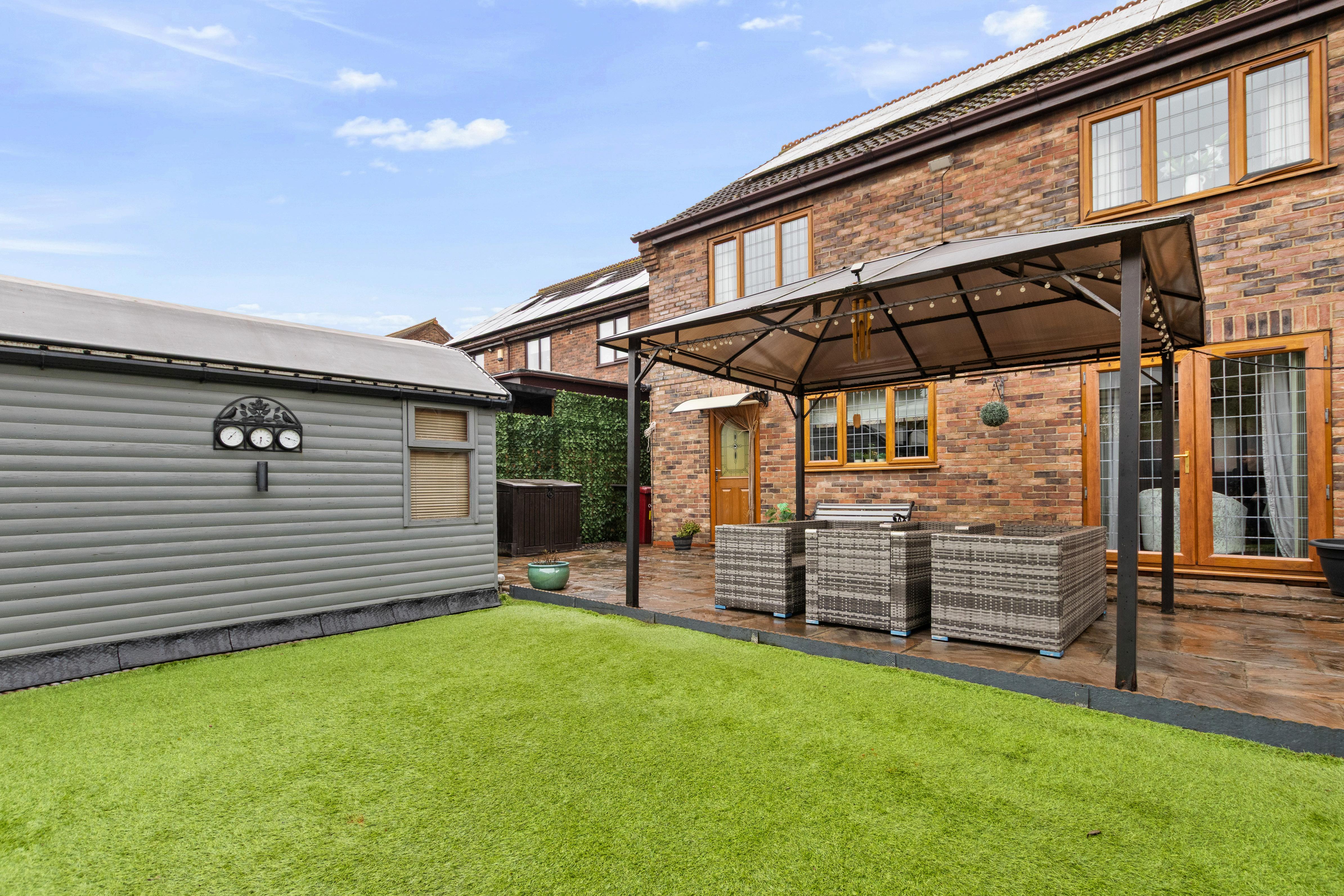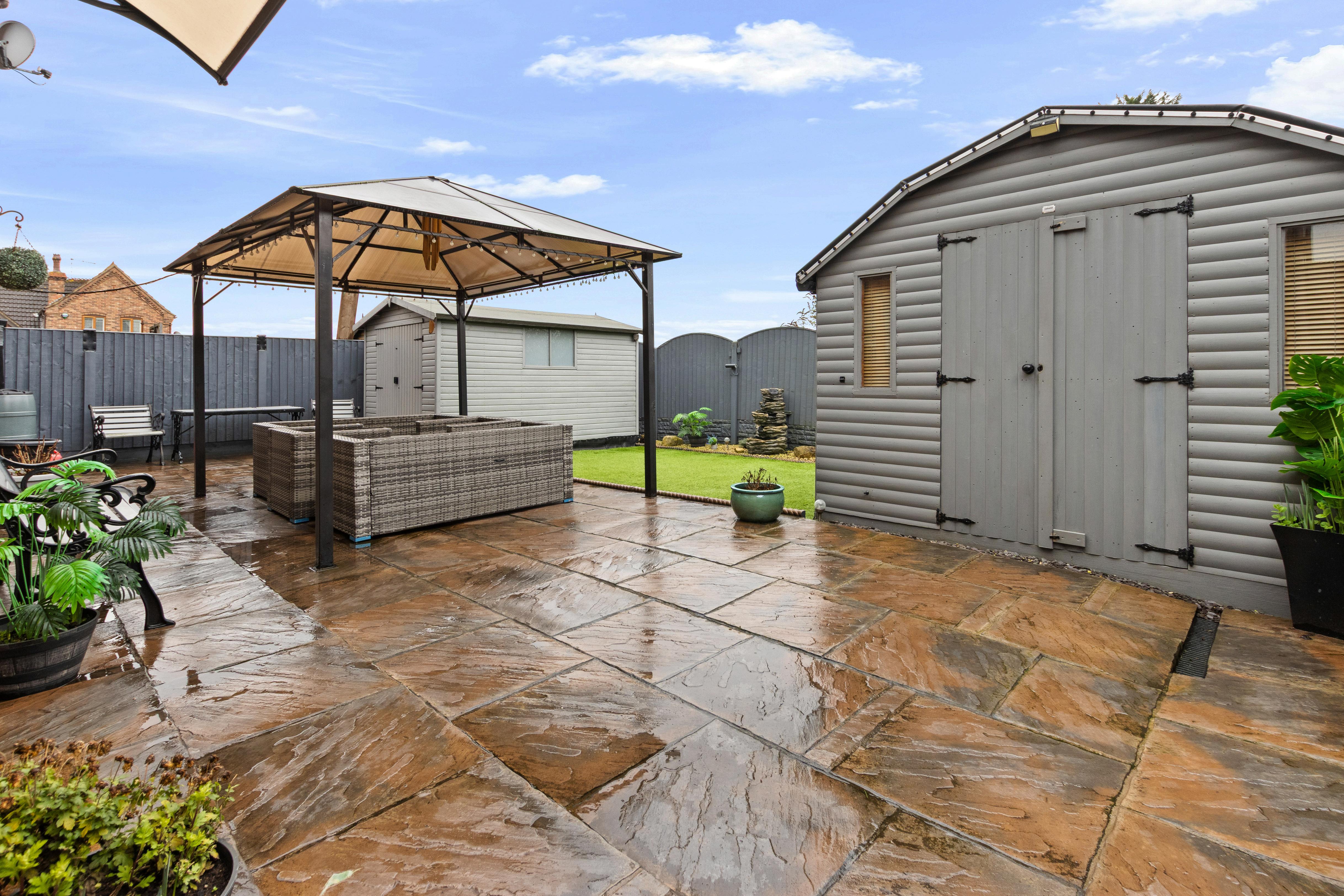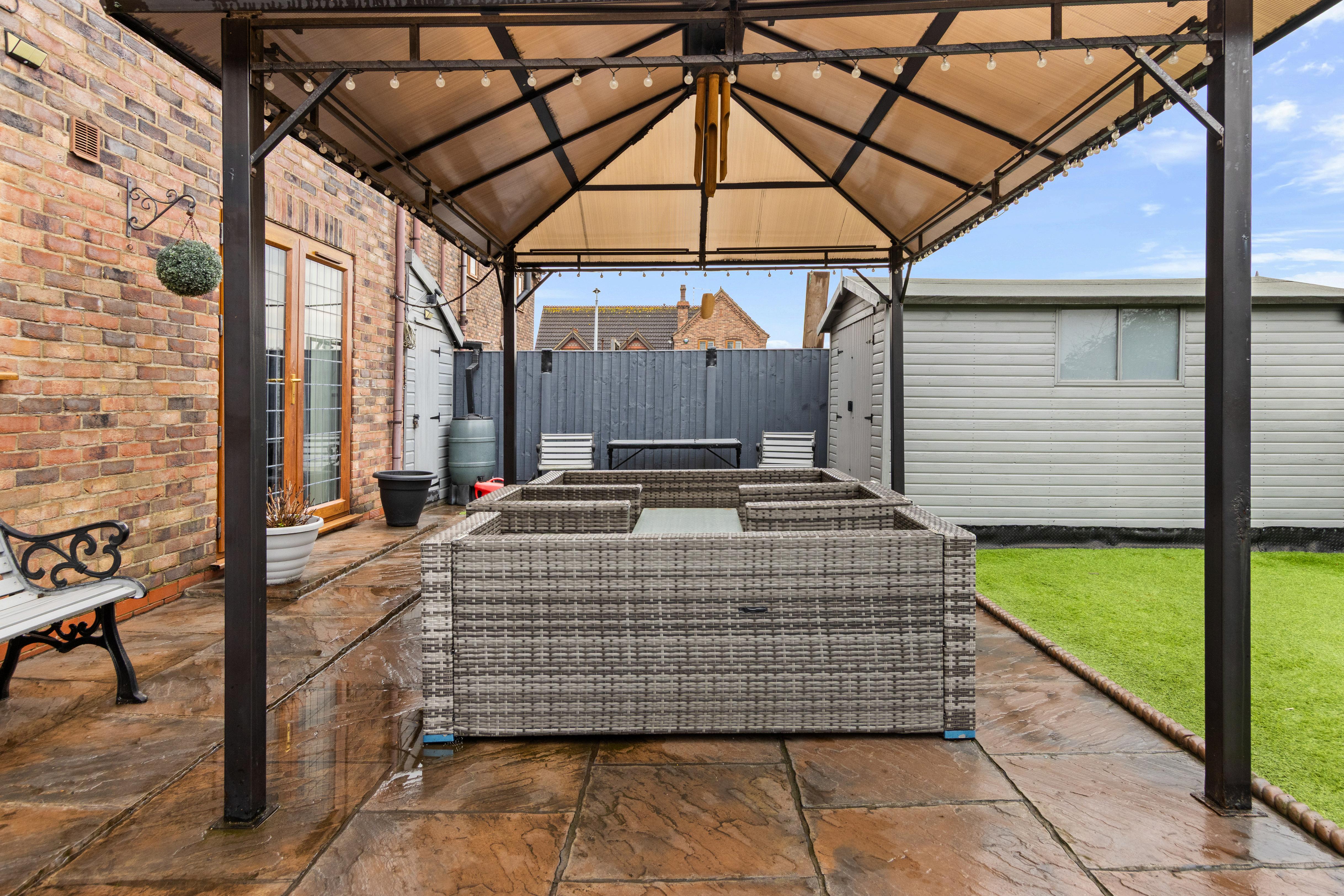 Stepping out from the dining room, you’re greeted by an impressive, expansive patio that creates a brilliant “all-weather” social space, with plenty of room for outdoor sofas, dining furniture and a BBQ setup. A covered seating area/gazebo adds that extra touch of comfort, making it just as suited to summer gatherings as it is to cosy evenings under festoon lights.
