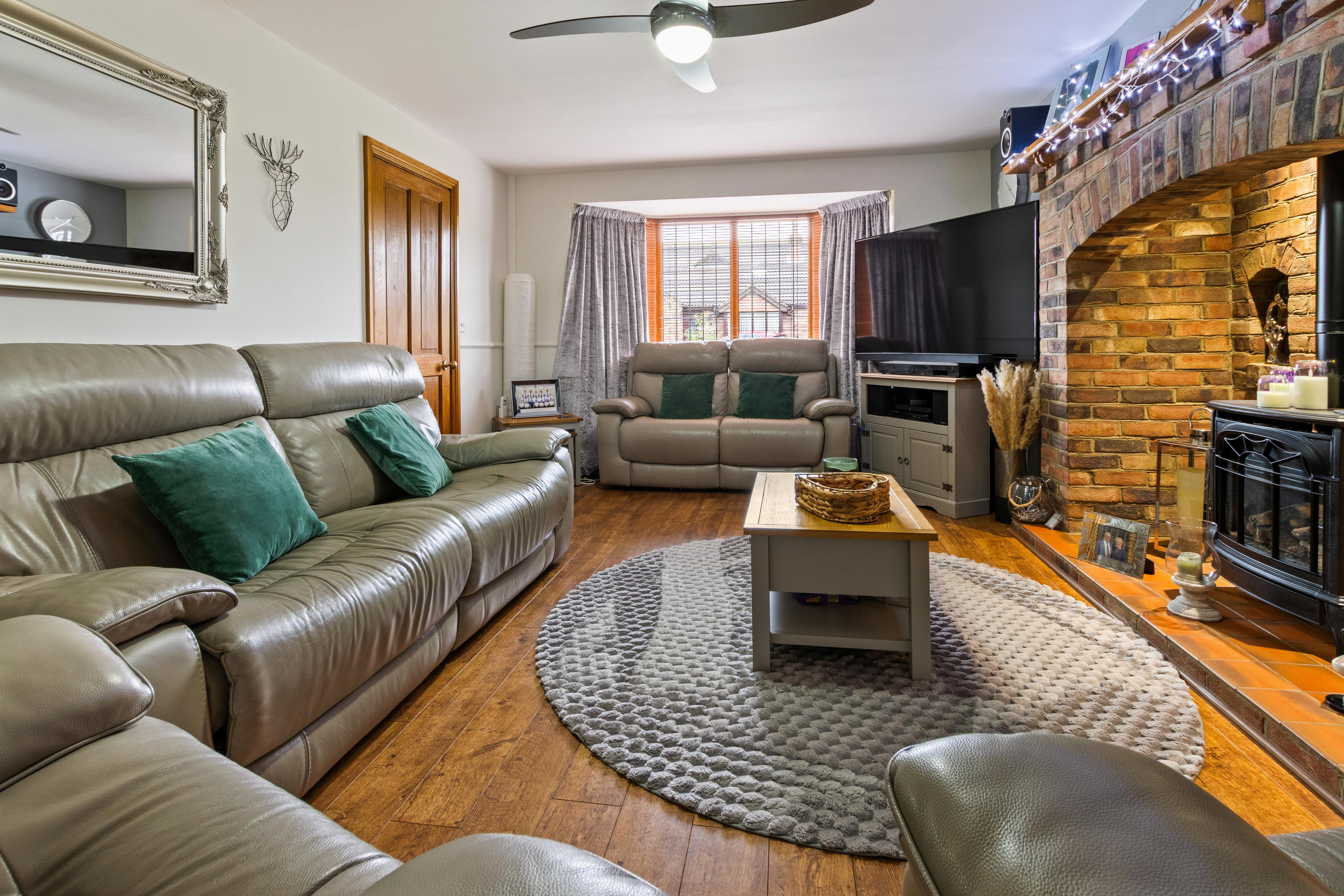 To the front, the main lounge is a superb family-sized room, centred around a striking brick inglenook-style fireplace with a multi-fuel stove sat on a tiled hearth, creating a brilliant focal point for cosy evenings in. A wide front window draws in plenty of natural light, while the proportions allow for generous seating without feeling crowded.