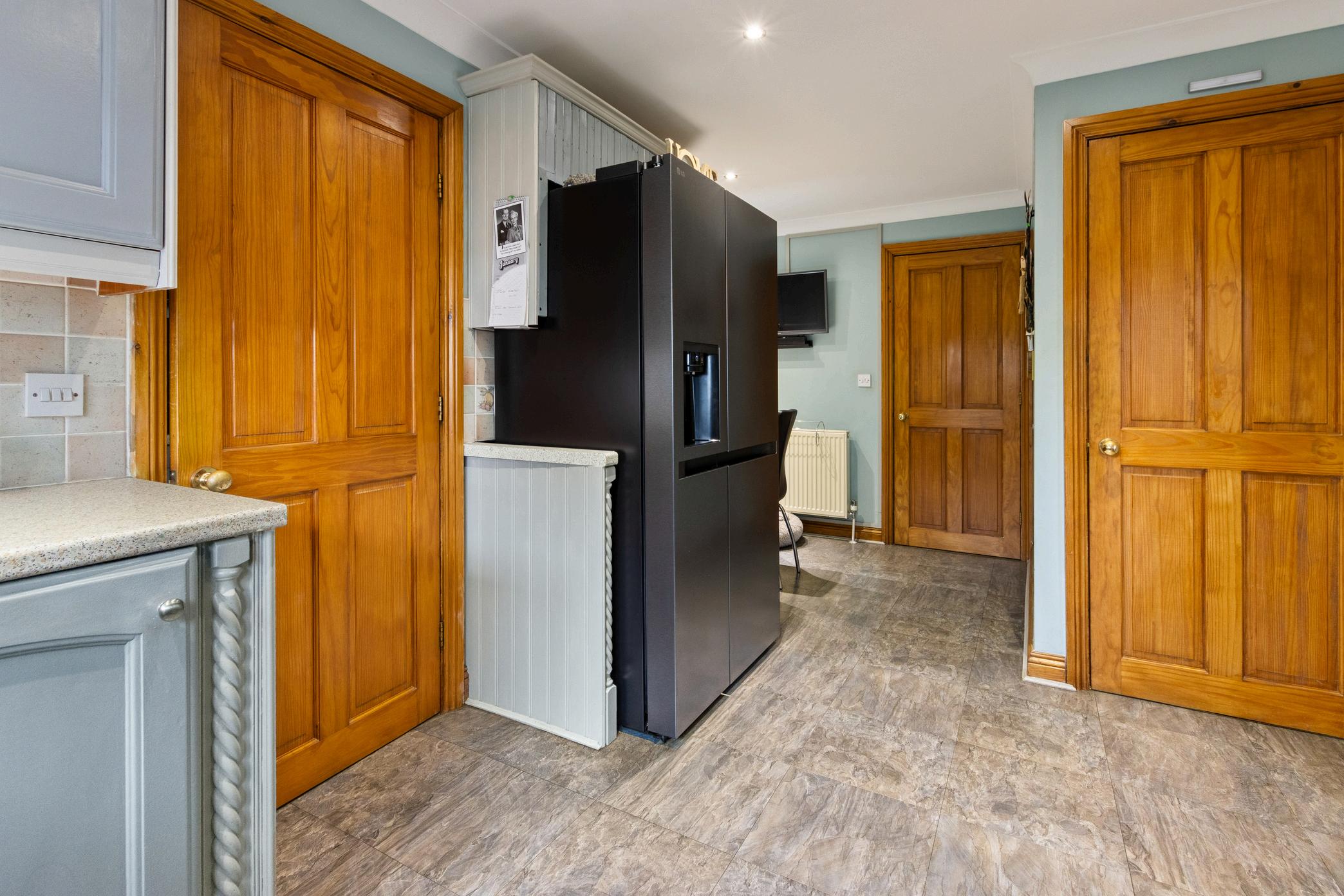 From the moment you step through the front door, it’s clear this is a home that was built with intention. The welcoming entrance hall sets the tone with wood-effect flooring, a timber staircase with turned balustrade, and a soft, neutral décor finished with dado rail detailing and warm wood trims.