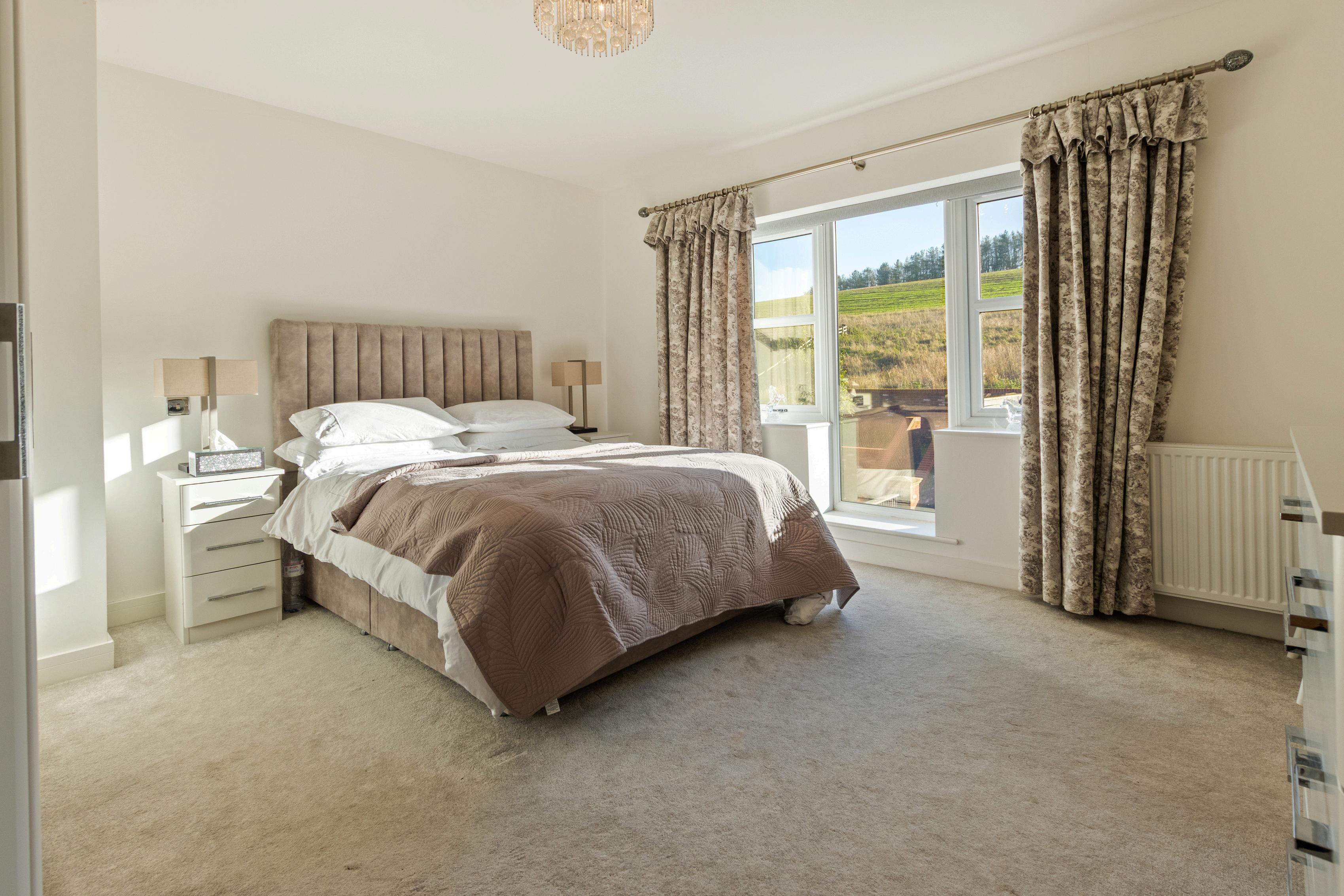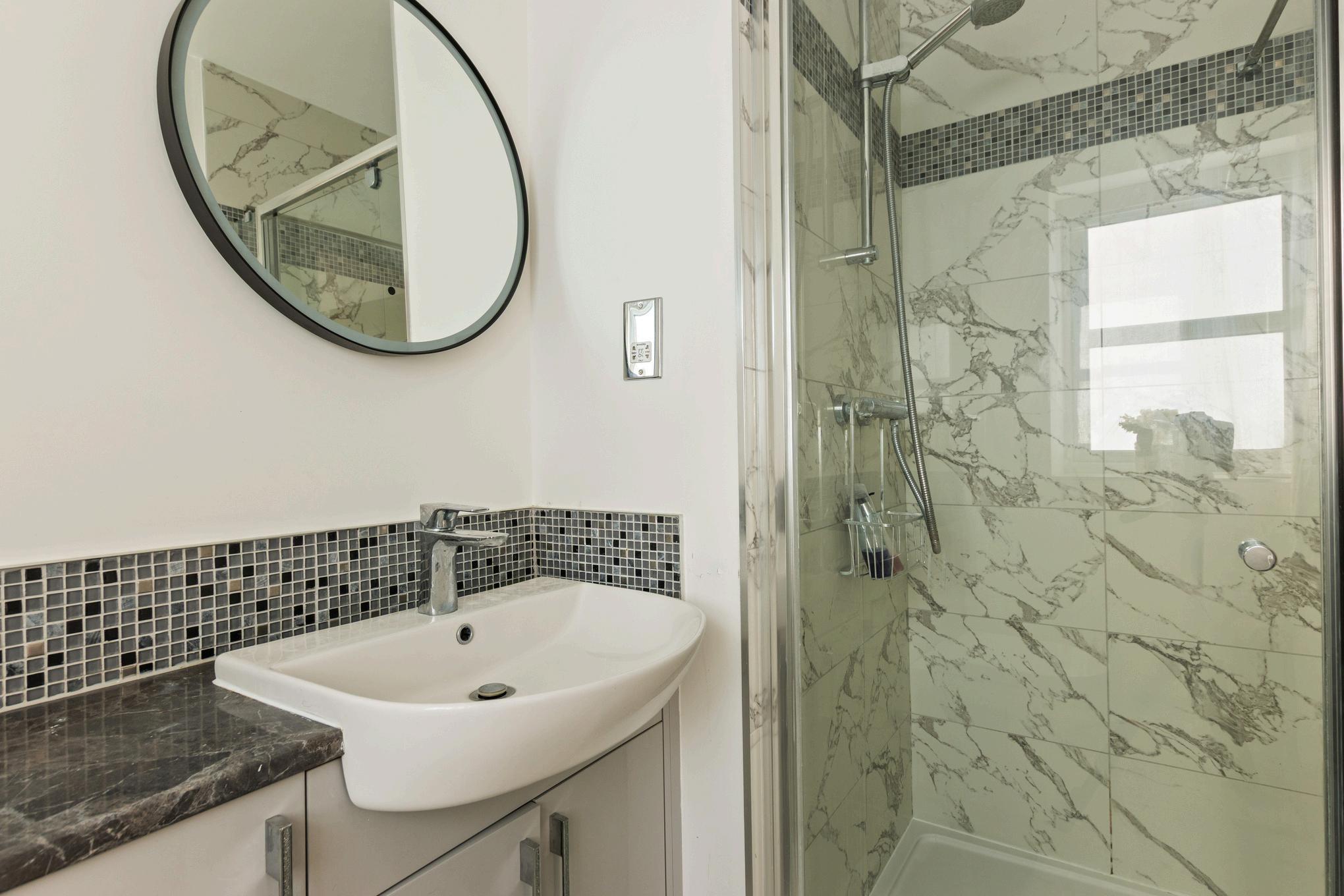 The principal bedroom features fitted furniture and a modern ensuite shower room with marble-style tiling to walls and floor, a vanity-housed WC and wash basin, and an illuminated mirror. An adjoining door leads to another bedroom a flexible arrangement installed by the current
