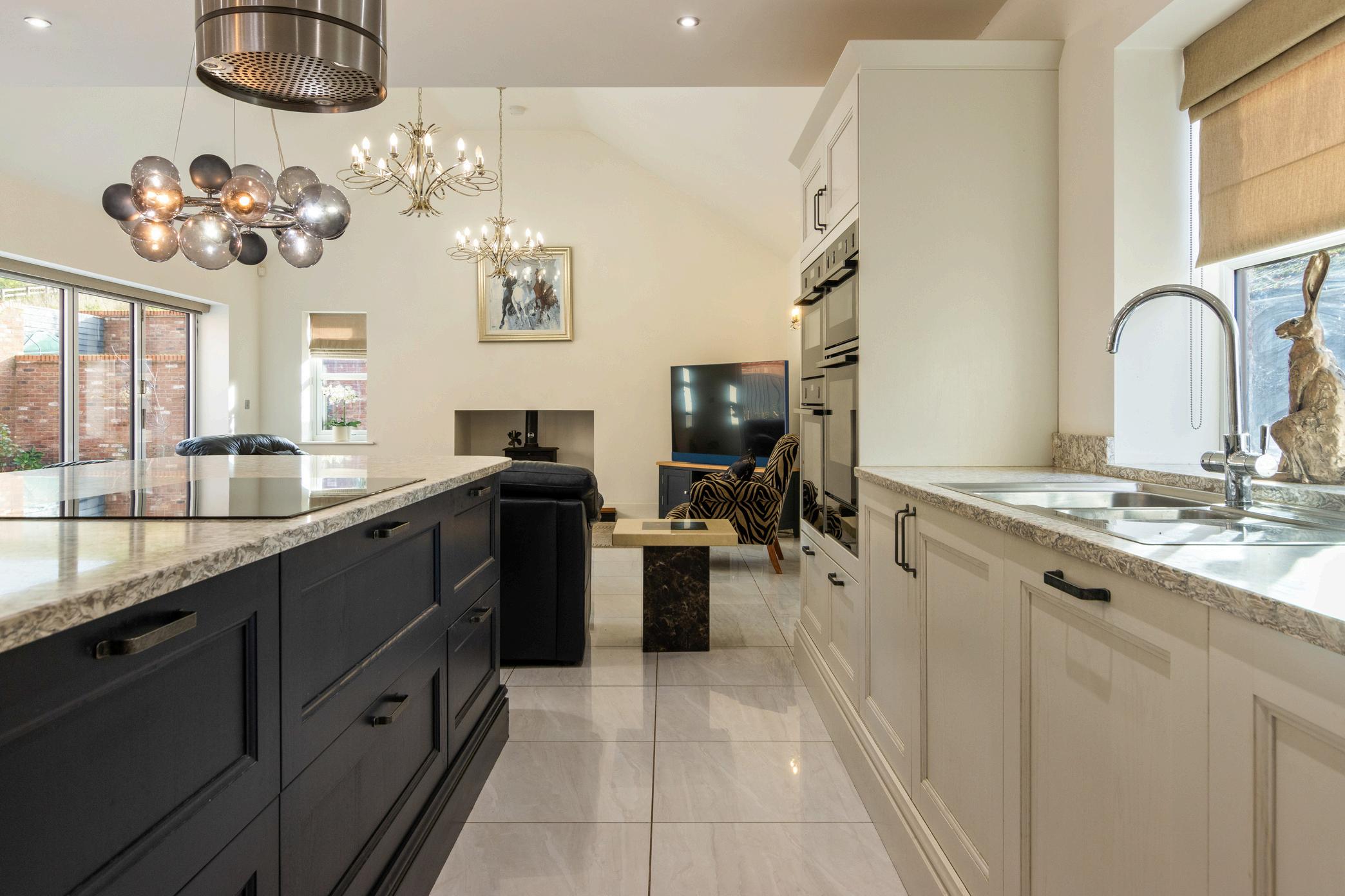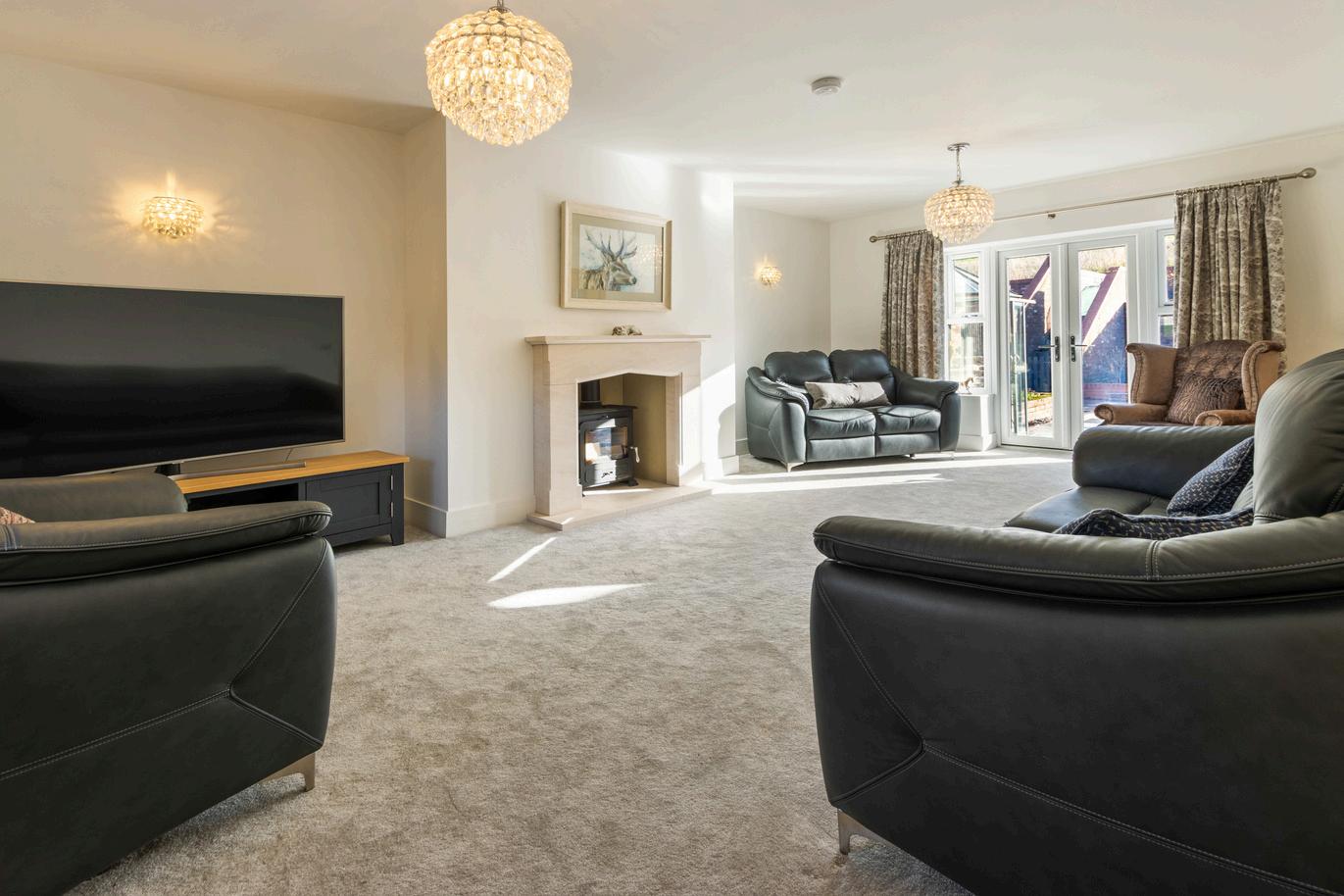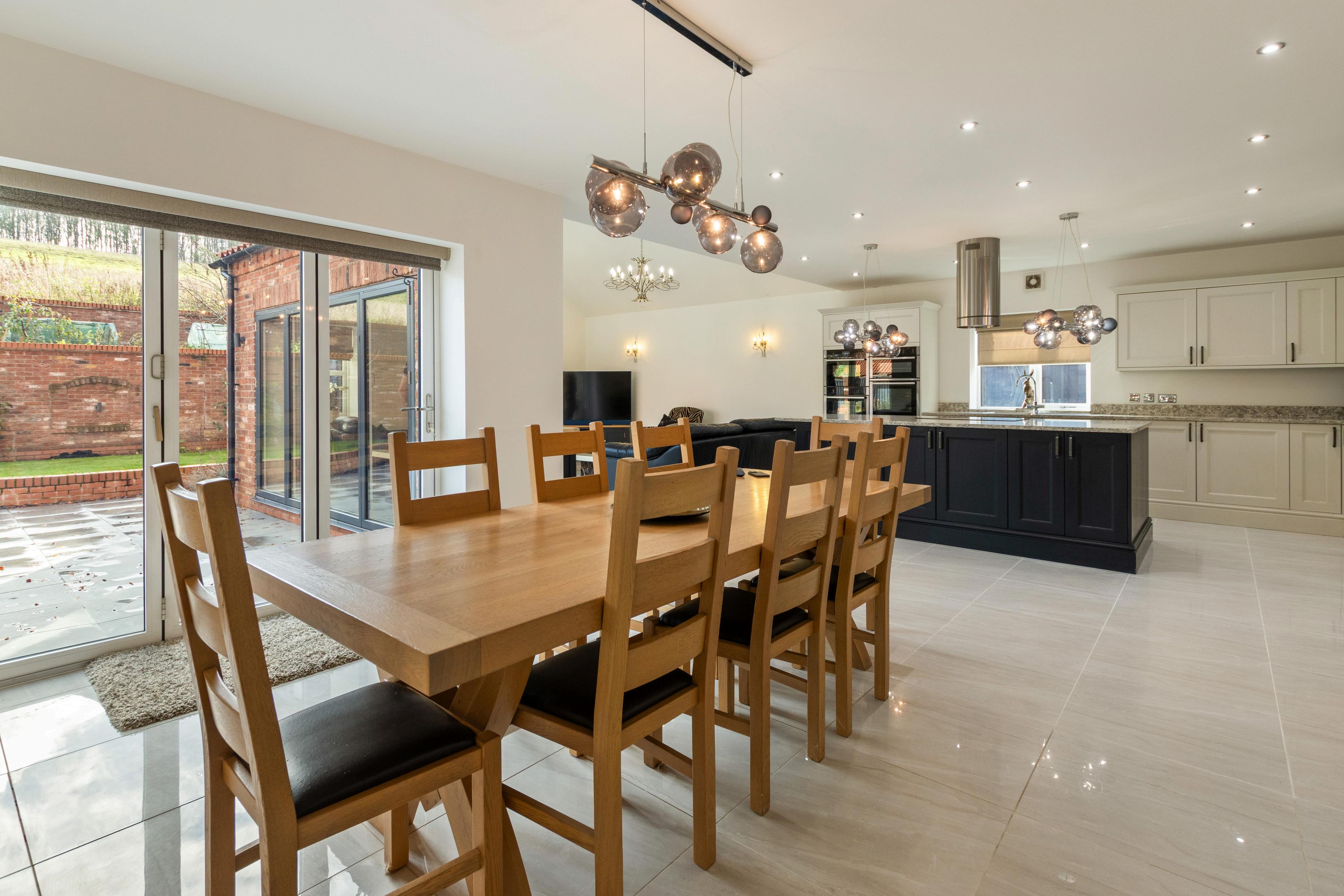 while the large sitting area within the kitchen boasts a vaulted ceiling, twin ceiling lights, a recessed wood burner, and yet another set of bi-fold doors to the patio creating a bright, relaxing environment with seamless indoor-outdoor living.