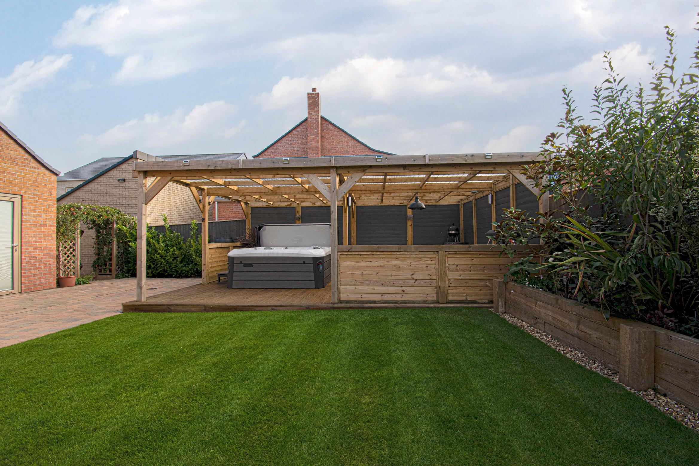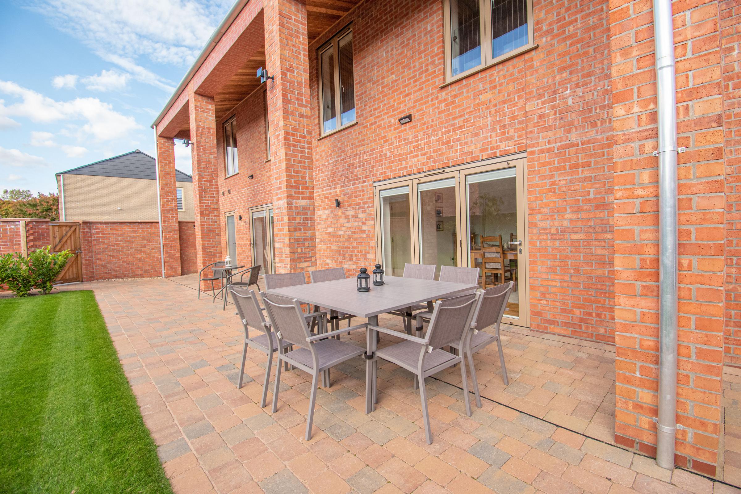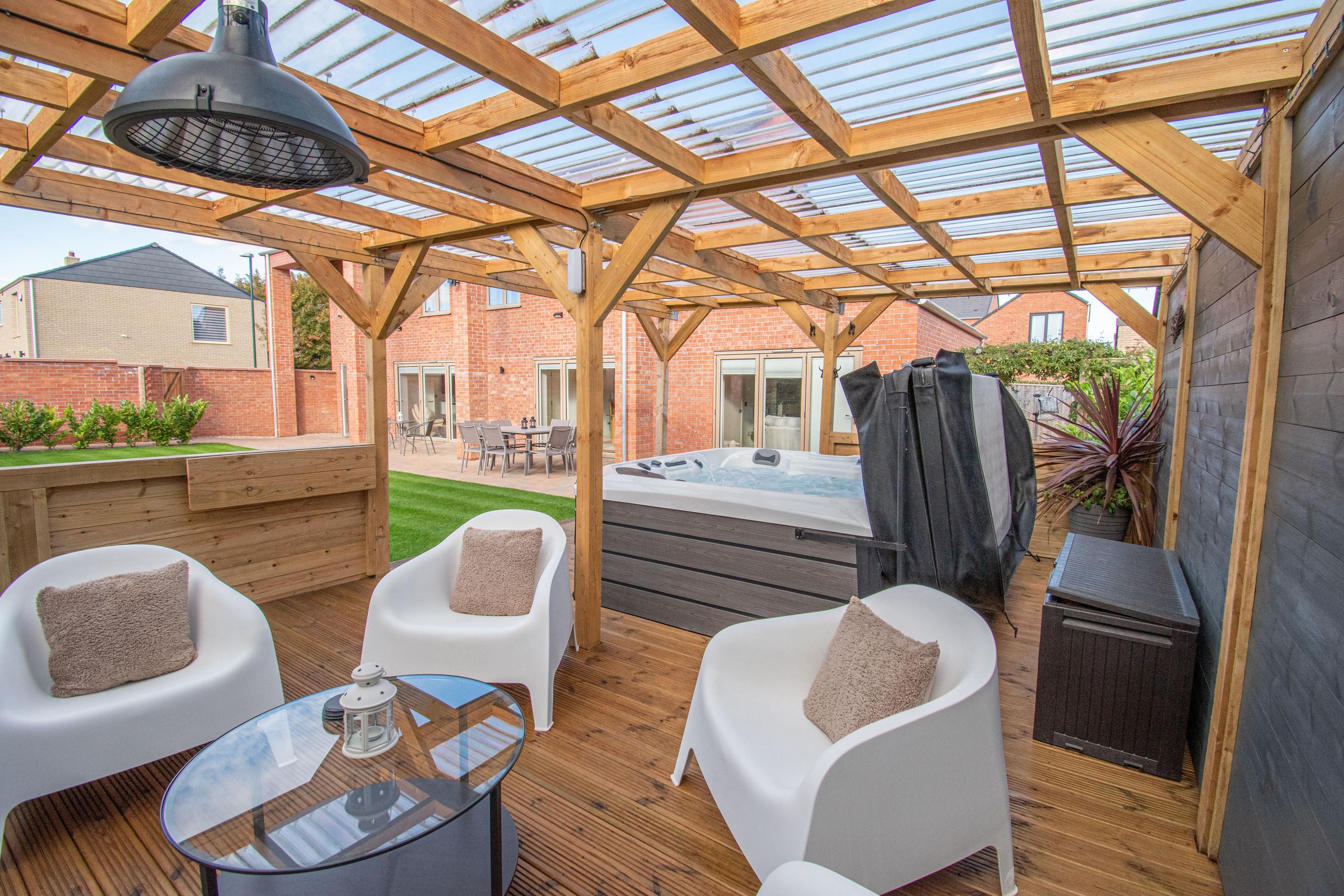 Arranged to the side aspect is an enclosed family garden which has a cobble style block paved patio which runs across the length of the property accessed from the three sets of bifolding doors and the utility. The patio is partially covered and looks over a beautifully landscaped garden with established borders. To the side of the lawn is a decked area with a wooden and polycarbonate pergola covered canopy there is an area with electrics for a hot tub and a spacious seating area with lighting.