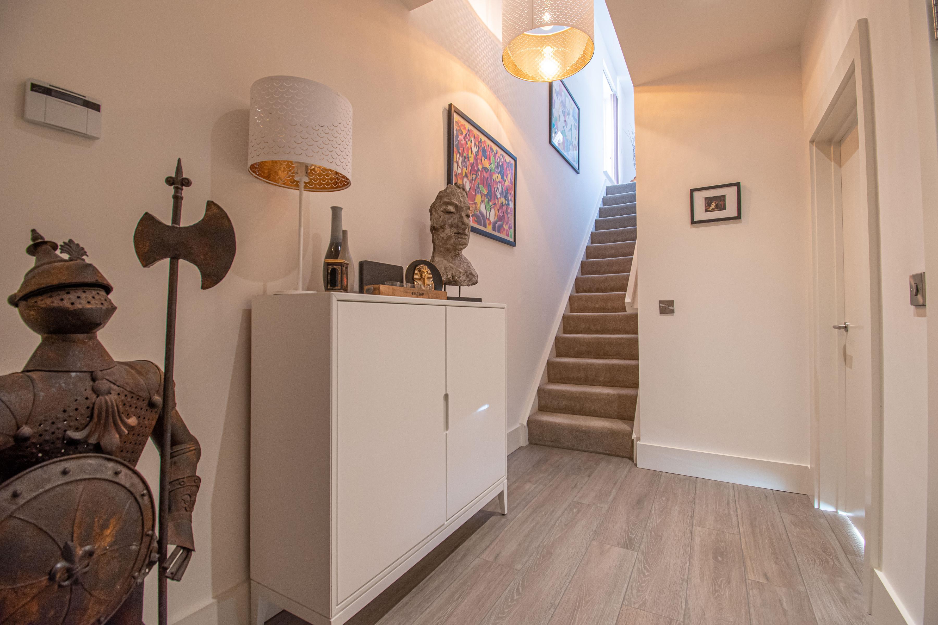 Amodernaluminiumentrancedooropensintothehallwithacloakroomfittedwithatwo-piece suiteandstaircasetothefirstfloor.Adooropensintothekitchenfromthehall.