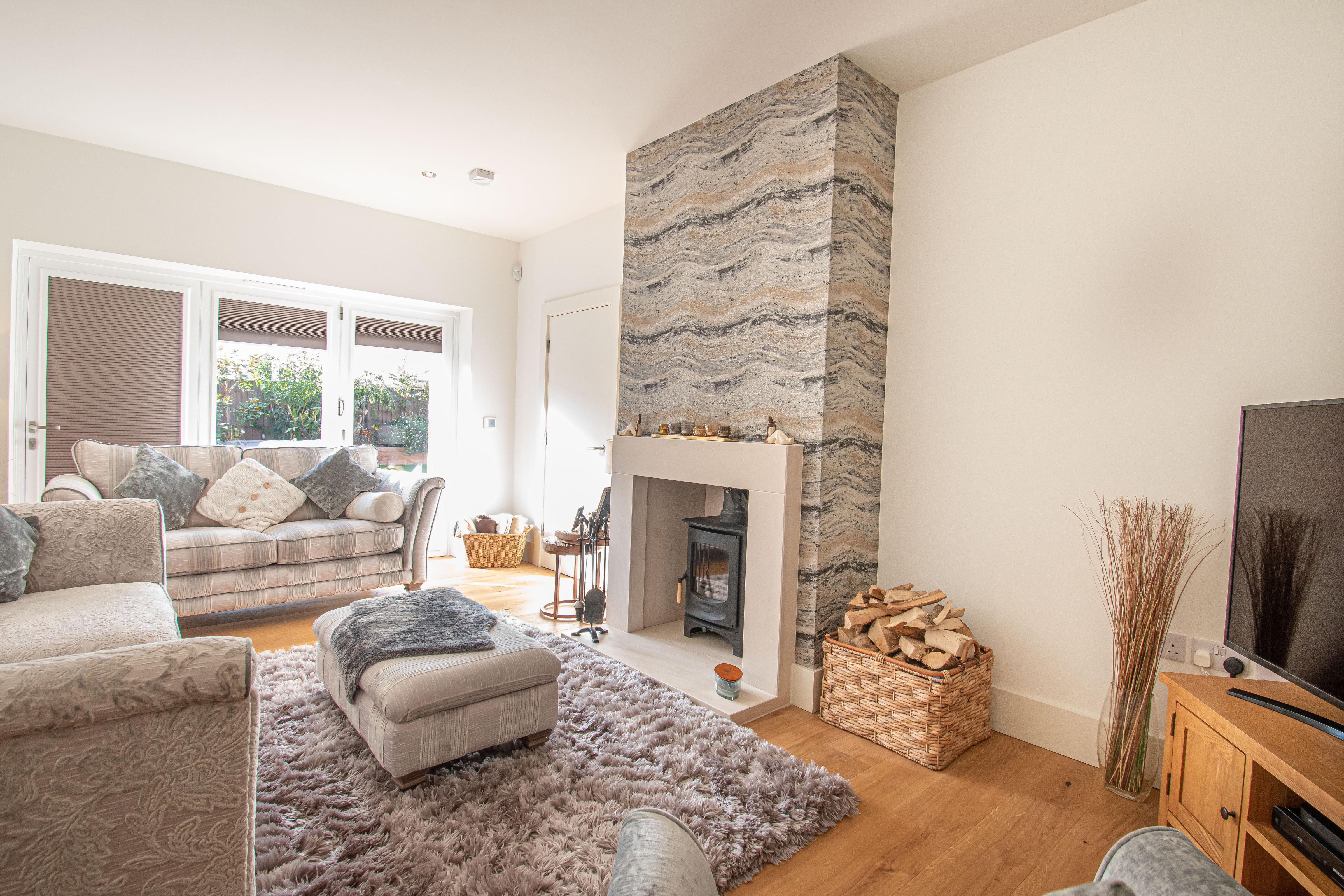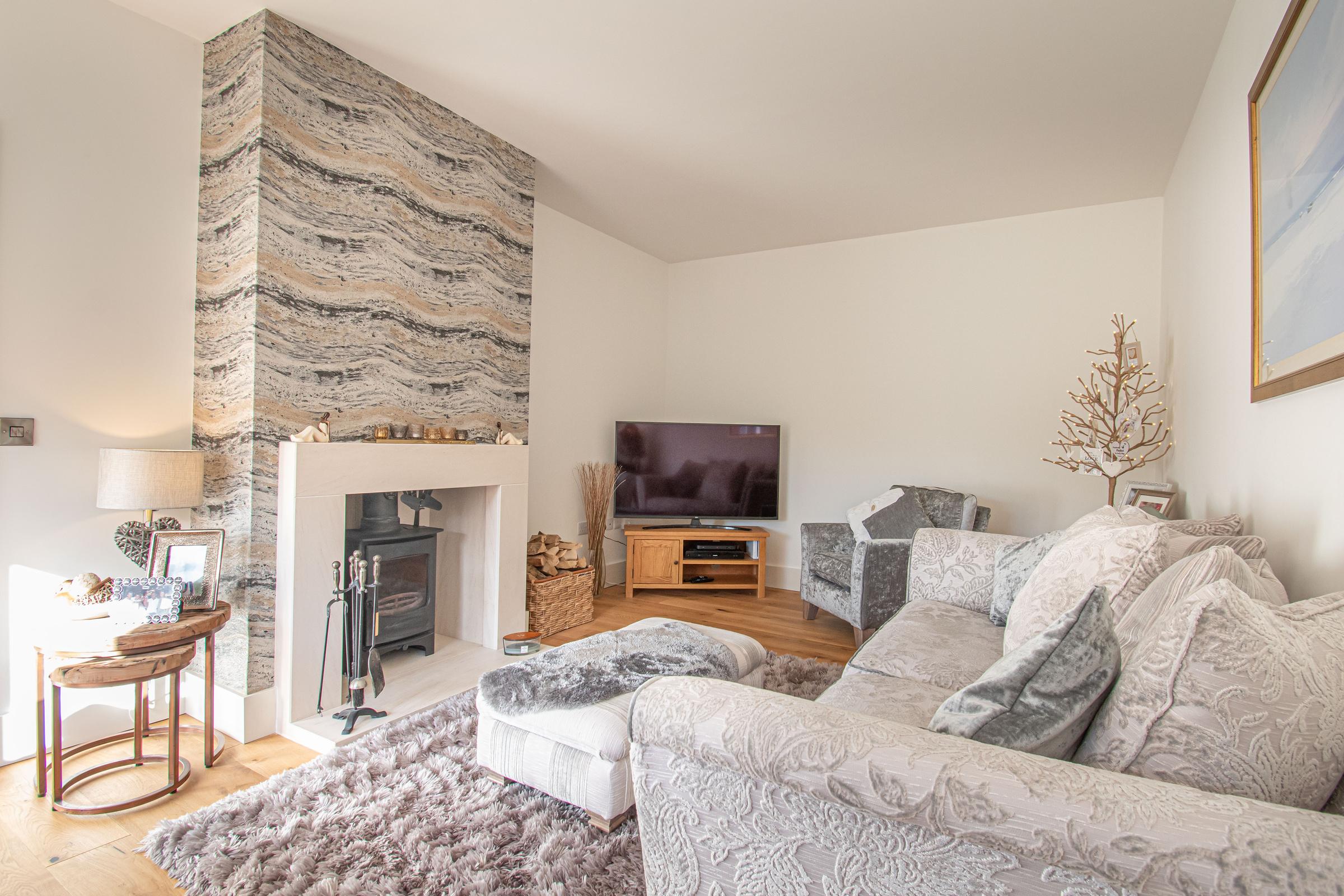 Thesophisticatedsittingroomisbothmodernandstylishsetaroundastonefireplacewithwood burningstoveperfectinthecoolerseasonswhilstthebi-foldingdoorsmirrortheothersidefacing roomsopeningtothepatio.