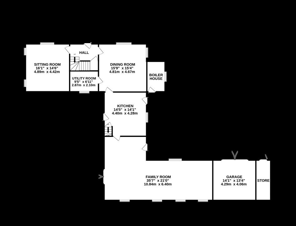Note There is a public footpath down the drive to the path in the side garden which then continues to a path outside the fenced boundary of the rear garden. This path is on part of the property’s land for which the vendor has taken advic establish this new pathway for the public footpath in order to provide a redirection of route of the original footpath across the lawned garden to exit to continue across the neighbour’s land.