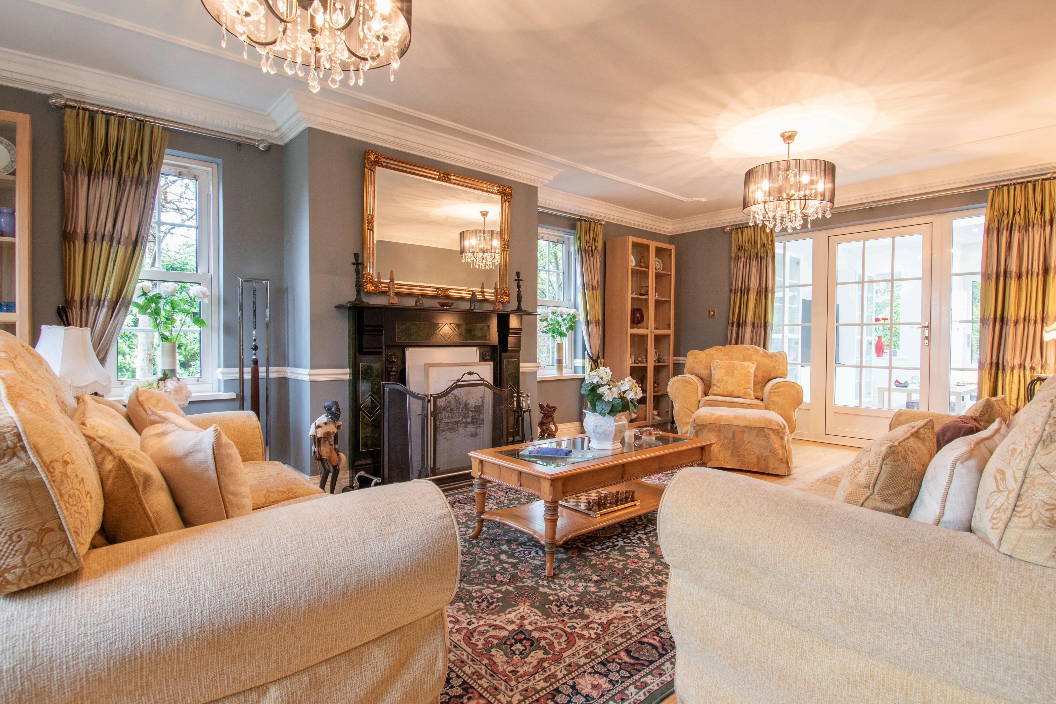 A Georgian styled entrance door opens into a central reception hall with spindled return staircase to the first floor and a conveniently positioned cloakroom which has a two-piece suite. The forwardfacing sophisticated lounge is set around a period style fireplace with glazed door into the orangery, which has been added by the current owner. The second spacious reception room is currently used as a sitting room which the owners refer to as the Media Room where they enjoy relaxing and listening to music. An excellent home study is finished with Wainscot styled panelling where there is ample space for two desks. Also approached from the hall is a large walk-in pantry.