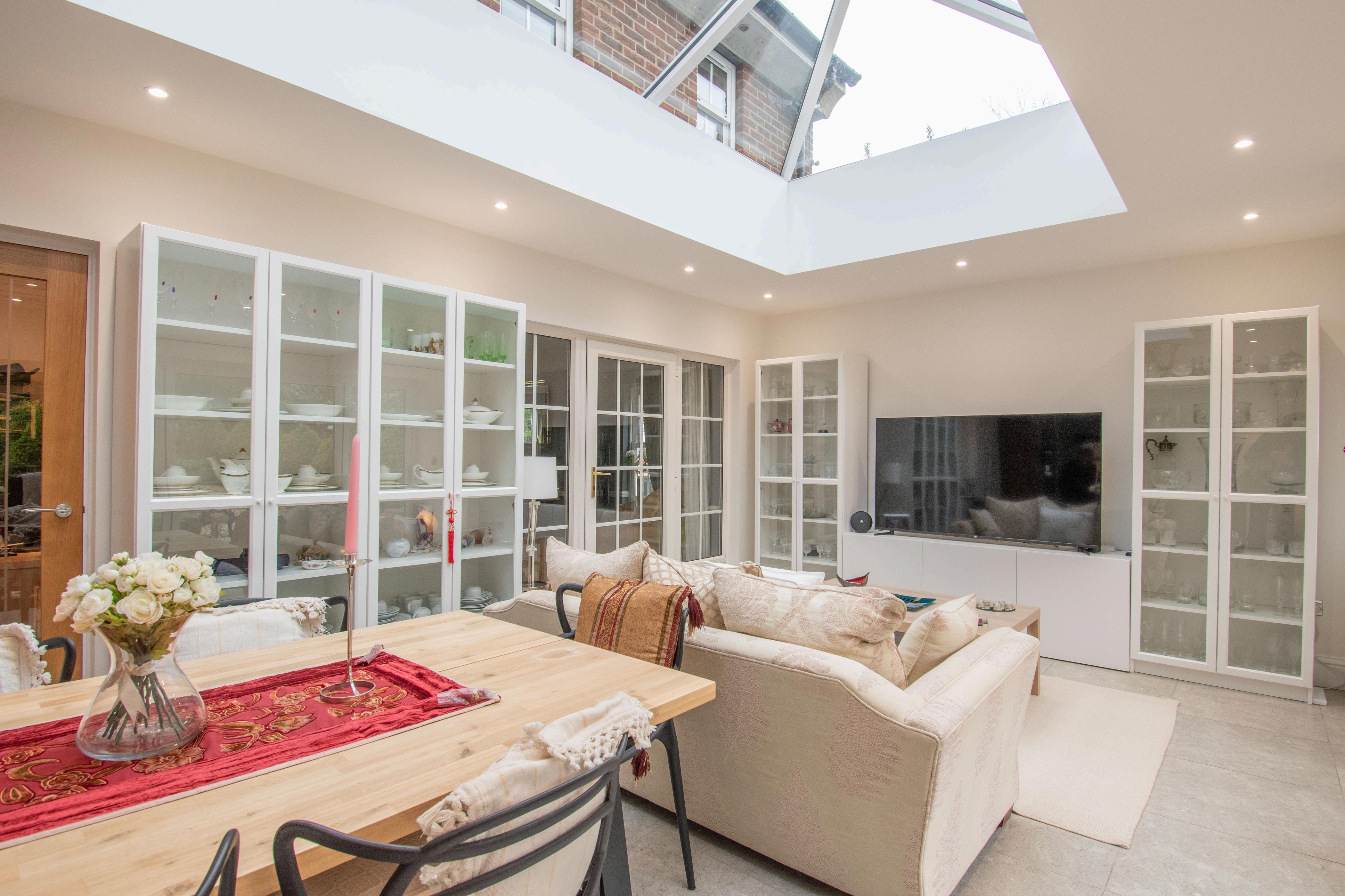The kitchen flows seamlessly into the stunning orangery which has been recently added by the current owners. This special space has substantial seating, entertaining and dining areas. Overhead there is a large ceiling lantern which allows for natural light to cascade throughout the room. Bi-folding doors allow a seamless flow to the outside space for indoor/outdoor living.