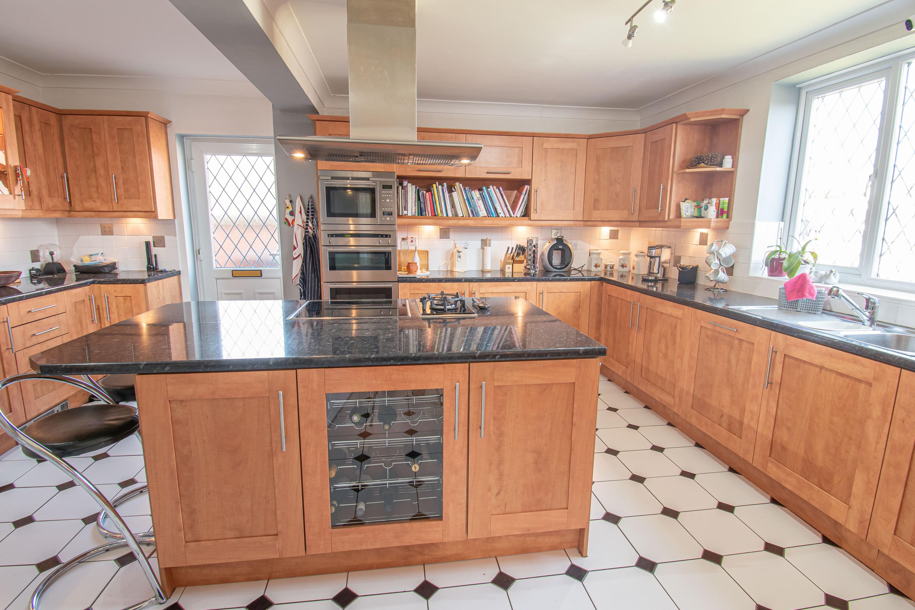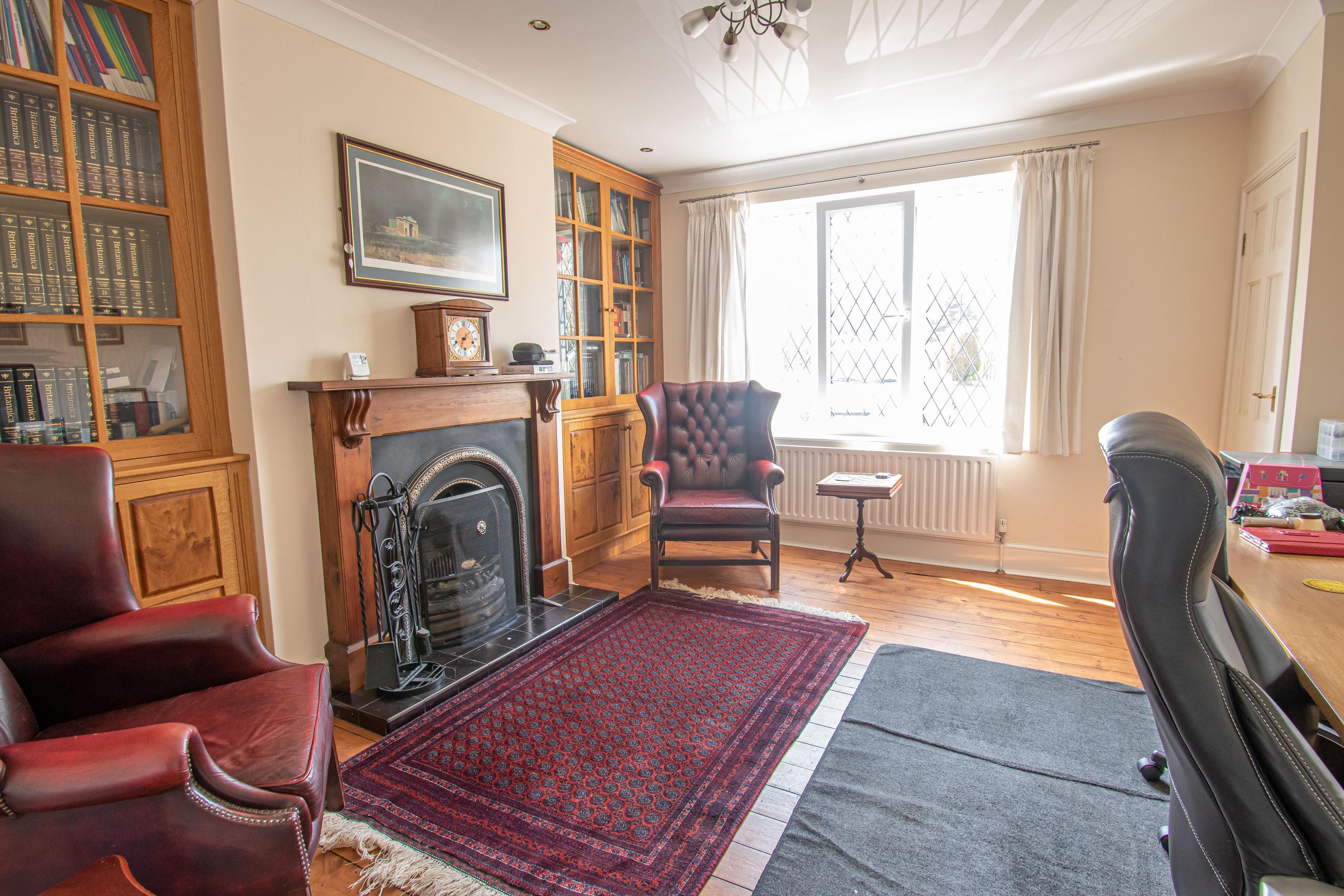 The lounge has doors to the annex and into the spacious kitchen extensively fitted with a range of wood veneered cabinets to include a centre Island and range of integrated appliances with half glazed entrance door to the side aspect. A large practical utility leads from the kitchen with laundry and cloakroom which has a door to a forward-facing home study set around a period style fireplace with deep storage cupboard.