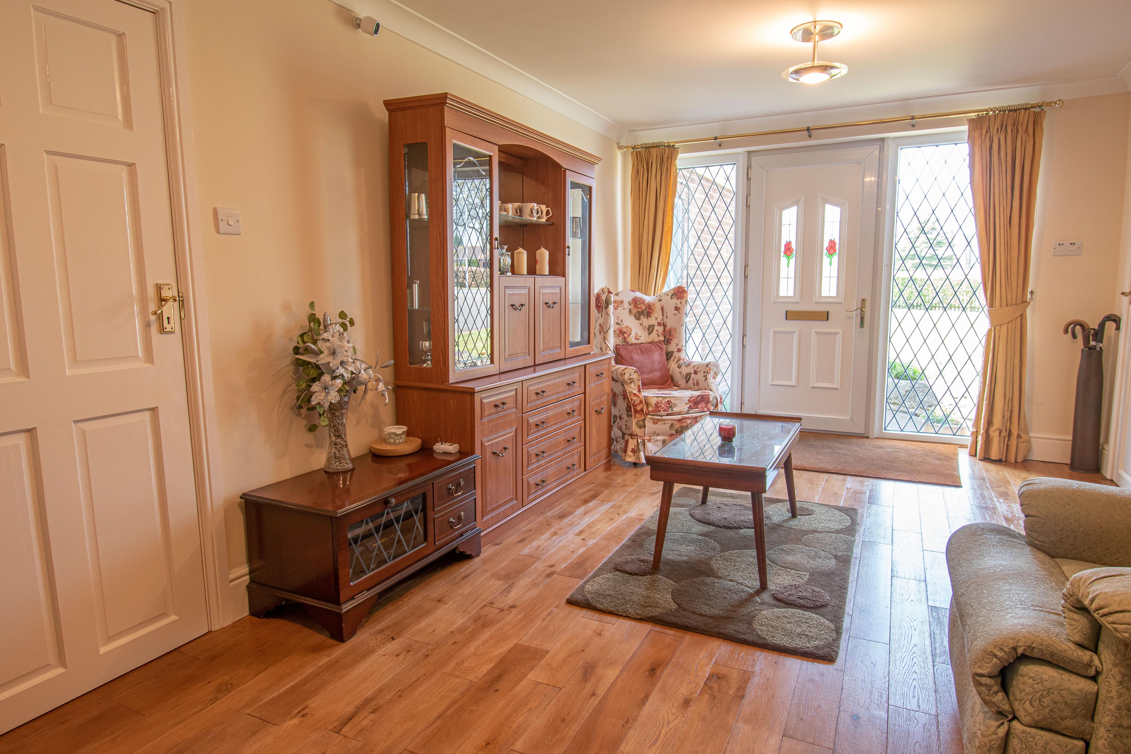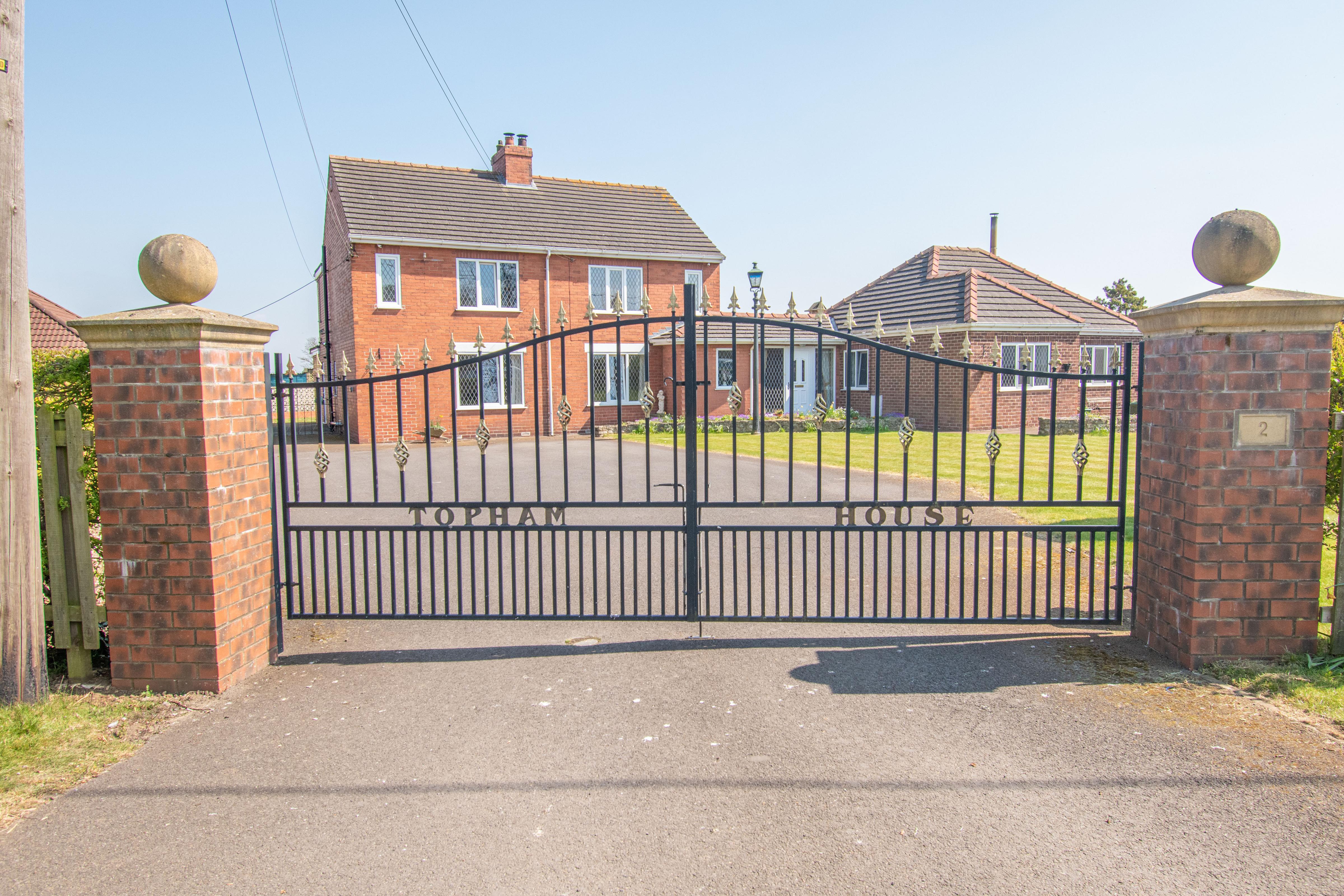 Set beyond a gated entrance with a deep lawned front garden the drive opens to a path accessing the formal entrance of the house.