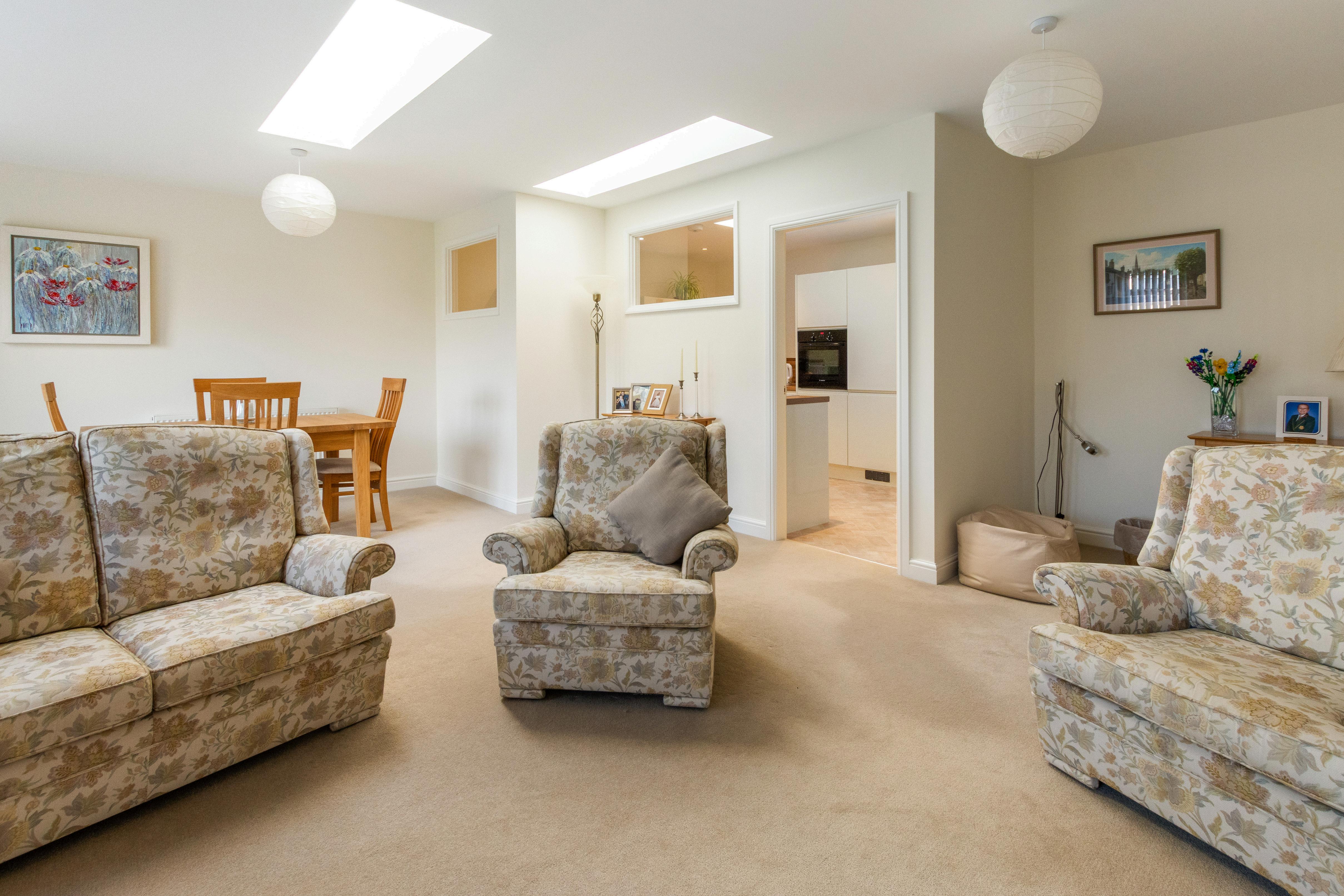 At the heart of the home is a spacious open-plan living area, perfect for both everyday life and entertaining. Flooded with natural light, this welcoming space features doors opening directly onto the garden, creating a seamless connection between indoor and outdoor living.