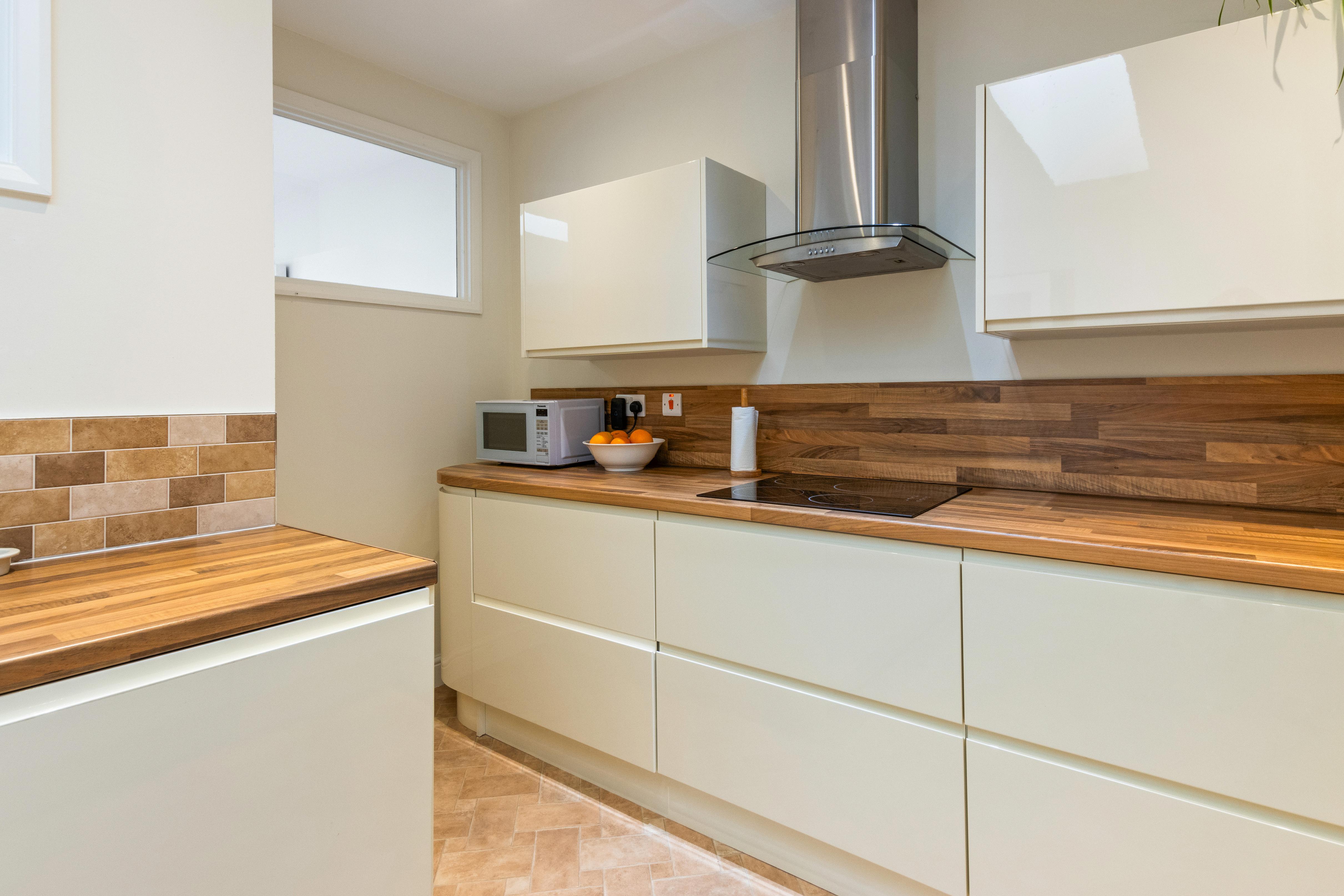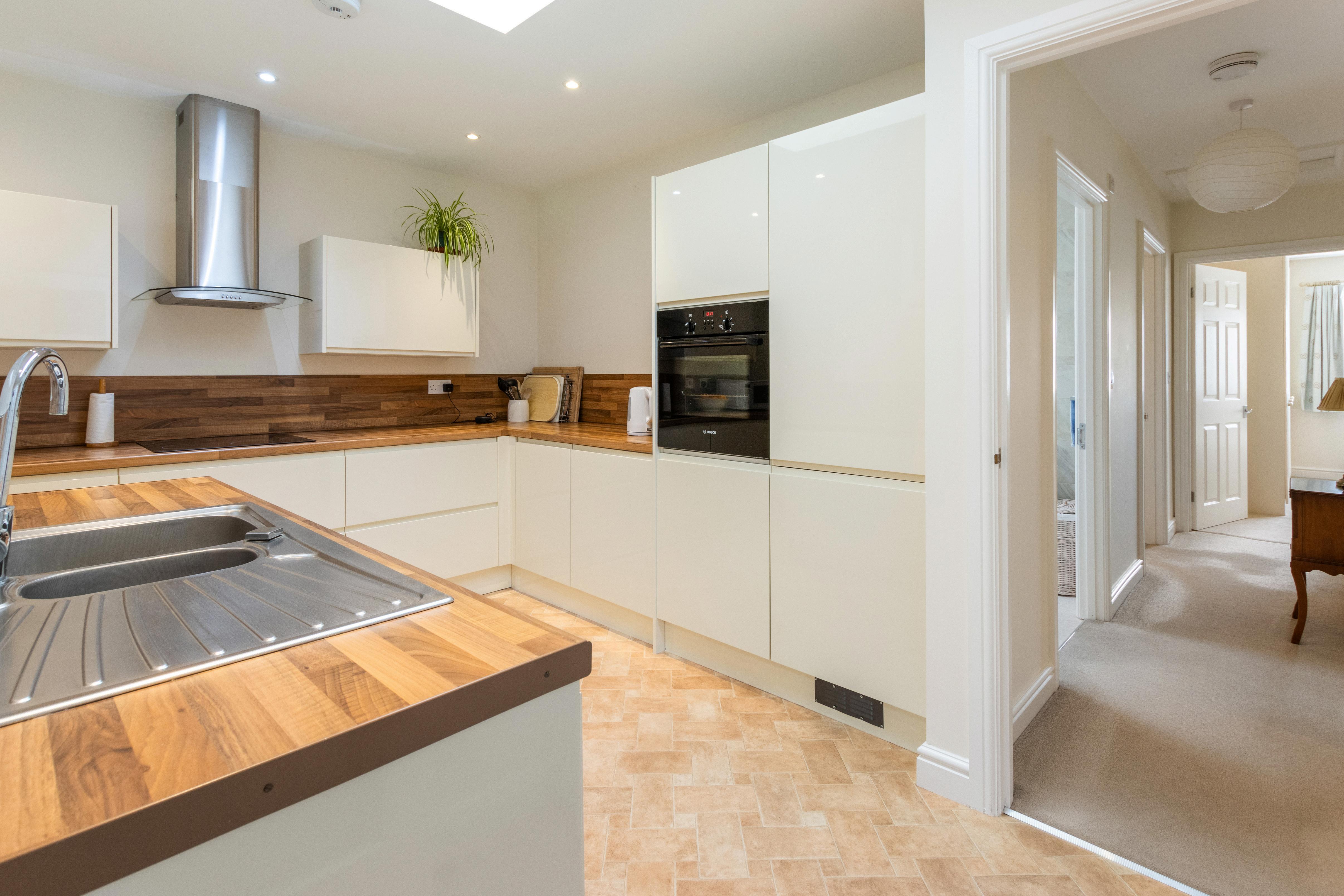 The modern kitchen is fitted with sleek units and a range of built-in appliances, offering both style and functionality for keen cooks and busy households alike.
