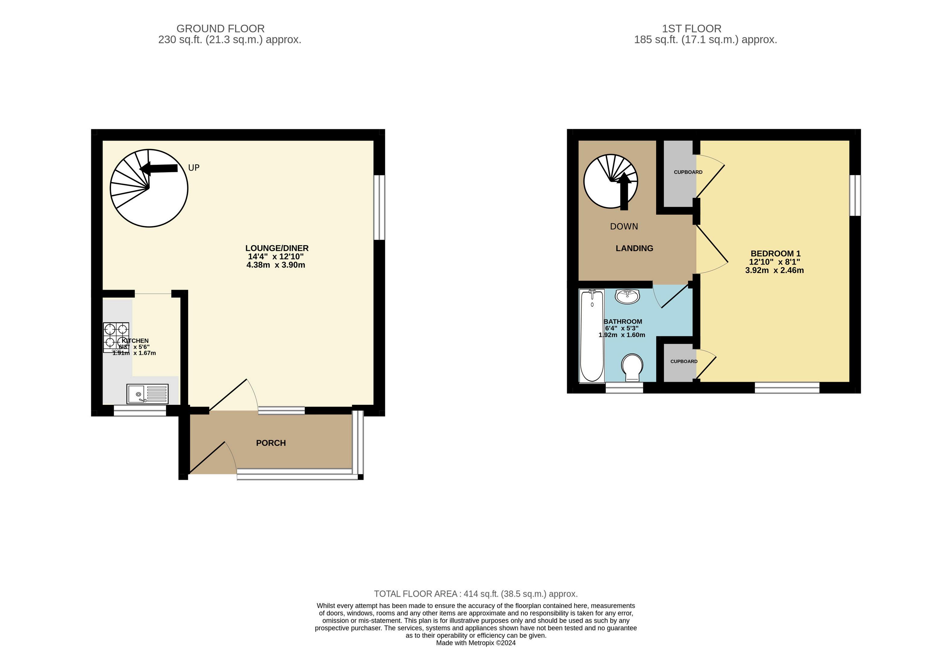 Step into a welcoming ground floor porch that leads into the deceptively spacious lounge/diner and offers a decorative spiral staircase leading to the first floor. Adjoining the lounge is the fitted kitchen that benefits from a range of base and wall-mounted cabinets, a stainless-steel sink, and an oven and hob that is complimented with an extractor fan above.