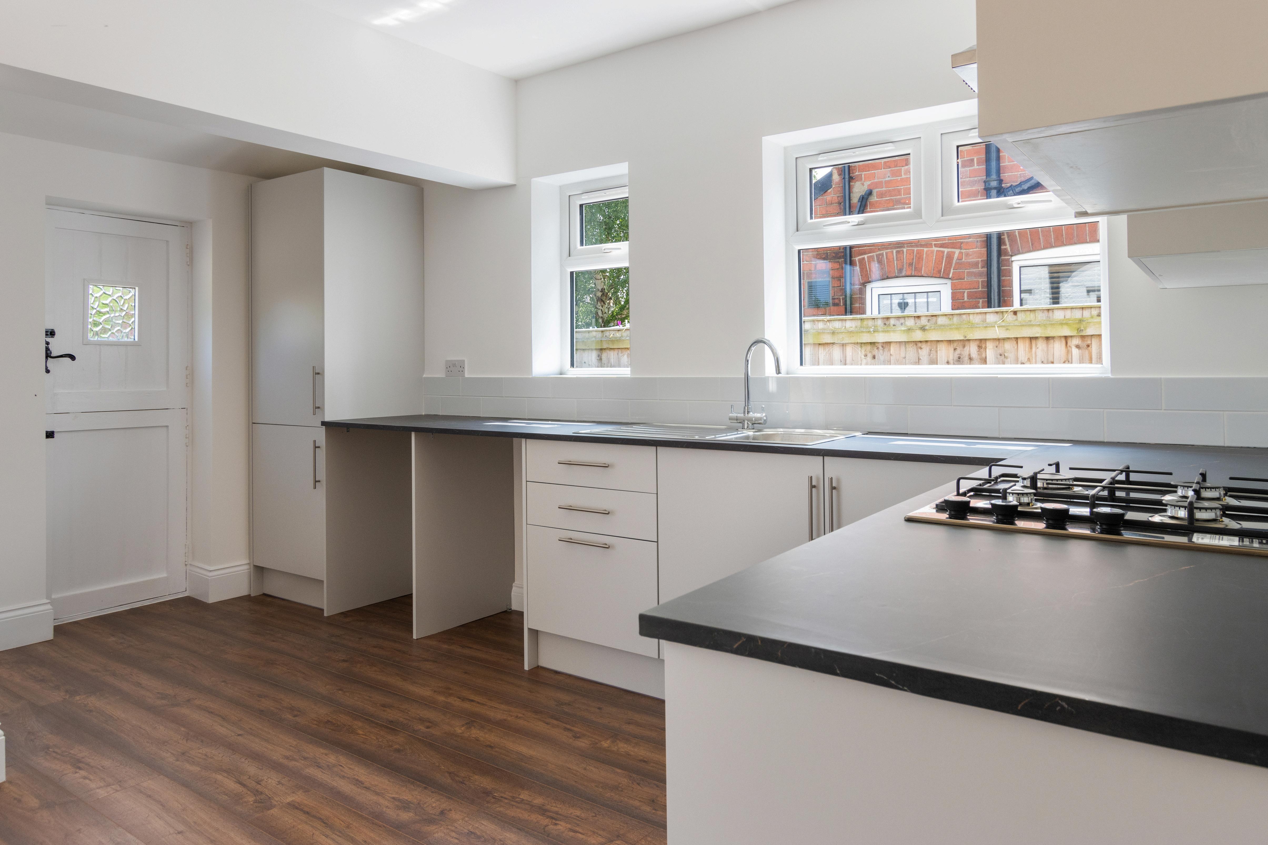 On the ground floor, a welcoming hallway leads to a light-filled lounge featuring the original fireplace. The character-rich formal dining room, complete with its matching fireplace, flows seamlessly into the generously proportioned, openplan kitchen at the rear creating a great family space. French doors open out to a small decking area and generous garden, bringing indoor-outdoor living to the fore. The newly fitted modern kitchen offers sleek cabinetry, integrated appliances, and perfect space for family gatherings. A handy, newly installed WC under the stairs completes this level.