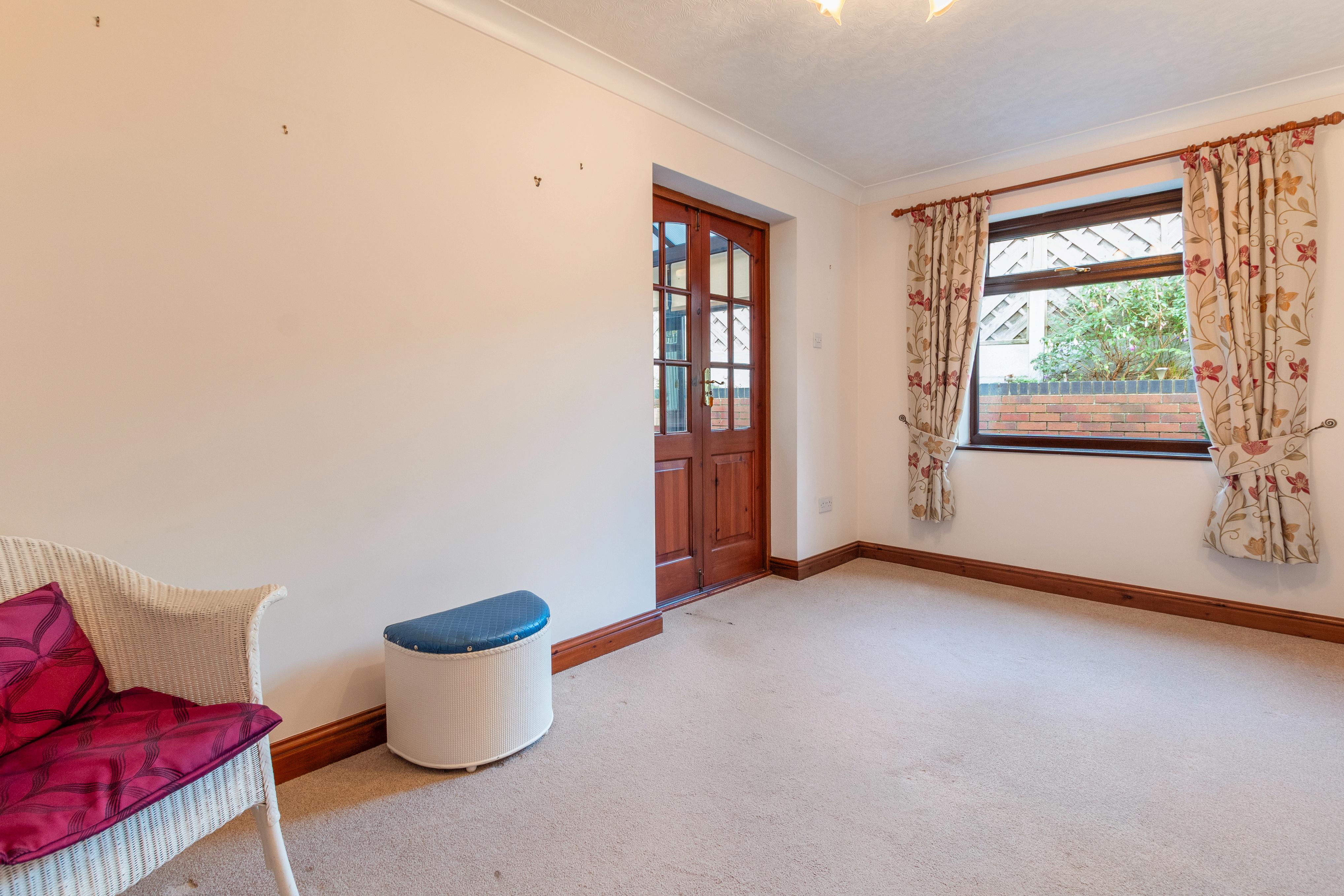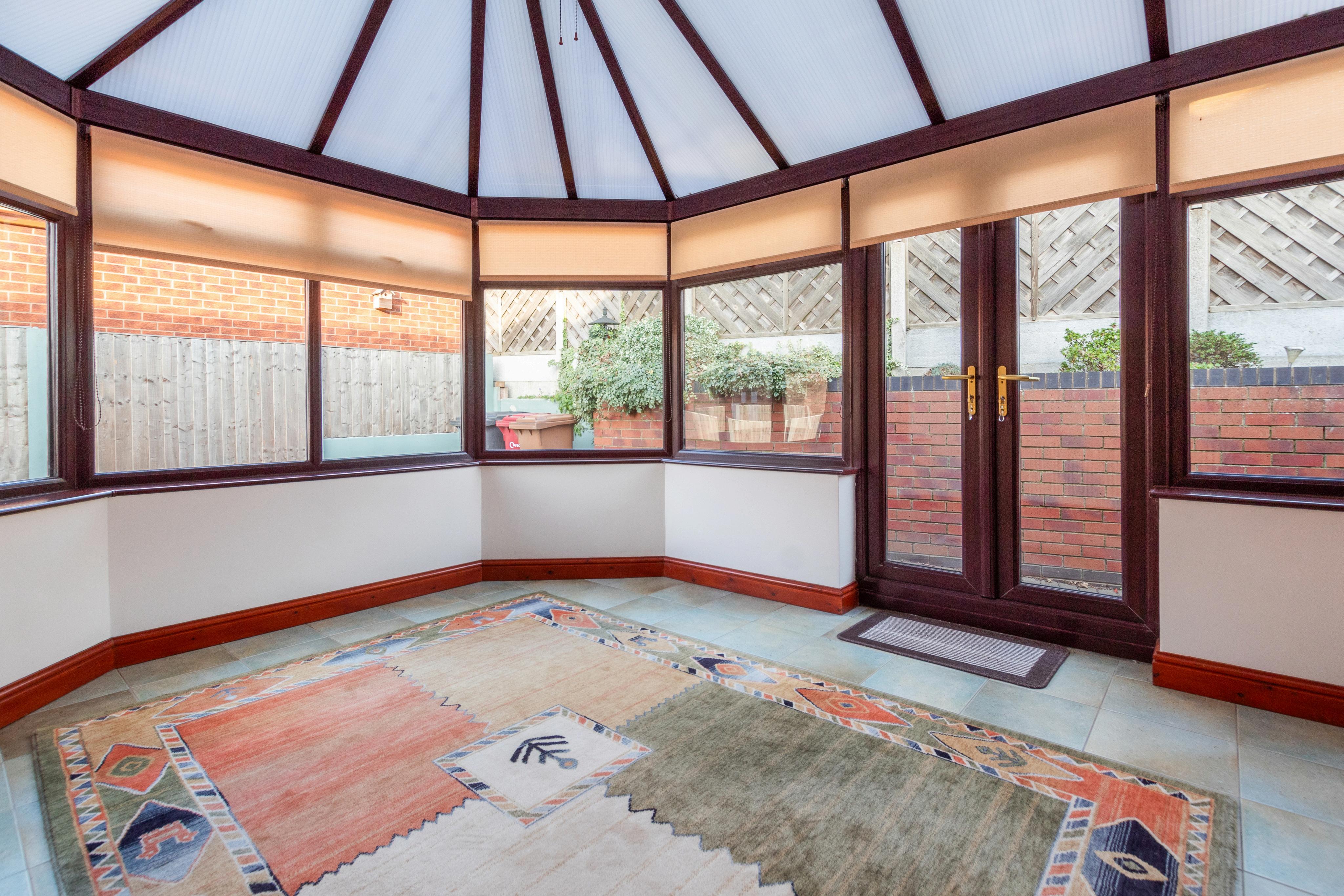 Off the hallway, a versatile room serves as either a formal dining area or a fourth bedroom. This room provides direct access to a bright and airy conservatory, complete with double doors that open onto the garden, perfect for indoor-outdoor entertaining or relaxation. The hallway also leads to three more well-proportioned bedrooms, with the primary bedroom enjoying a private en-suite shower room featuring a walk-in shower cubicle, a vanity hand wash basin, and a W.C. Bedrooms two and three each offer convenient fitted wardrobes, and all bedrooms are served by a stylish, fully tiled shower room equipped with a walk-in shower, vanity hand wash basin, and low-level flush W.C.