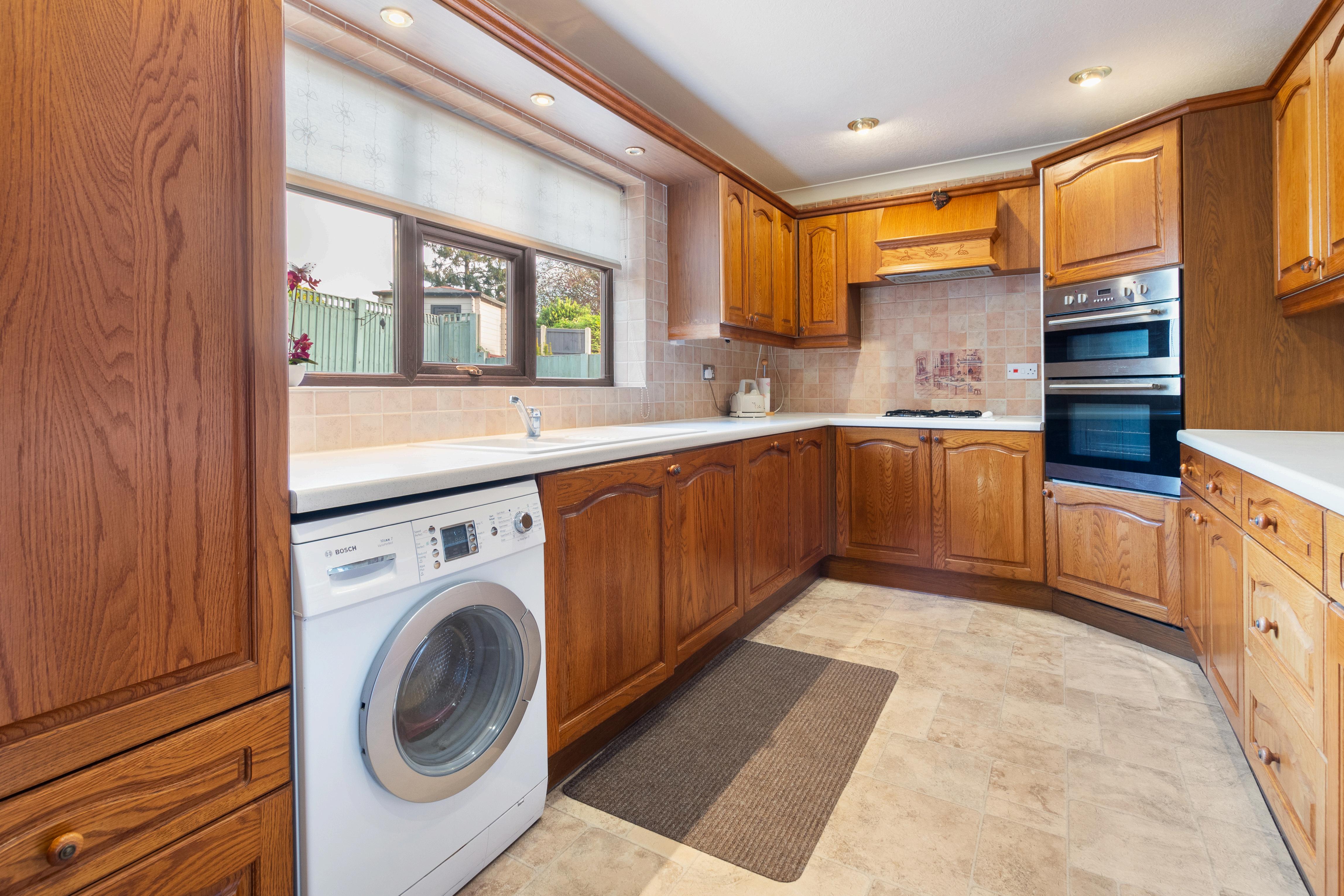 This delightful, detached bungalow offers an inviting entrance porch that opens into a warm and welcoming hallway, setting the tone for the spacious living areas within. Leading from the hallway, the well-equipped fitted kitchen boasts a variety of base and wall-mounted units, a built-in double oven, a gas hob with an extractor fan, and integrated appliances, including a dishwasher and fridge/freezer. There’s additional space available for further white goods.
