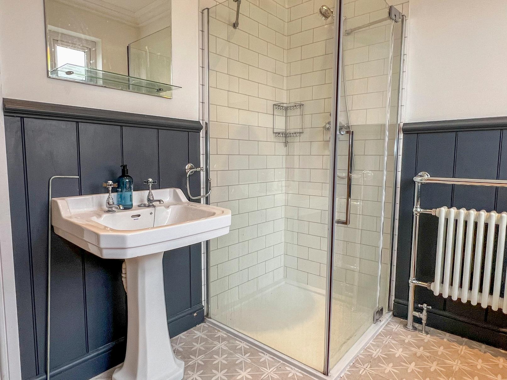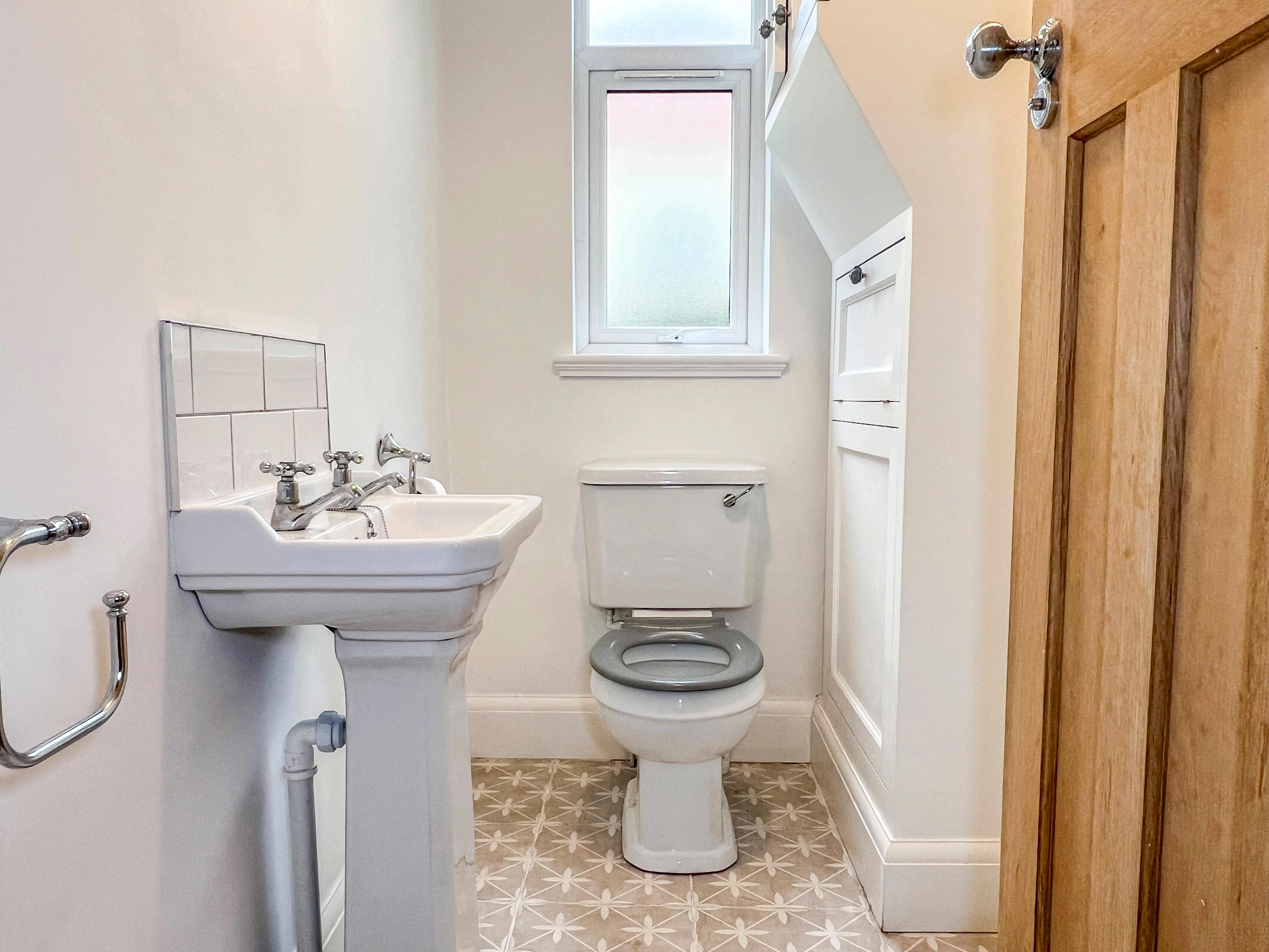 Ascending the stairs, an open landing illuminated by a front-facing window leads to the sleeping quarters. The master bedroom impresses with its generous proportions and traditional fireplace, offering a serene retreat. Across the landing, a second double bedroom also features distinctive period styling, while two additional smaller double bedrooms at the rear provide comfortable accommodations. The modern yet traditional family bathroom showcases a freestanding bath and separate shower cubicle, combining luxury with functionality.