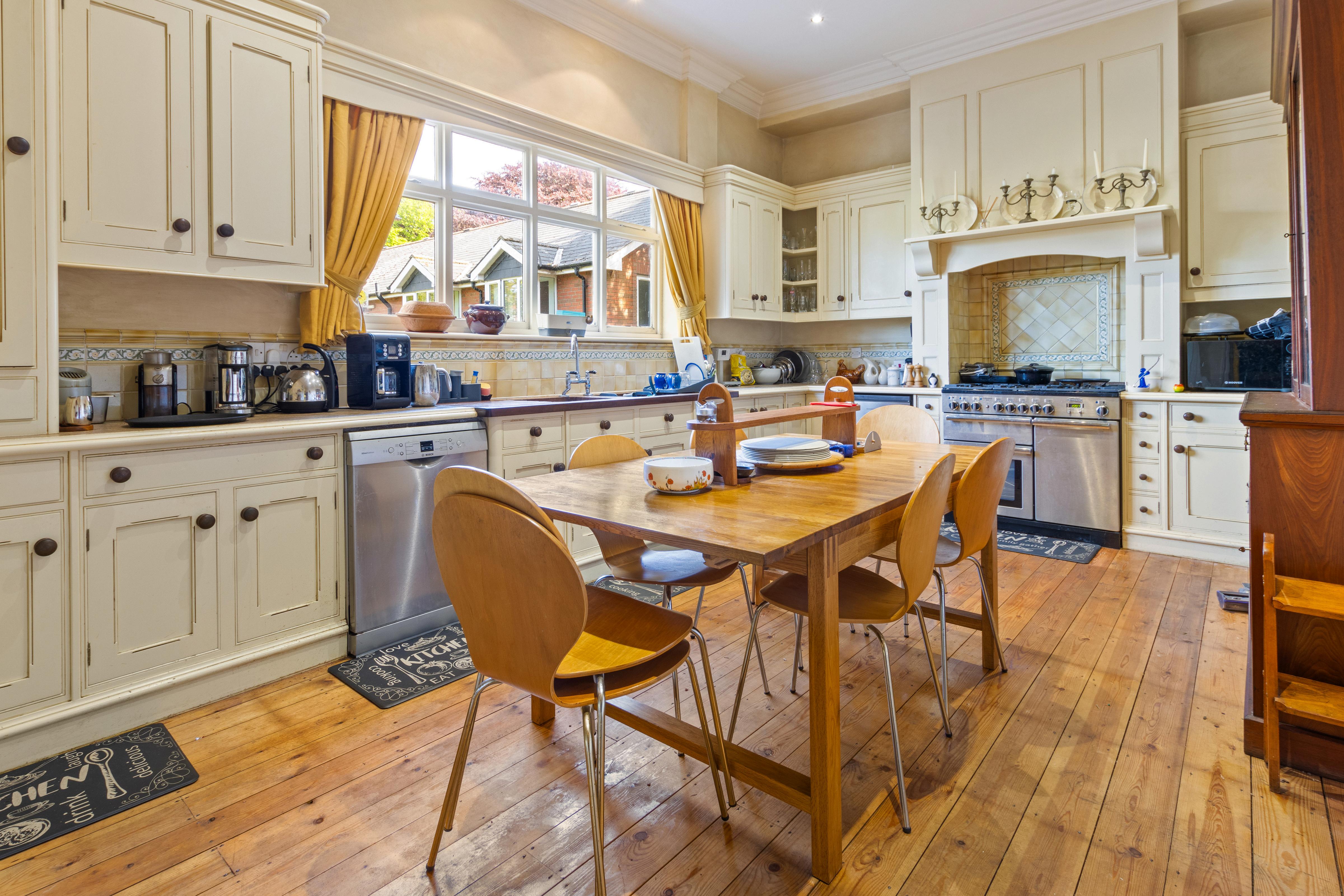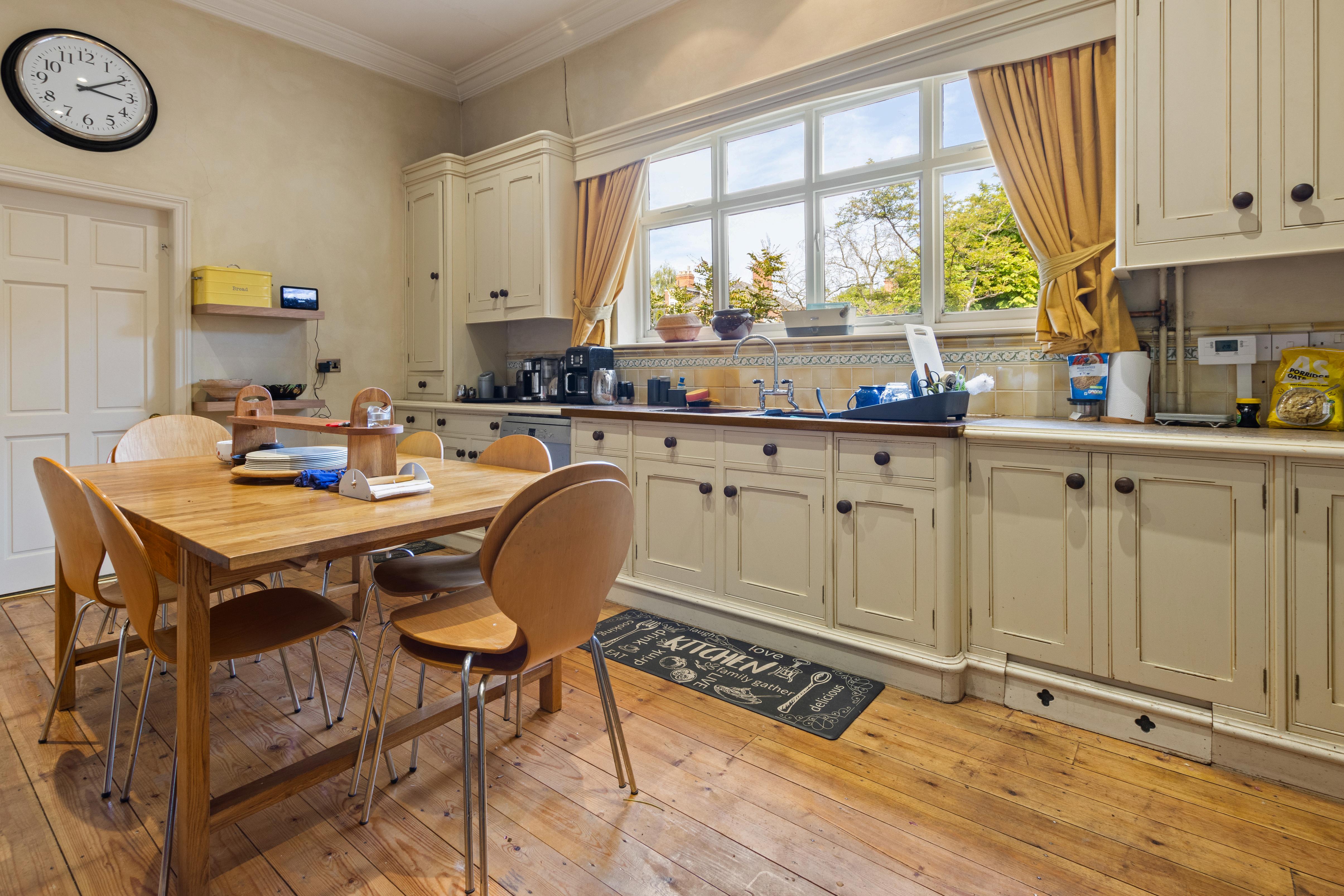 To the rear of the property is the heart of the home the bespoke breakfast kitchen. Carefully designed to respect the heritage of the property, this space features solid wood cabinetry finished in a soft cream, complemented by solid wood flooring. The generous proportions allow room for a large dining table and flow effortlessly into the adjoining snug, offering a cosy spot for family gatherings or a quiet reading corner.