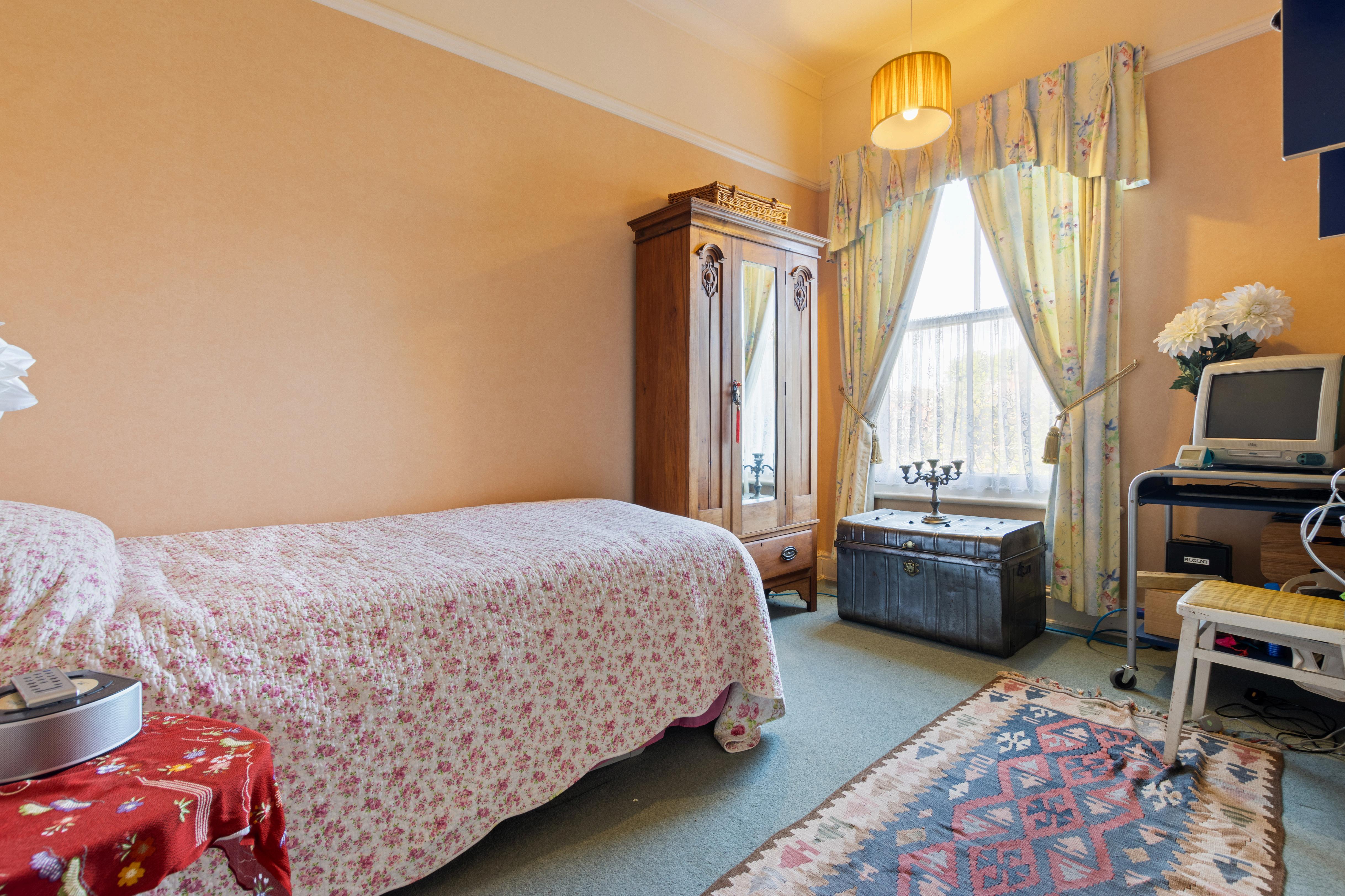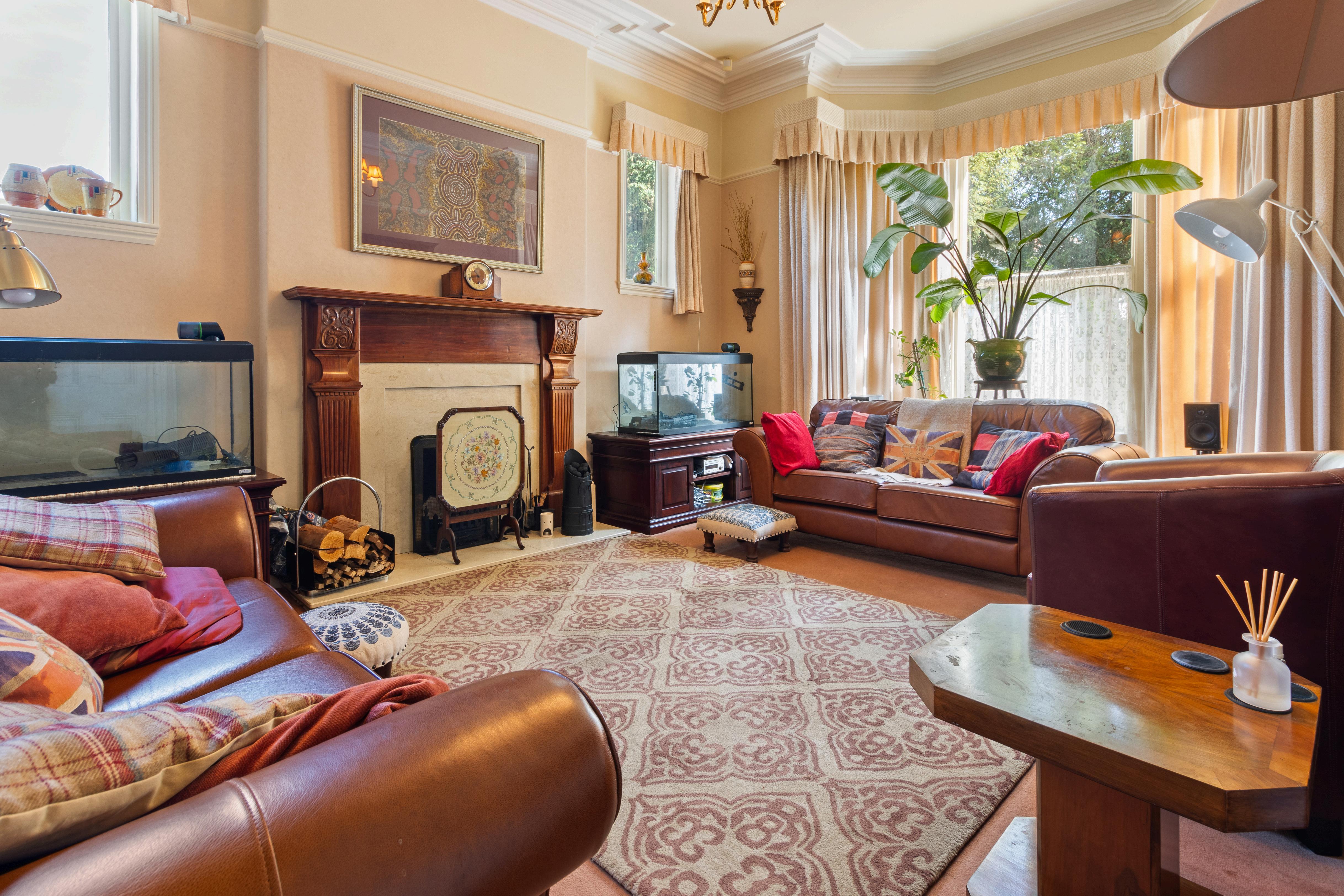 Step through the striking arched entrance into a wide central hallway with high ceilings and decorative cornicing that hint at the grandeur throughout. To your right, the sitting room unfolds, an expansive retreat filled with natural light through a large bay window. This space blends historic elegance with comfort, featuring intricate ceiling plasterwork, an ornate fireplace, and warm tones that create a welcoming atmosphere.
