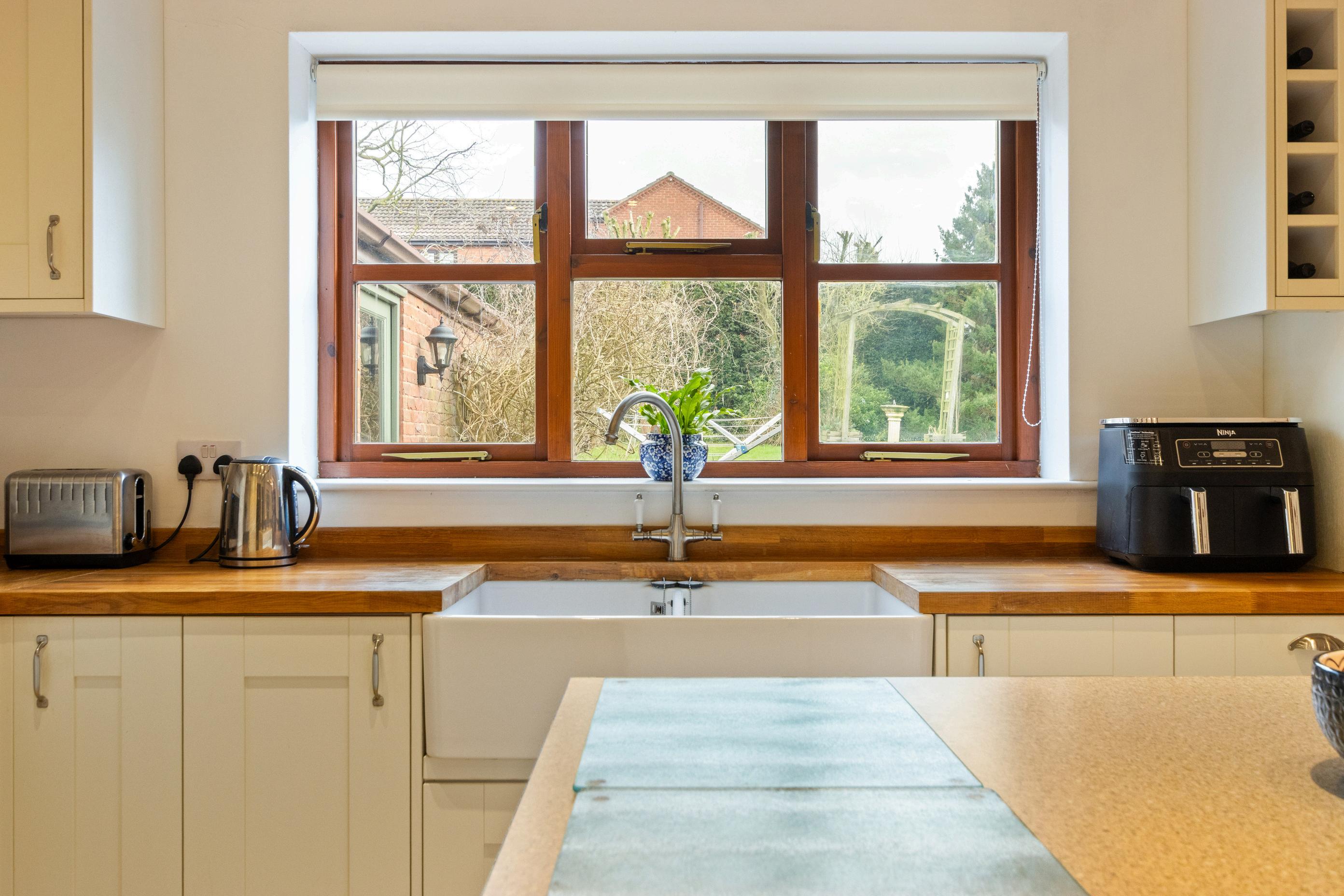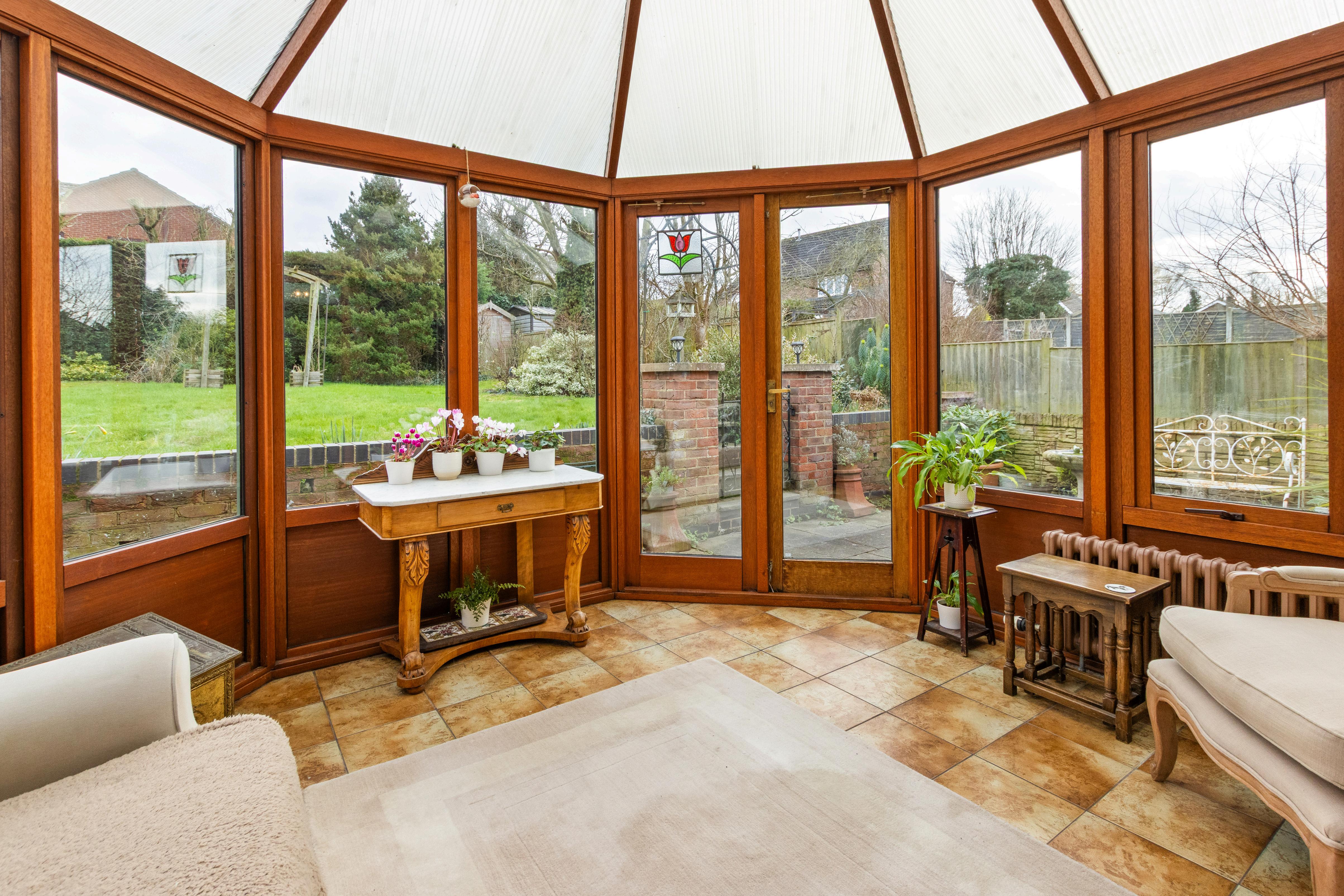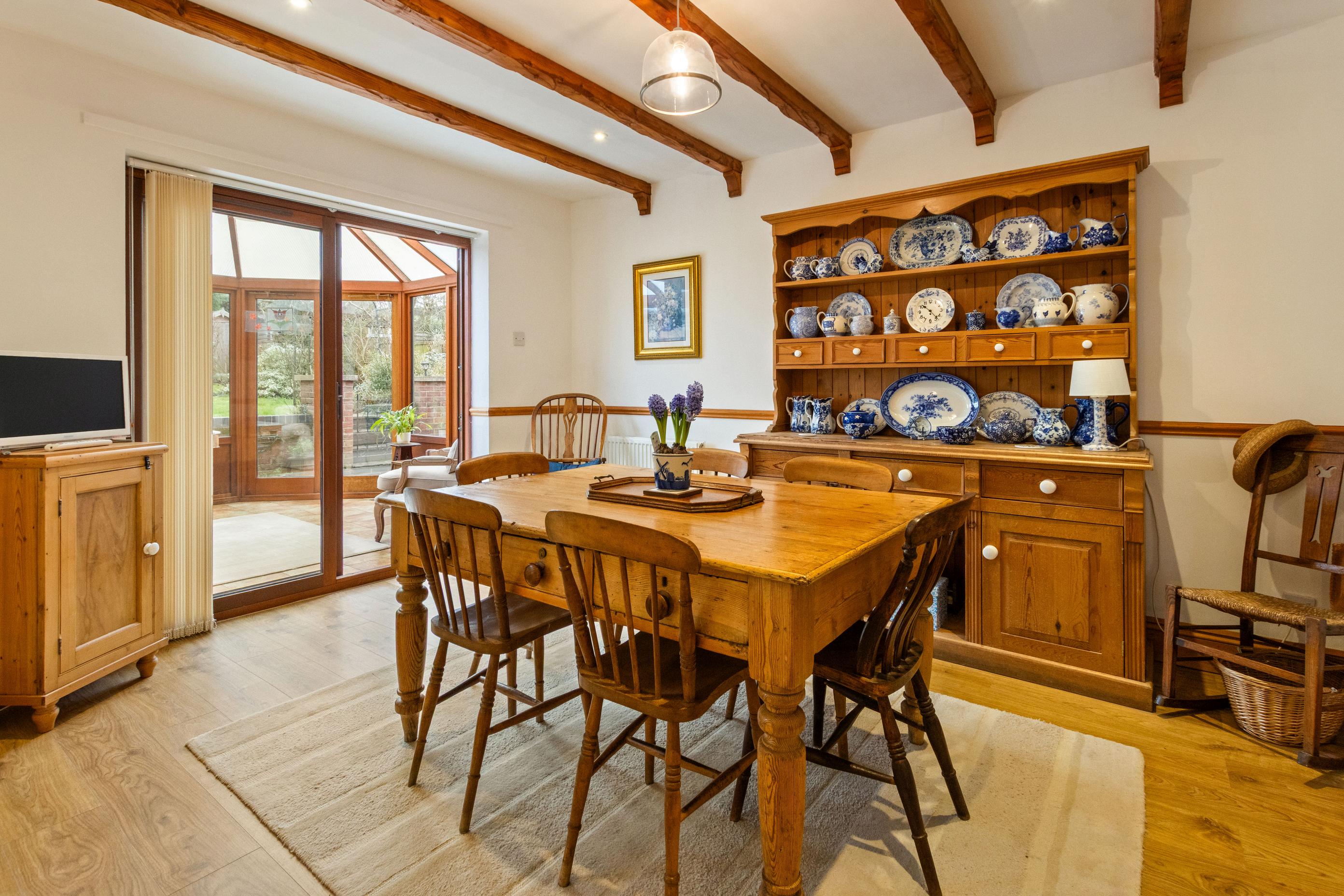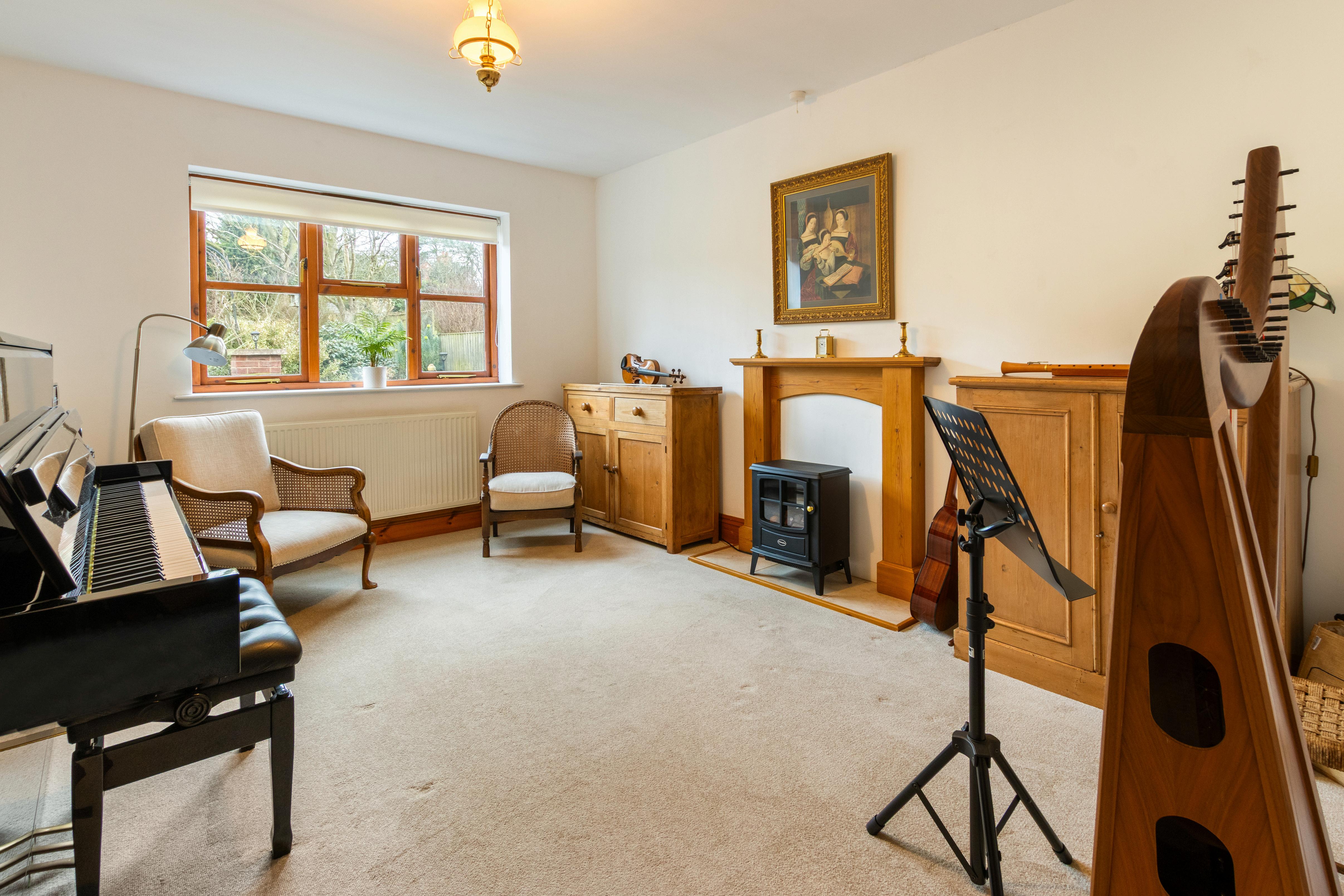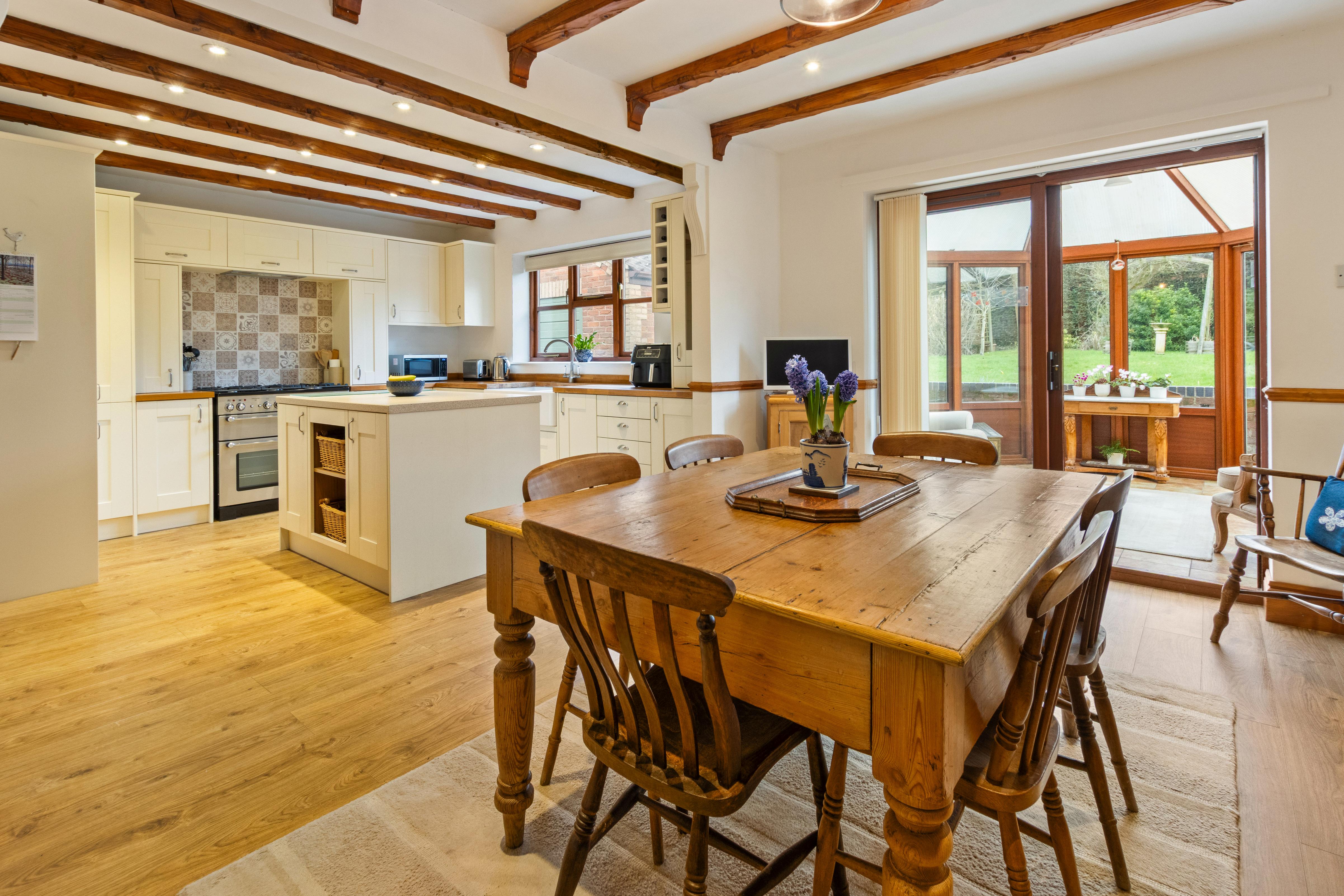 The kitchen is well equipped with ample storage and worktop space, opening into a dining area that enjoys views over the garden, making it ideal for both everyday living and entertaining. Multiple reception areas provide flexibility, whether for formal dining, a snug, or a home office.