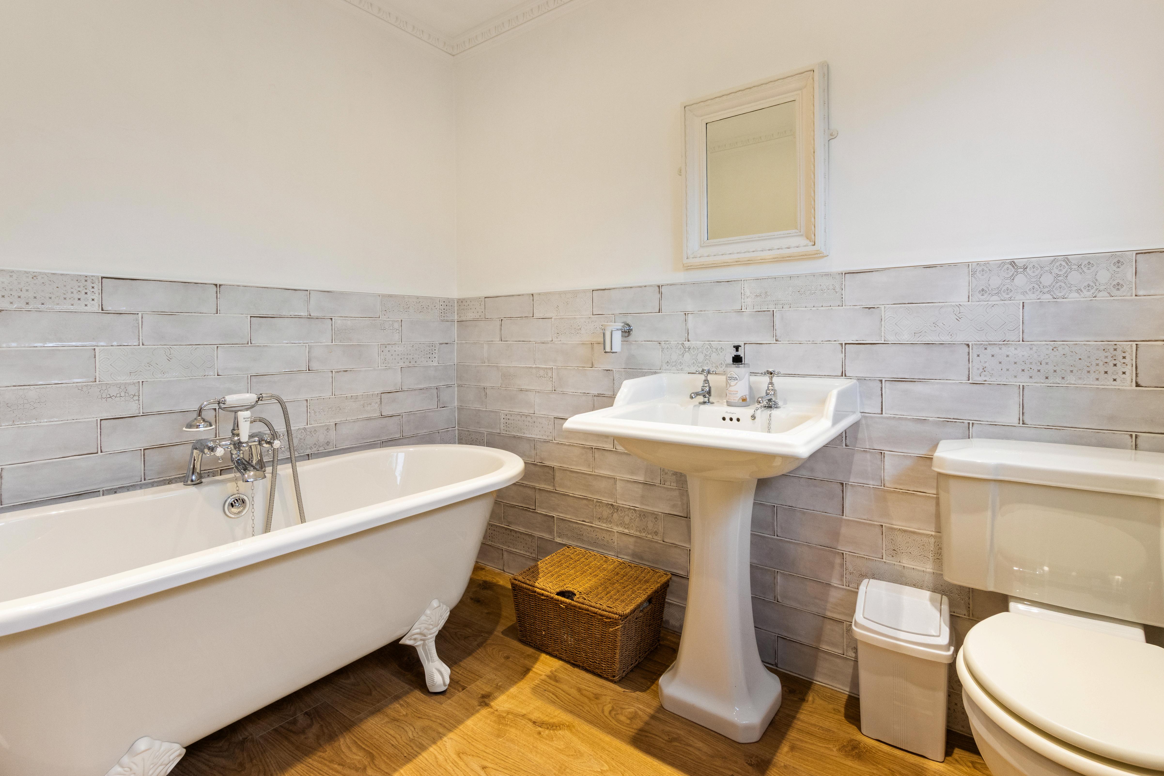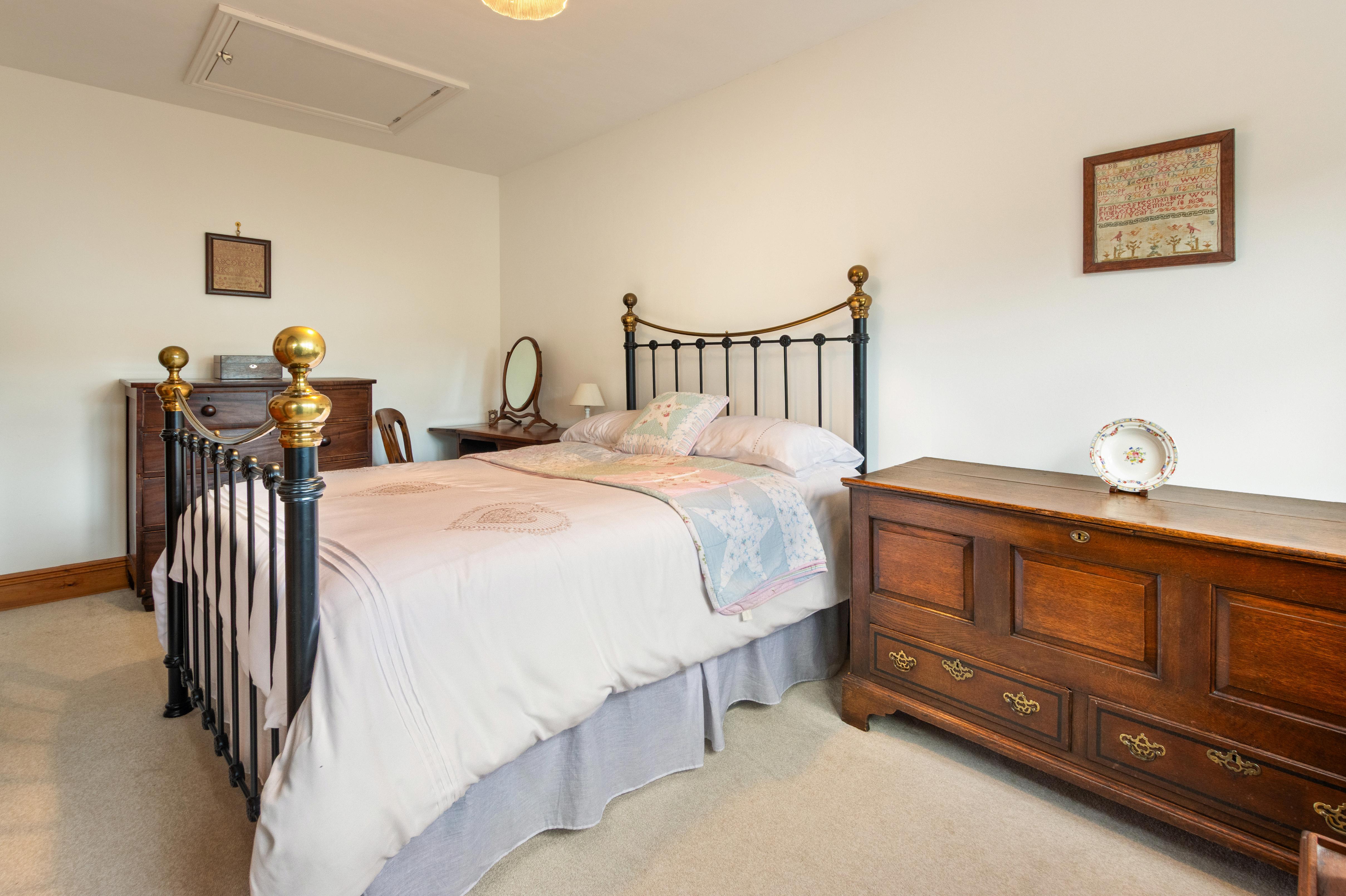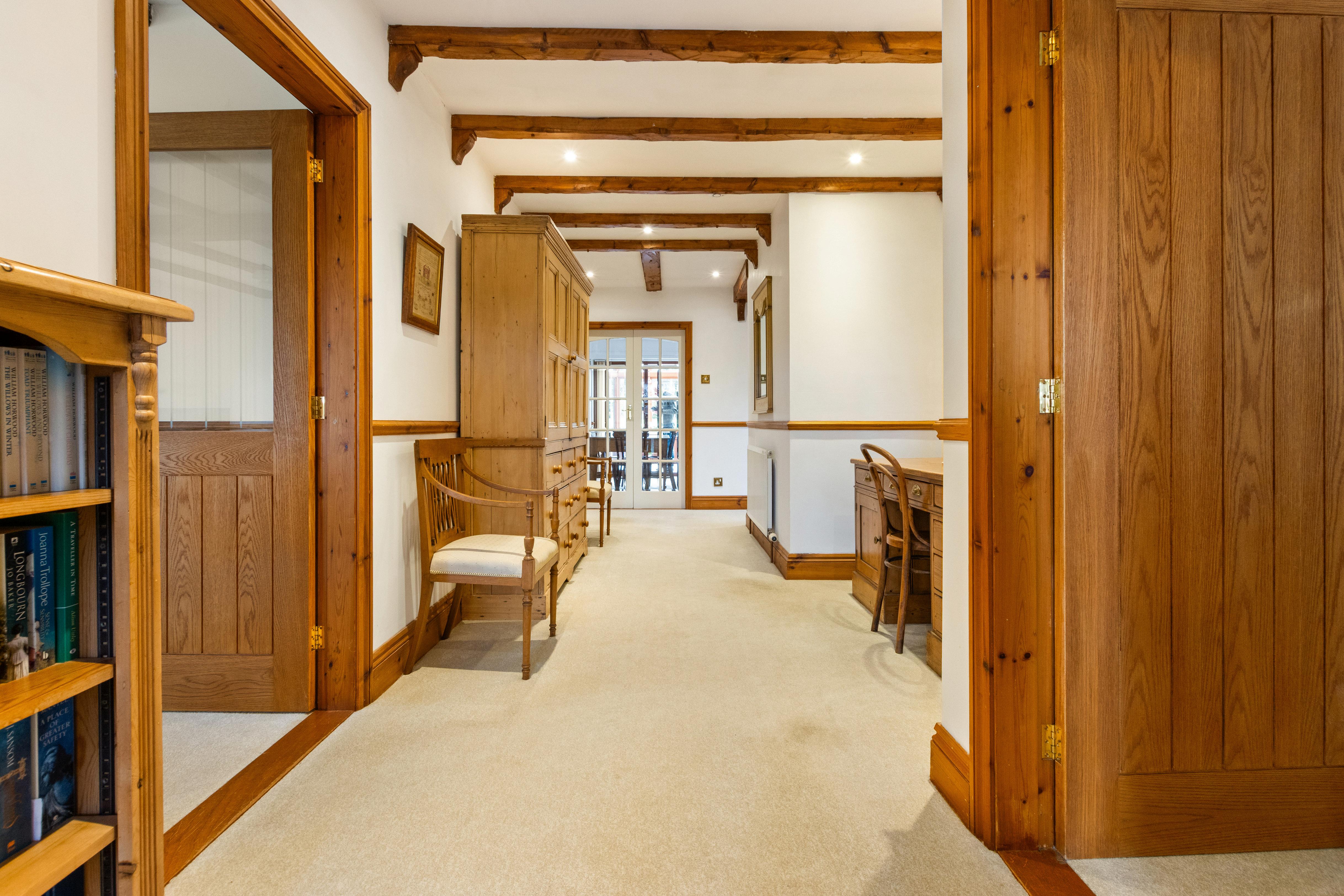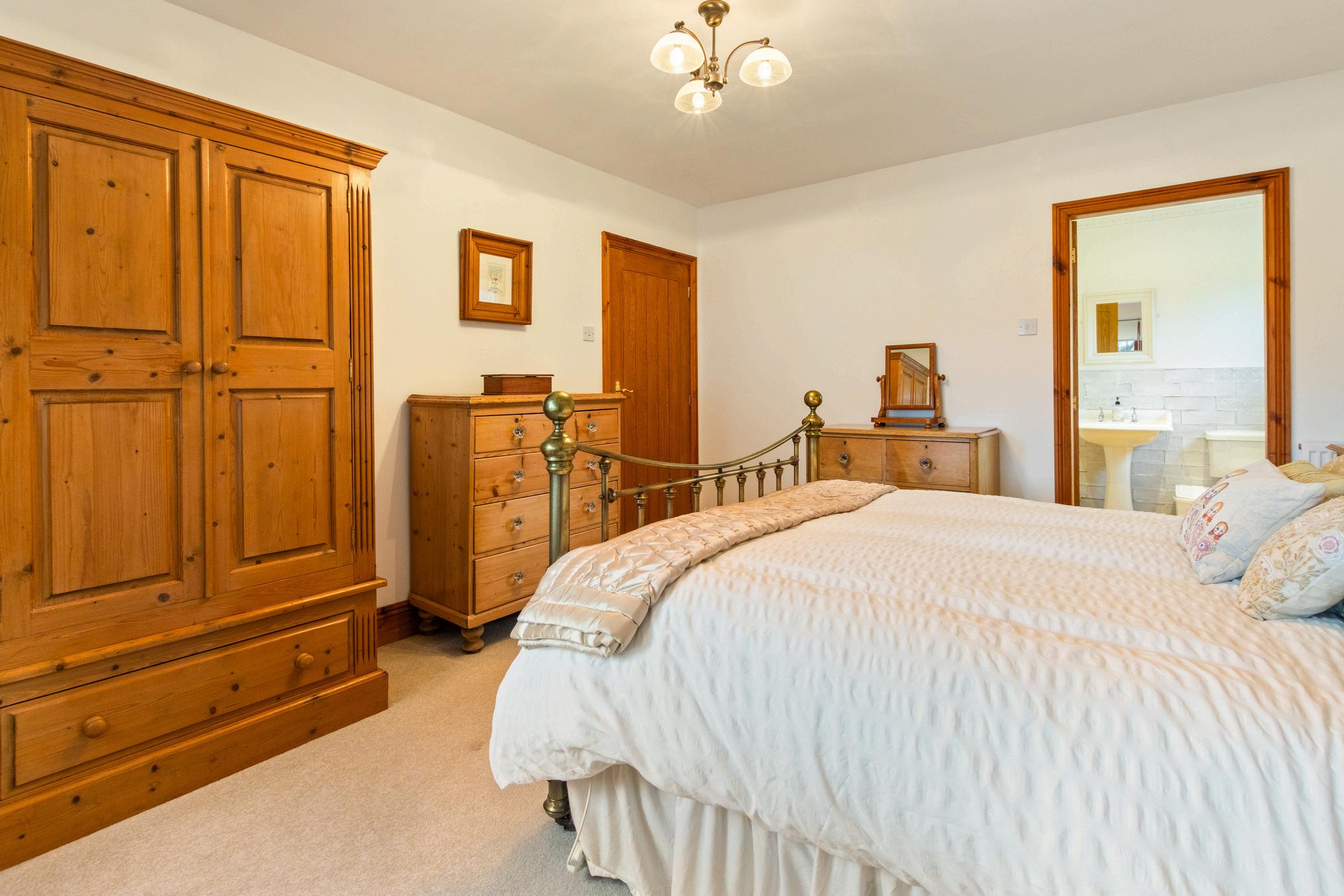 The property offers three comfortable bedrooms, all generously sized and served by a modern bathroom along with an additional shower room, ensuring convenience for family and guests alike. Traditional wooden doors and exposed beams add warmth and character, blending seamlessly with the home’s practical layout.