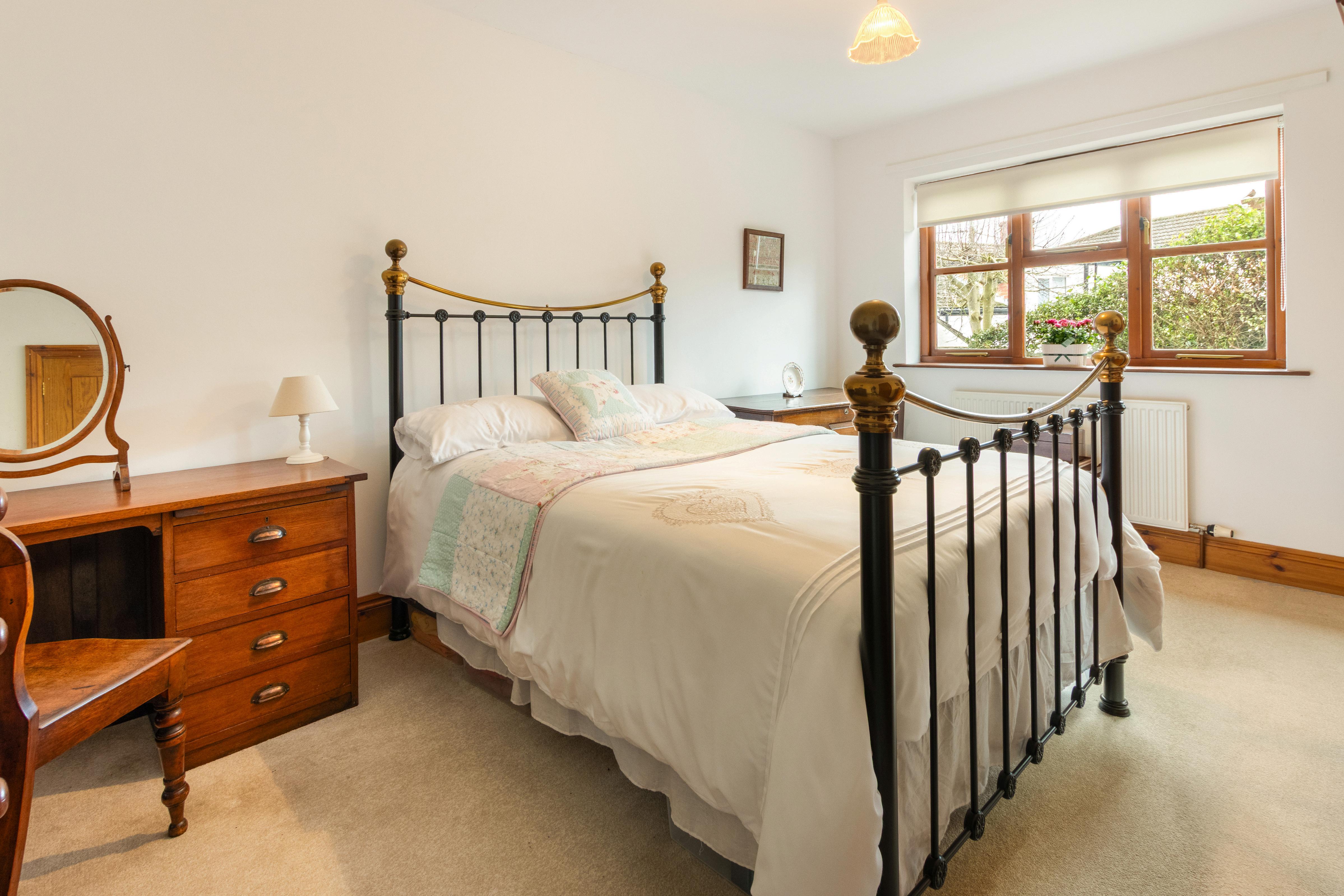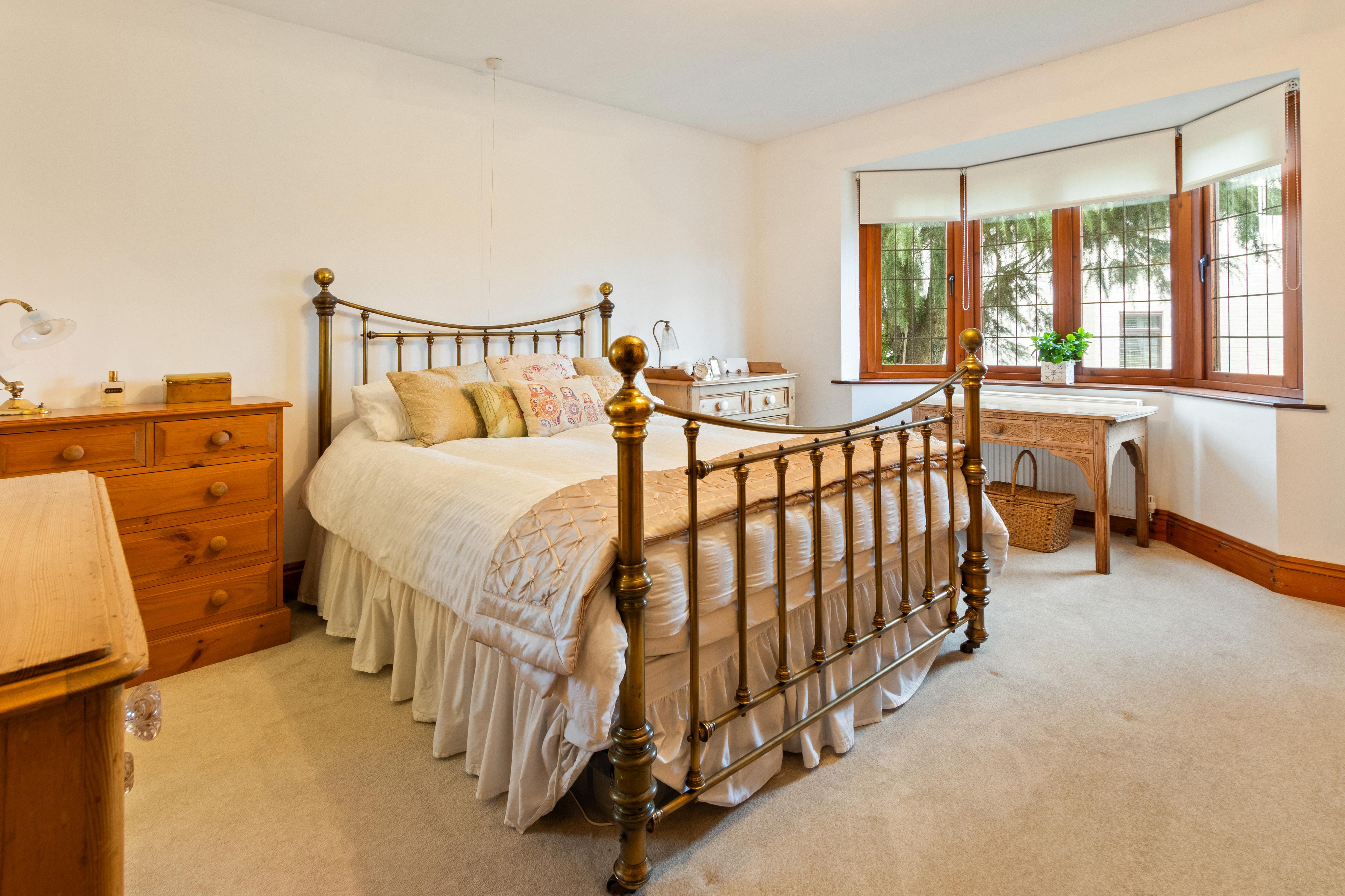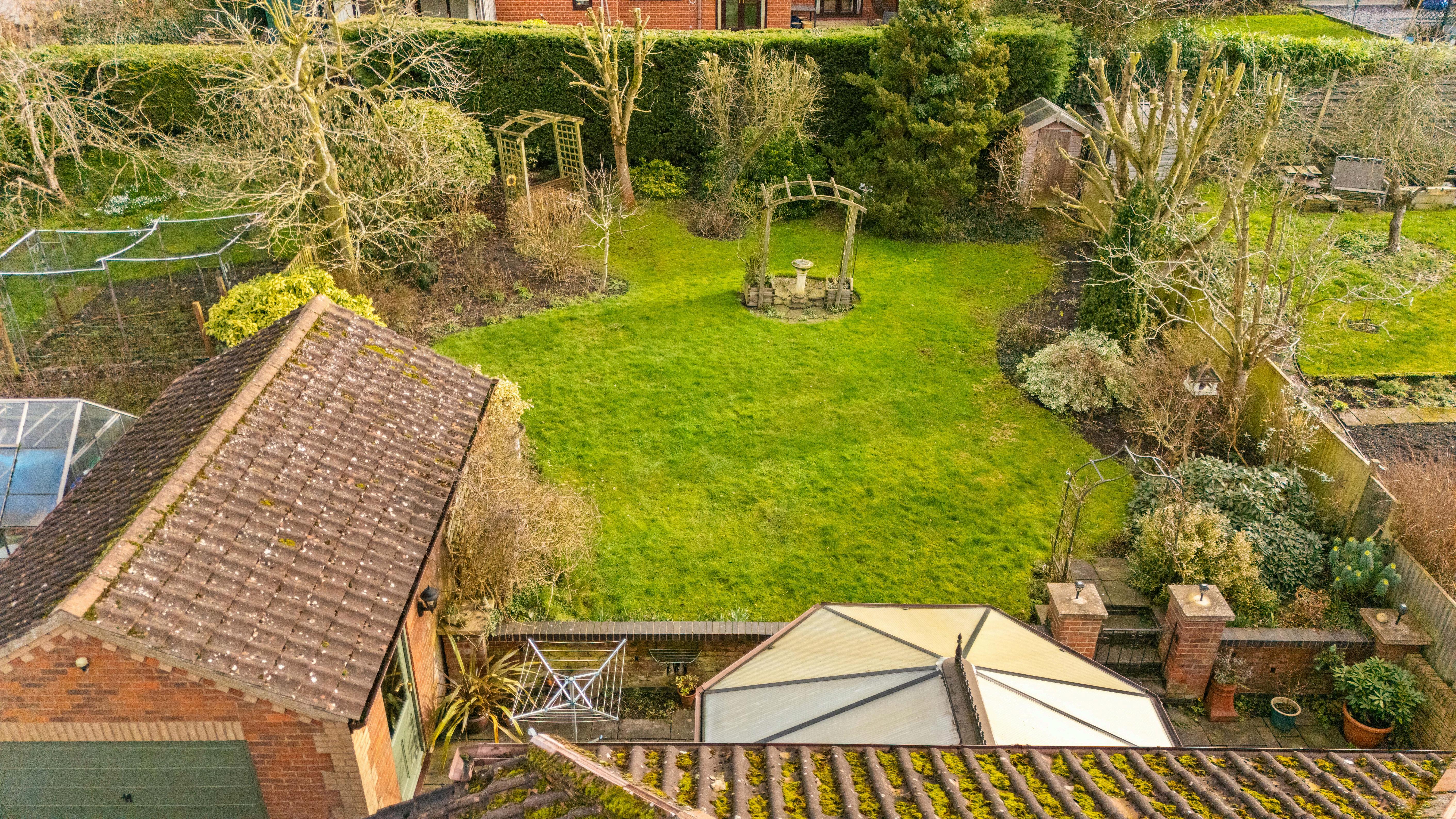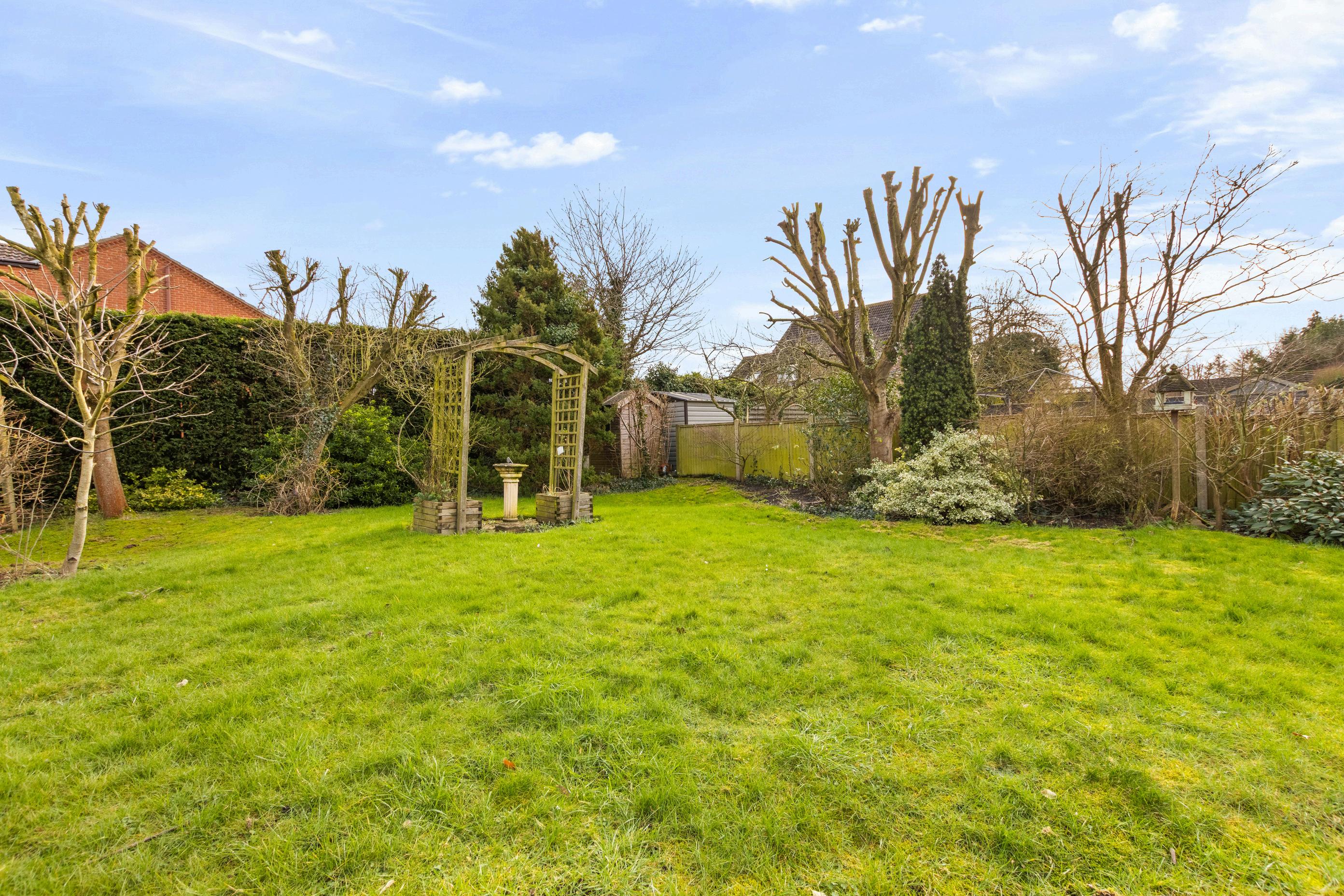 The bungalow sits on a generous plot with attractive gardens to the rear, offering a high degree of privacy. The garden is mainly laid to lawn, bordered by established trees, shrubs, and planting, creating a peaceful outdoor space ideal for relaxation or entertaining. A driveway provides ample off road parking and leads to a detached garage and additional outbuildings, offering excellent storage or potential workshop space. The setting and size of the plot allow for enjoyment of outdoor living throughout the year, with open views adding to the sense of space and tranquillity.
