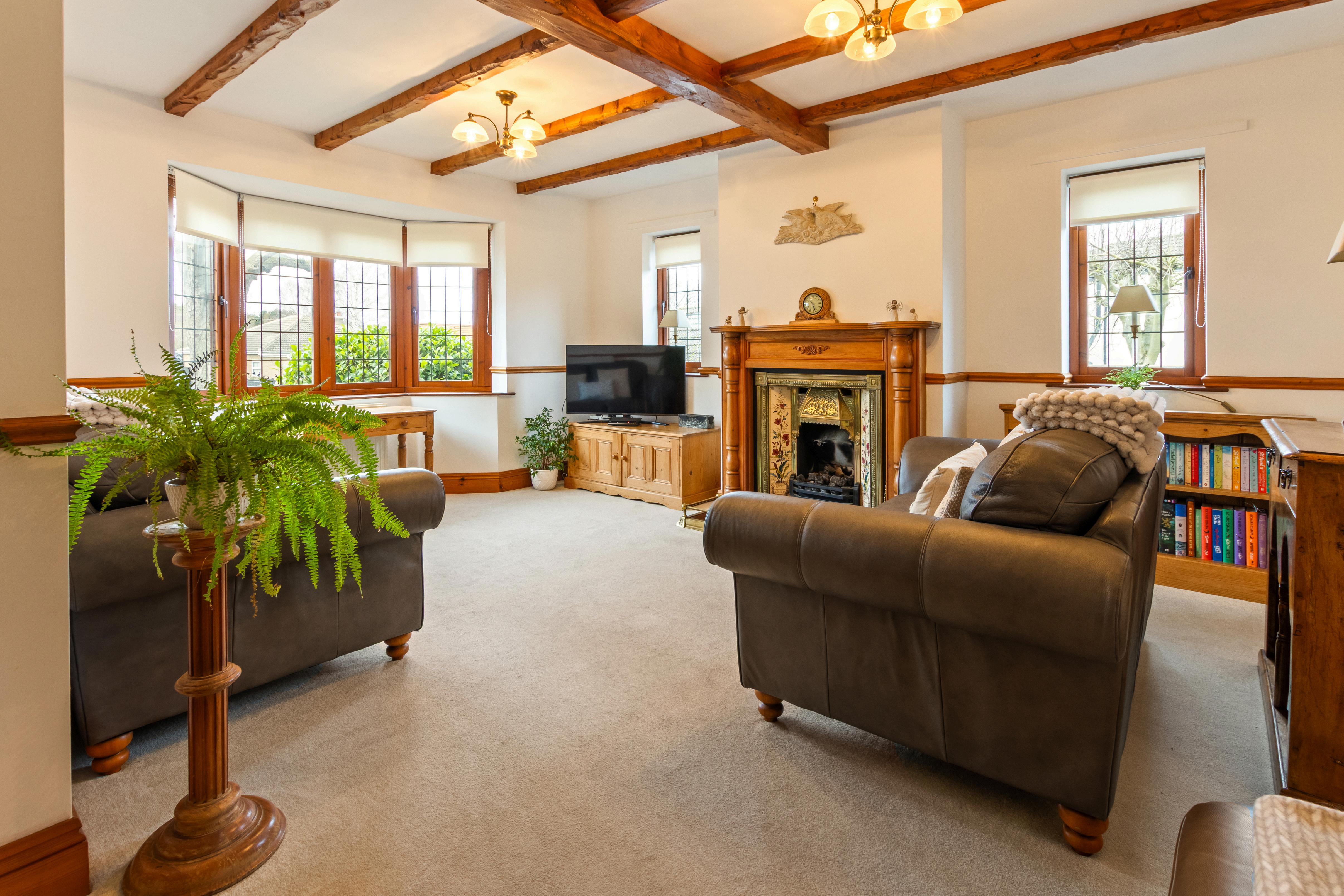 The main living spaces are bright and inviting, with a spacious lounge featuring a character fireplace that creates a natural focal point for the room.