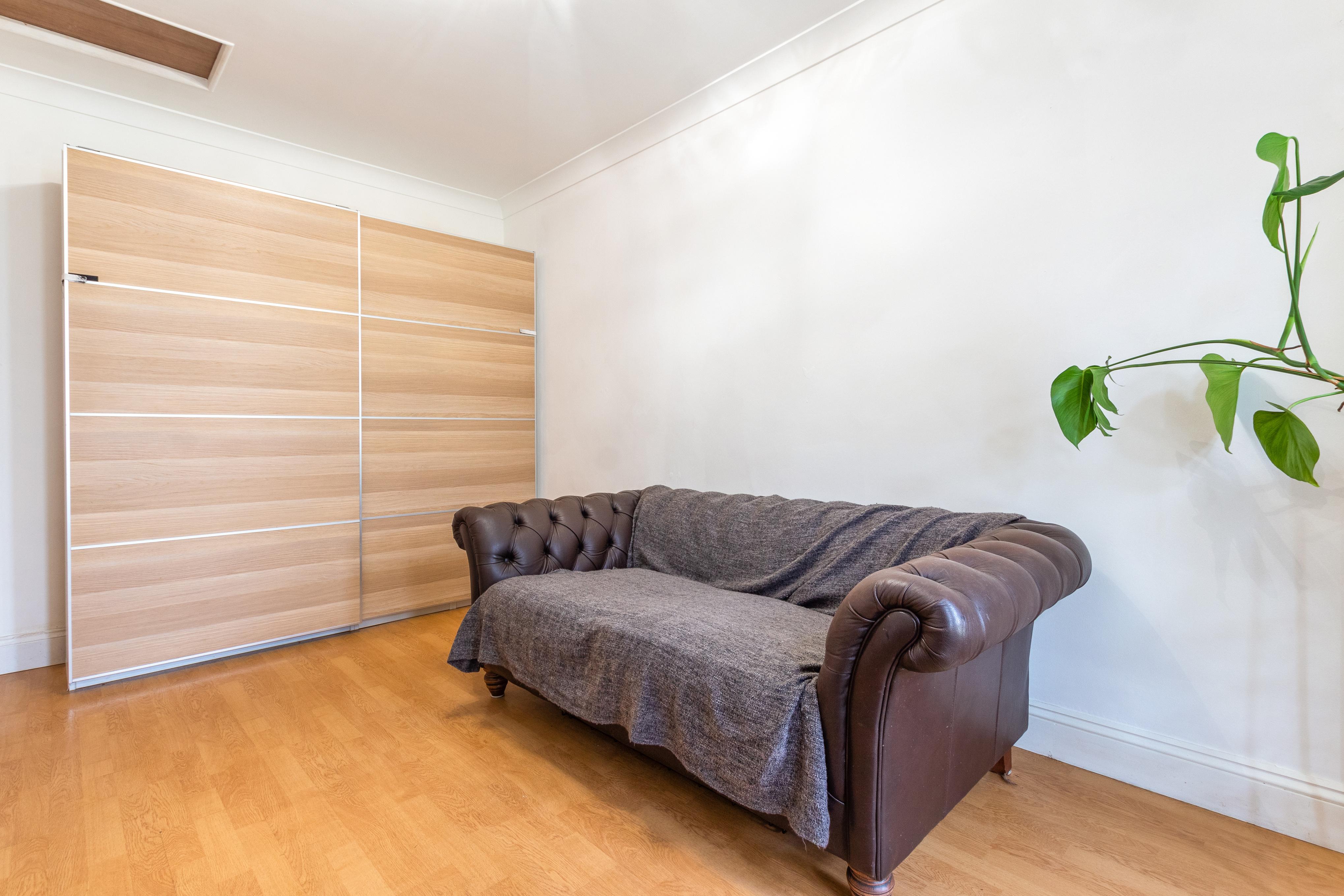 From the lounge, a central hallway guides you to the rear-facing master bedroom, offering a tranquil retreat with French doors opening onto the rear garden A sliding barn door leads to the contemporary three-piece shower room, featuring a walk-in shower, hand wash basin, and W.C. Enjoy modern comfort and convenience in this thoughtfully designed space.