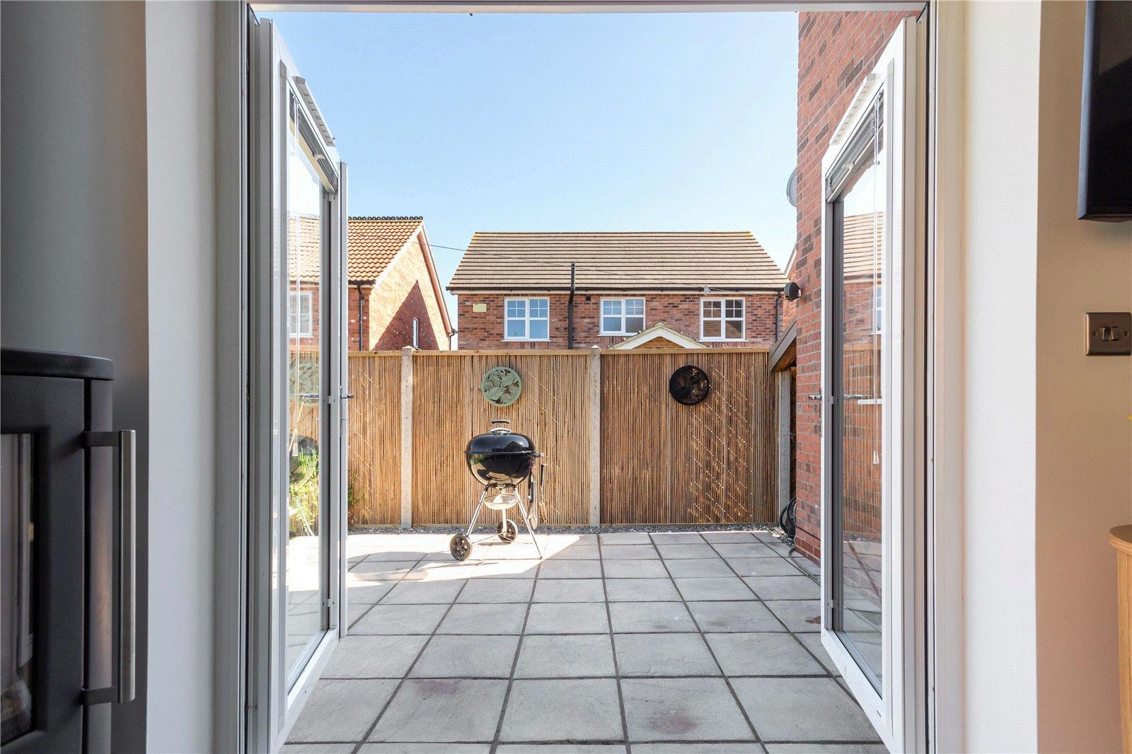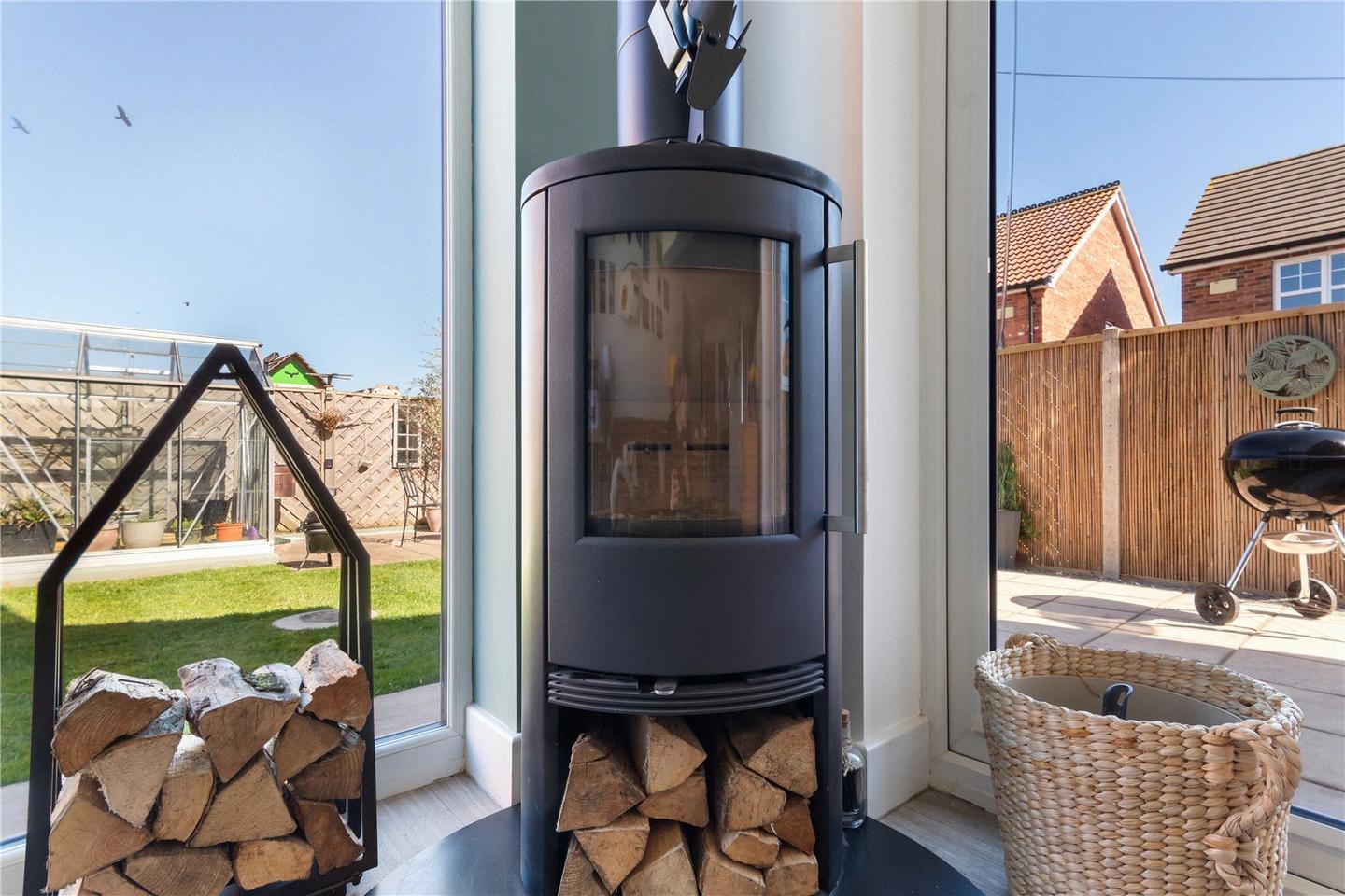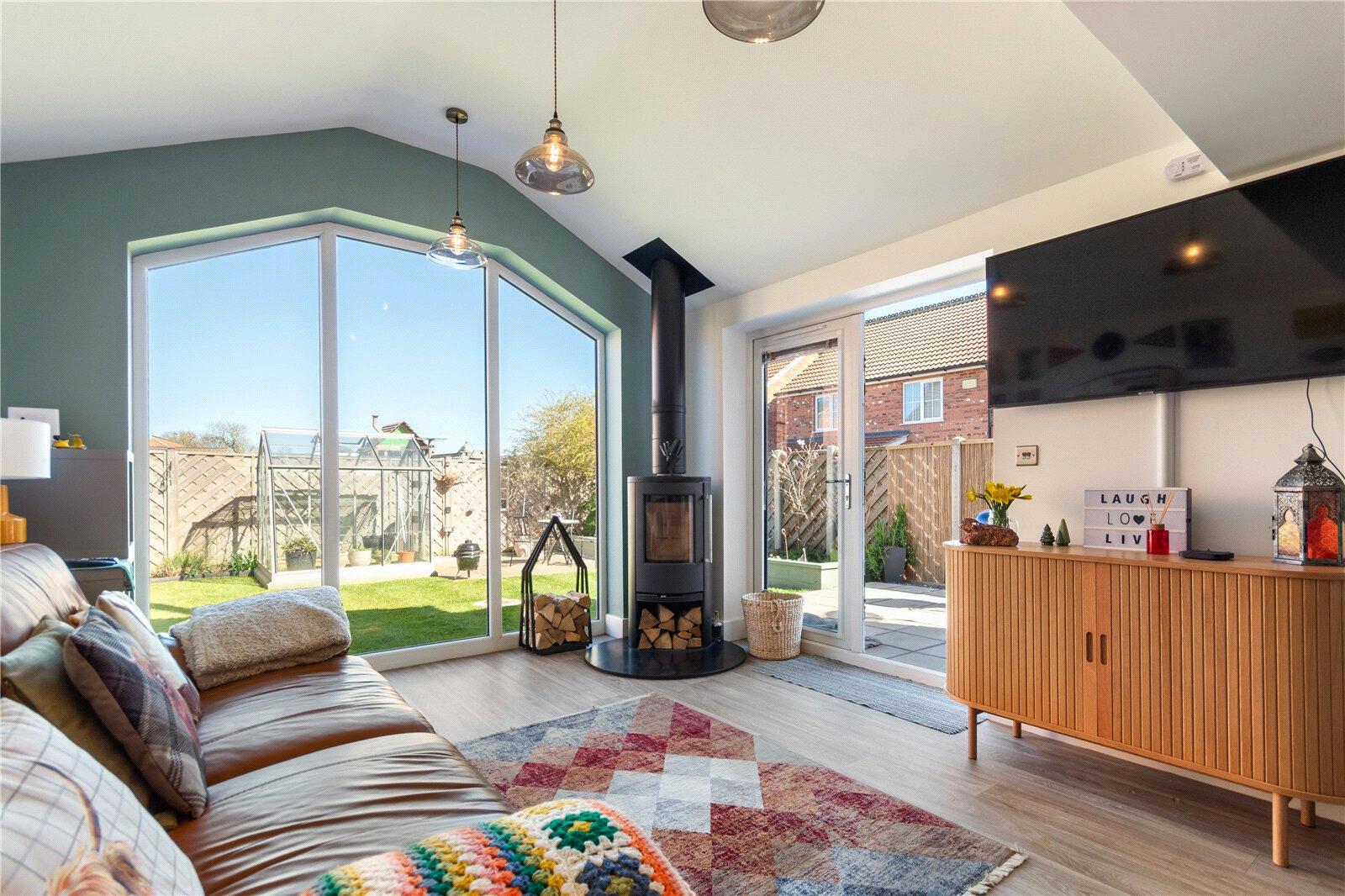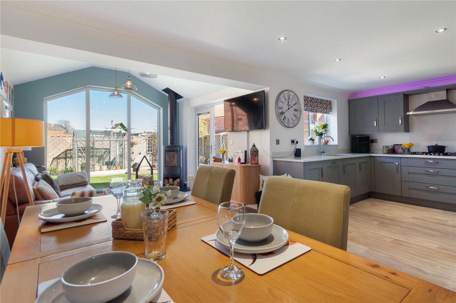 The heart of the home is the expansive open-plan kitchen and family room, which features a large picture window overlooking the rear aspect and French doors that open directly onto the garden, flooding the room with natural light.Amodern stove fire adds a cosy focal point, making it the perfect setting for both everyday living and hosting guests. The kitchen itself is fitted with contemporary units, integrated appliances, and ample worktop space perfect for cooking, dining, and socialising.
