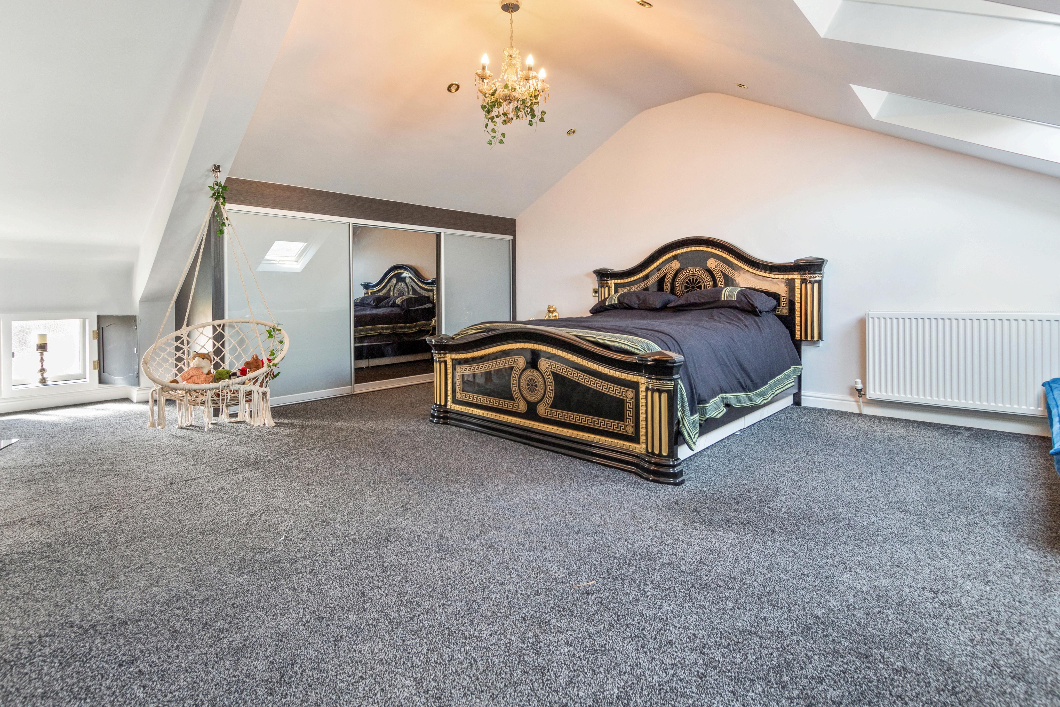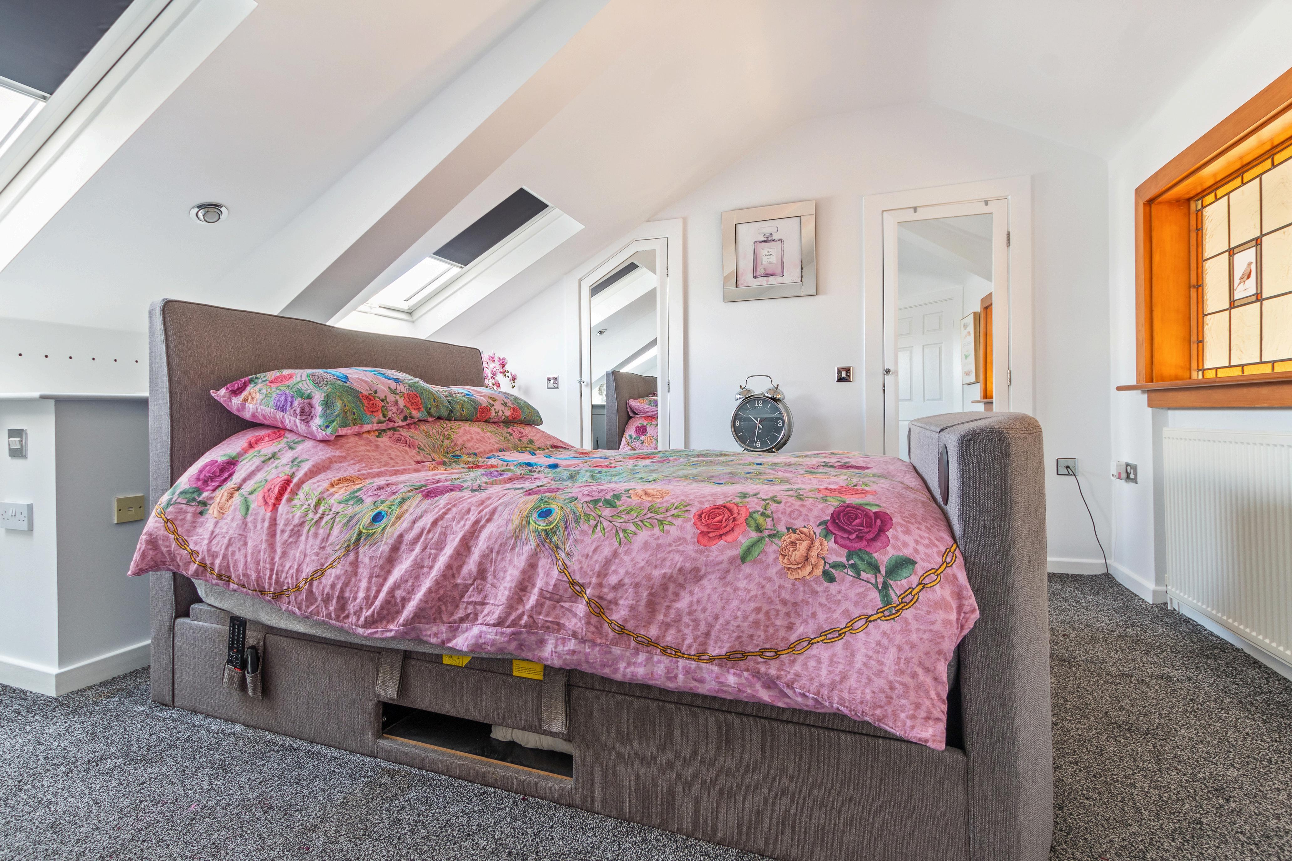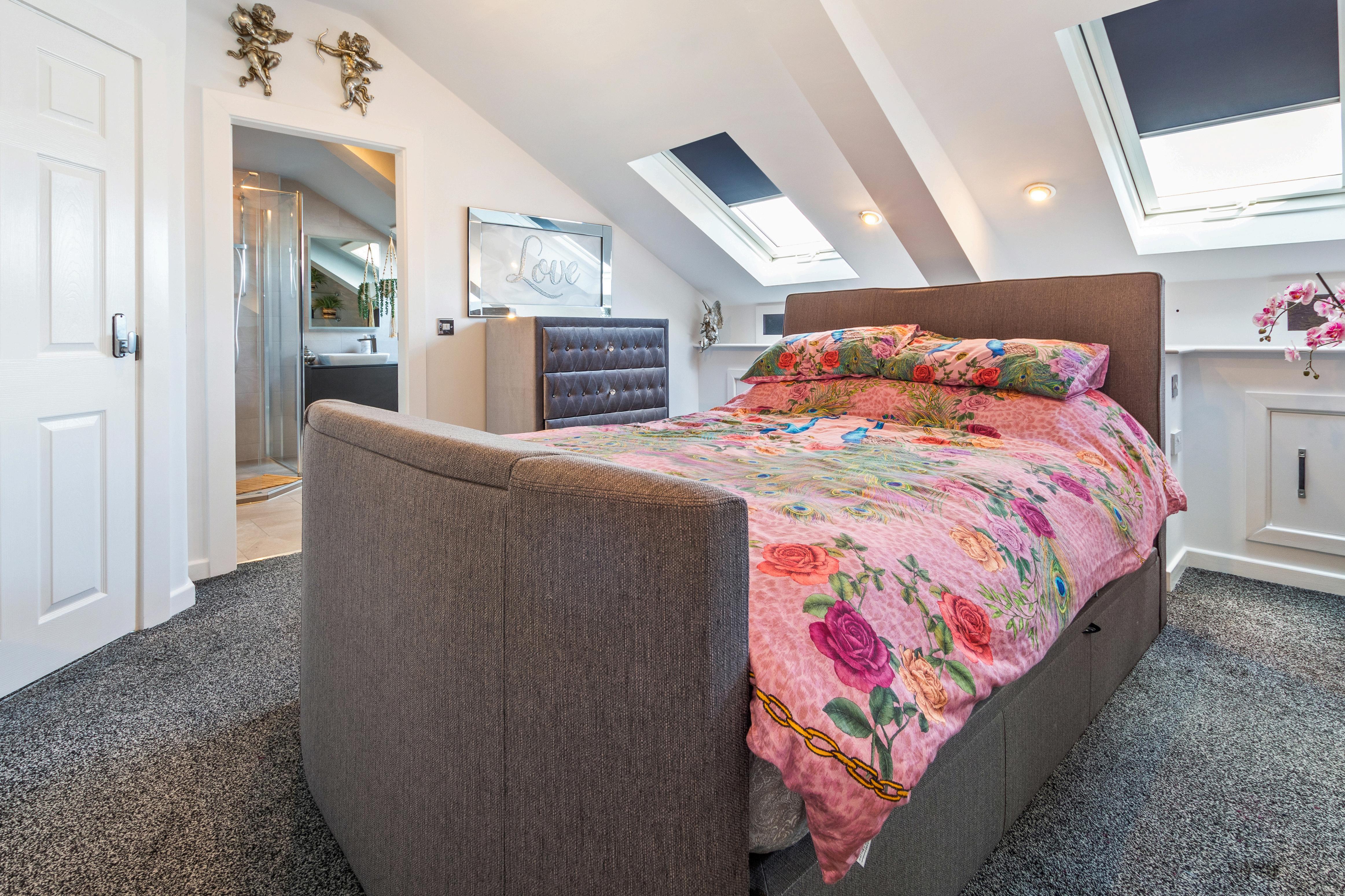 Ascend to the first floor, where an open landing with vaulted ceiling sets a grand ambiance. Here, you'll find the largest bedroom, boasting skylight windows and fitted sliding door wardrobes, alongside a further double bedroom with fitted wardrobes and a beautifully appointed modern En-suite bathroom, complete with a walk-in shower, modern bath, and vanity sink unit.