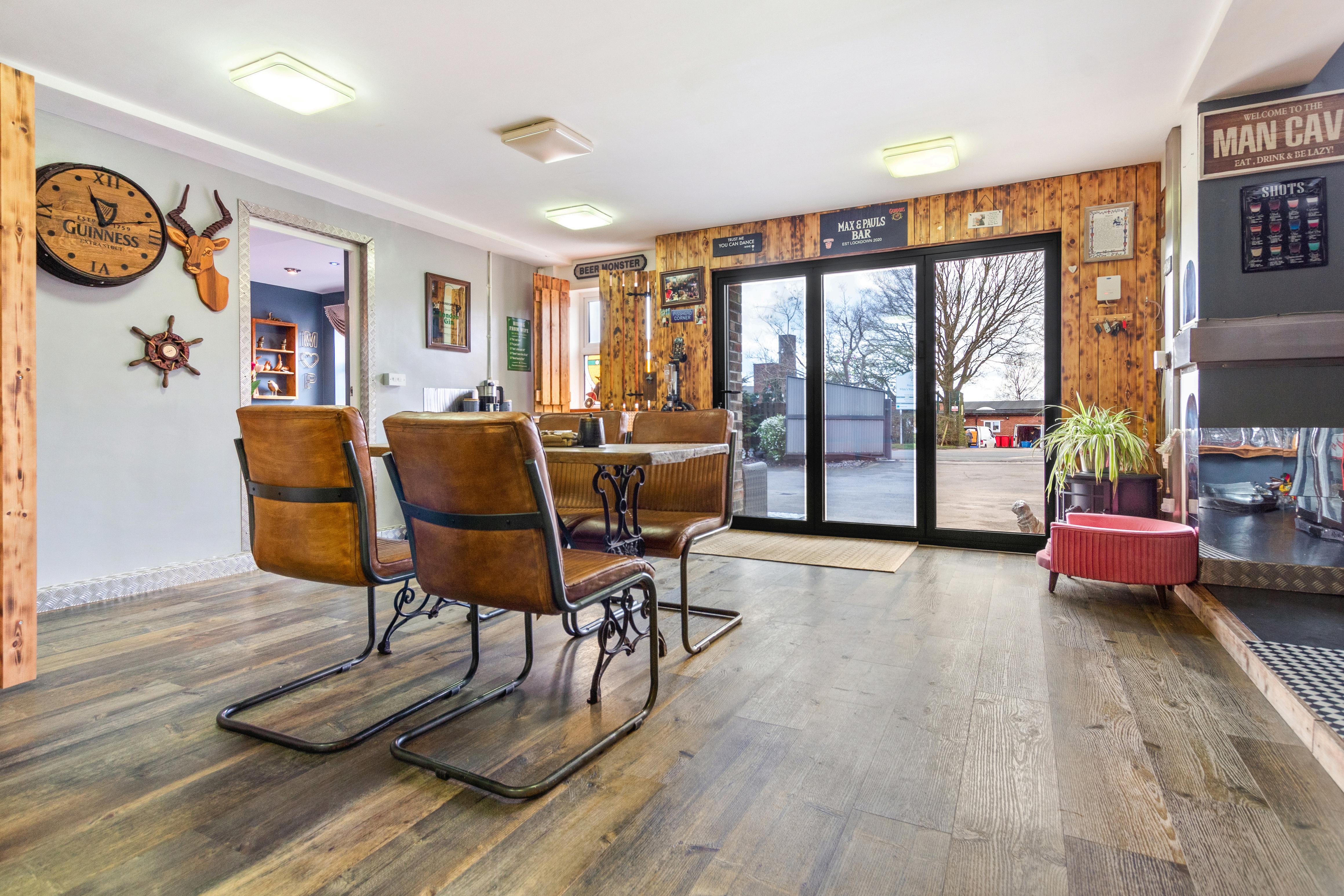 The transformation of a former garage space into a modern Bar Room adds a touch of sophistication, featuring a wooden bar and bi-fold doors that open out to the front garden area, perfect for hosting gatherings and creating lasting memories. Additionally, a WC and multi-use Workshop Room offer flexibility and functionality.