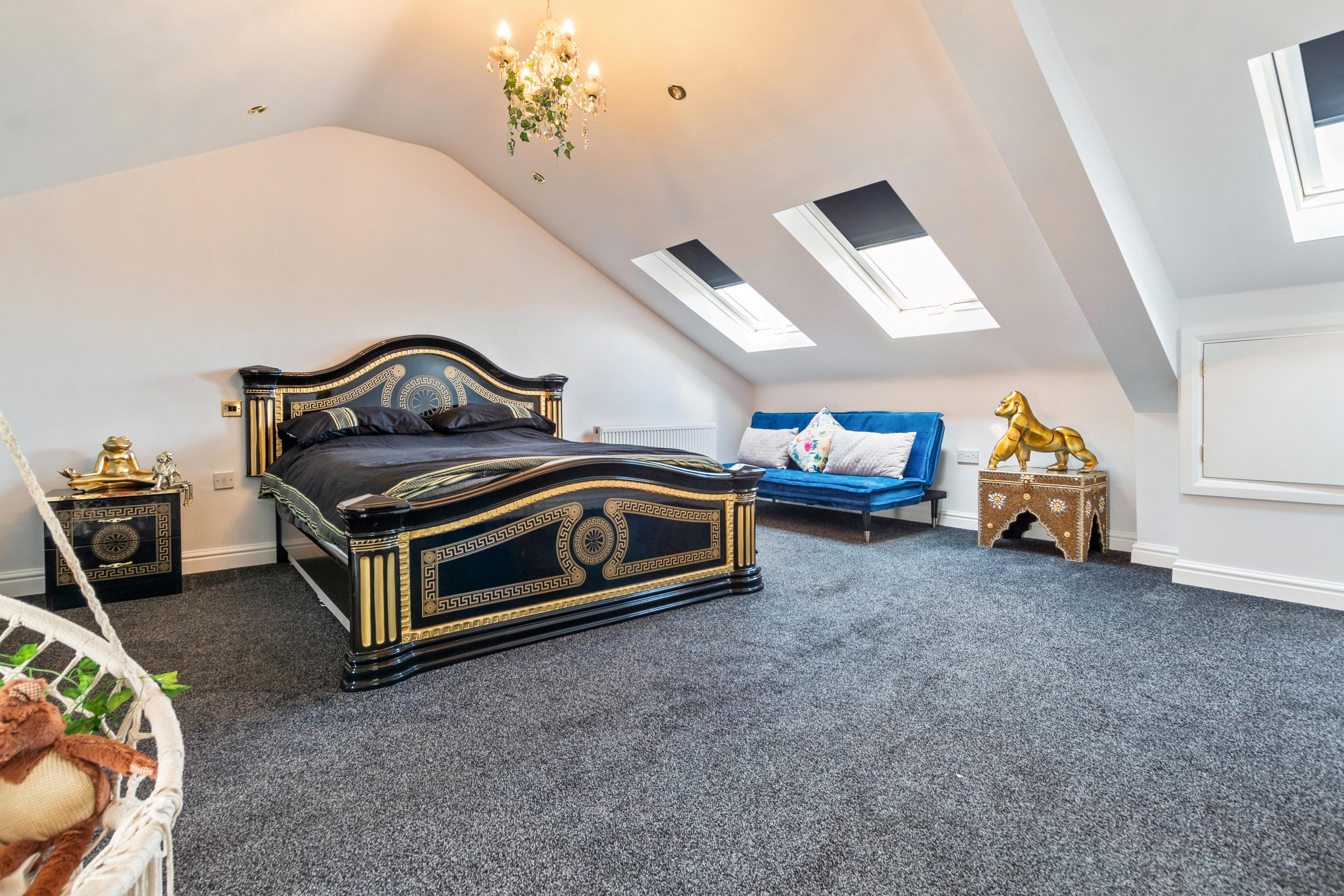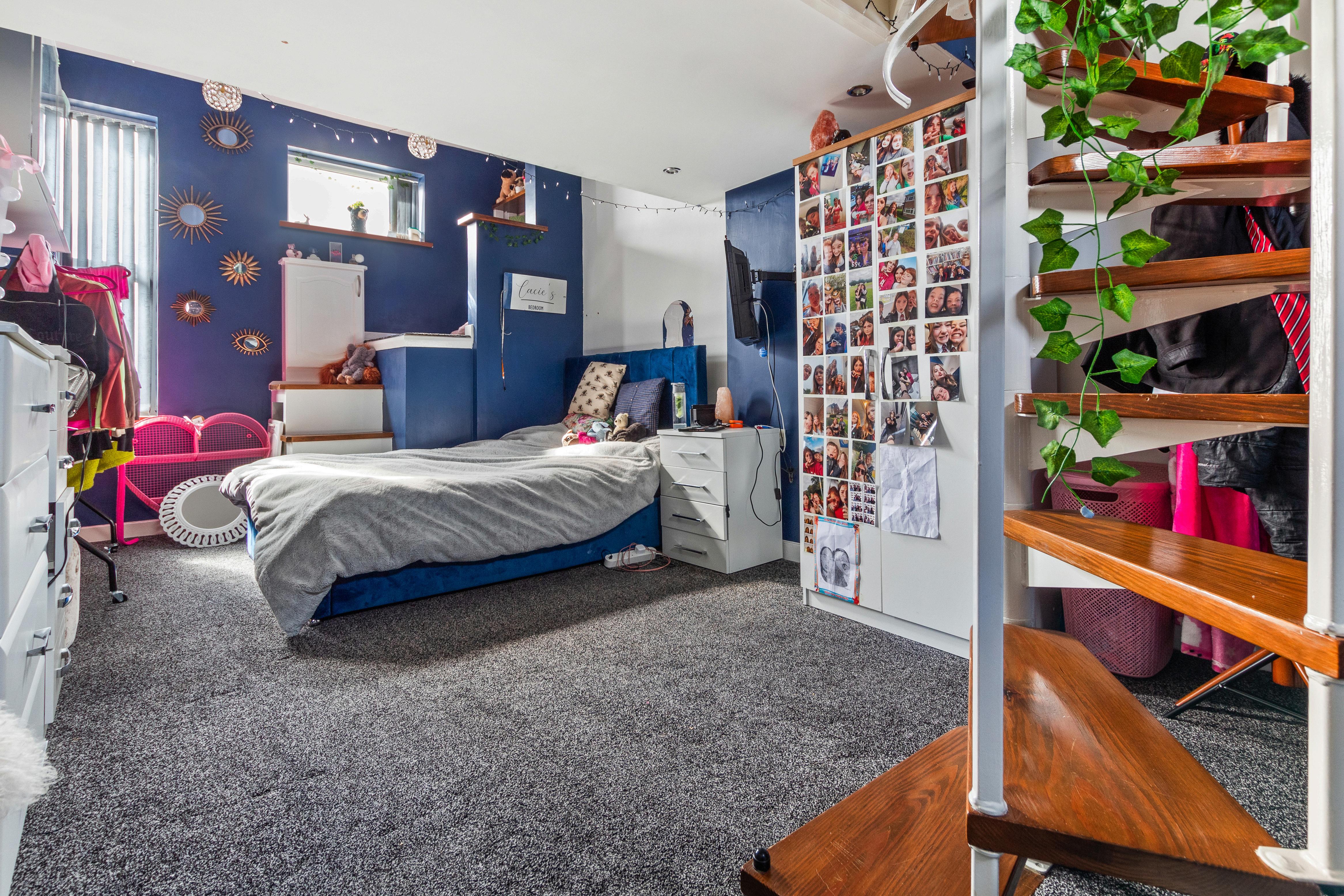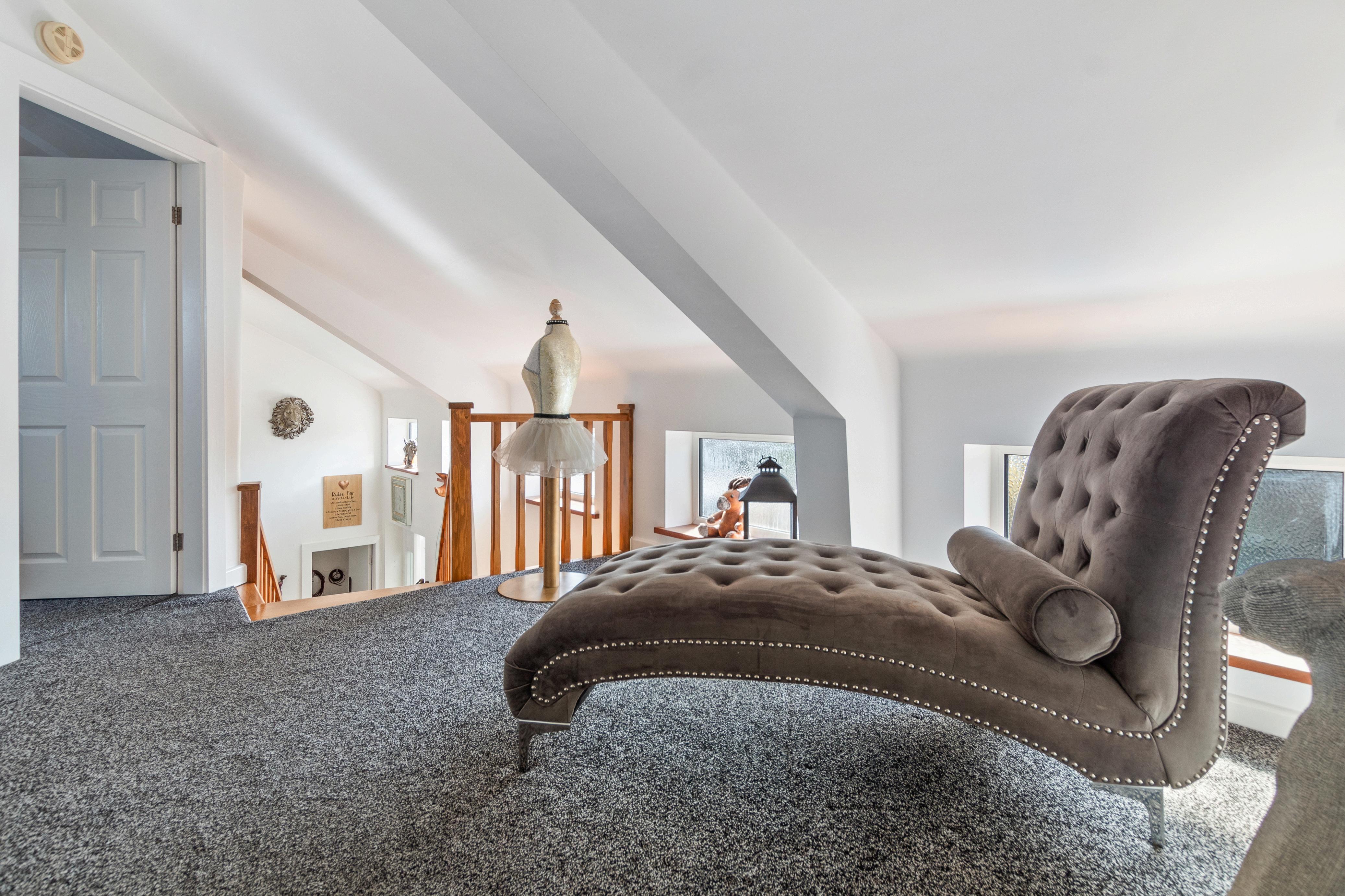 Off the lounge, discover a versatile family room or additional bedroom, featuring a unique spiral staircase leading to a galleried mezzanine floor, ideal for use as a home office or creative space. The ground floor also hosts two bedrooms and a family bathroom, complete with a luxurious corner bath and separate shower, providing ample accommodation for family and guests.