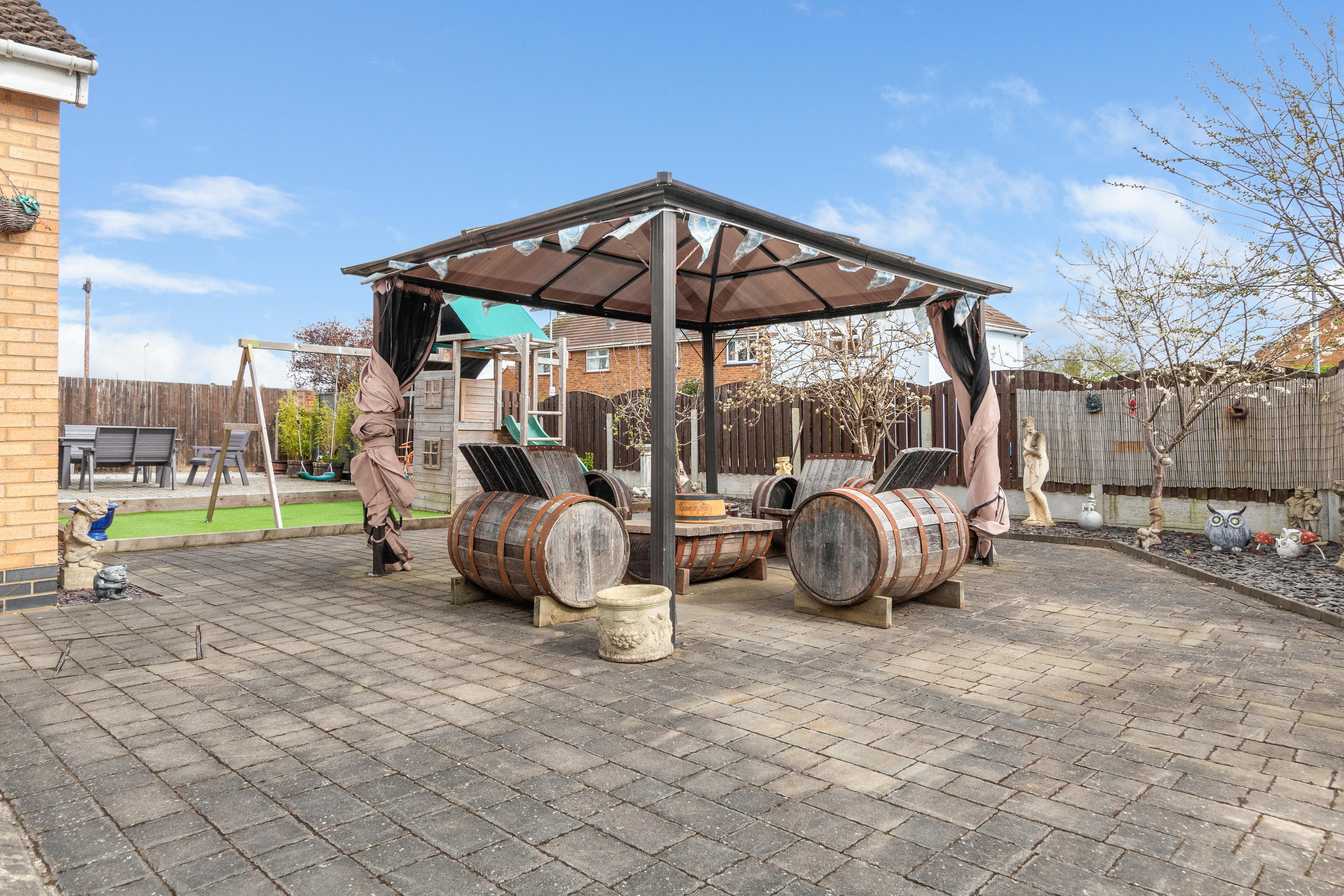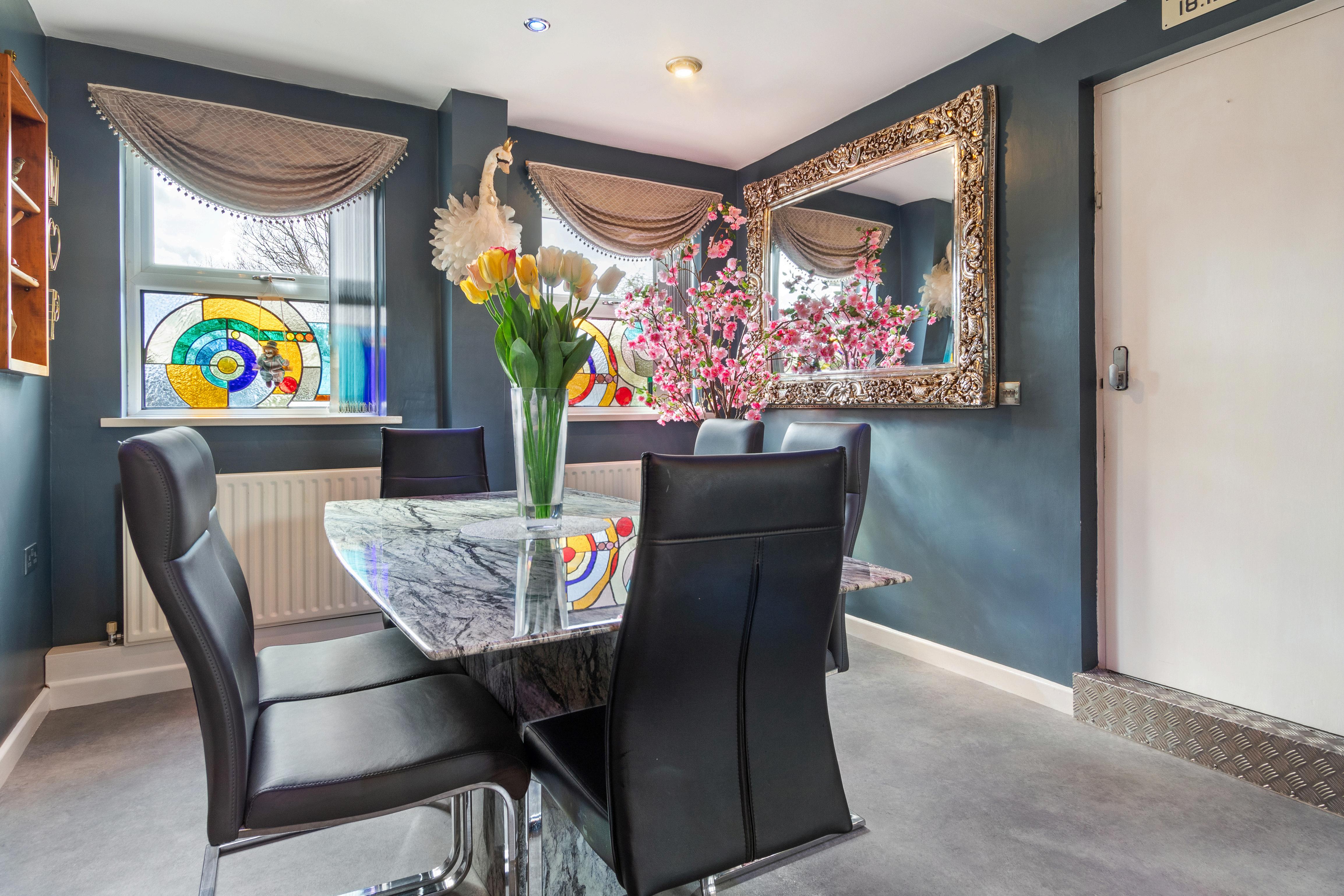 Outside, Electric double gates provide access to the front entrance, offering off-road parking for multiple vehicles, including ample space for a motorhome or caravan, along with a single garage for added convenience. The easily maintained rear garden is a tranquil retreat, featuring a decorative patio area with a large pergola, astro turf play area, and a separate driveway entrance. The property also benefits from CCTV and alarm systems for added security, as well as personally designed stain glass windows to stay as a feature within the property.