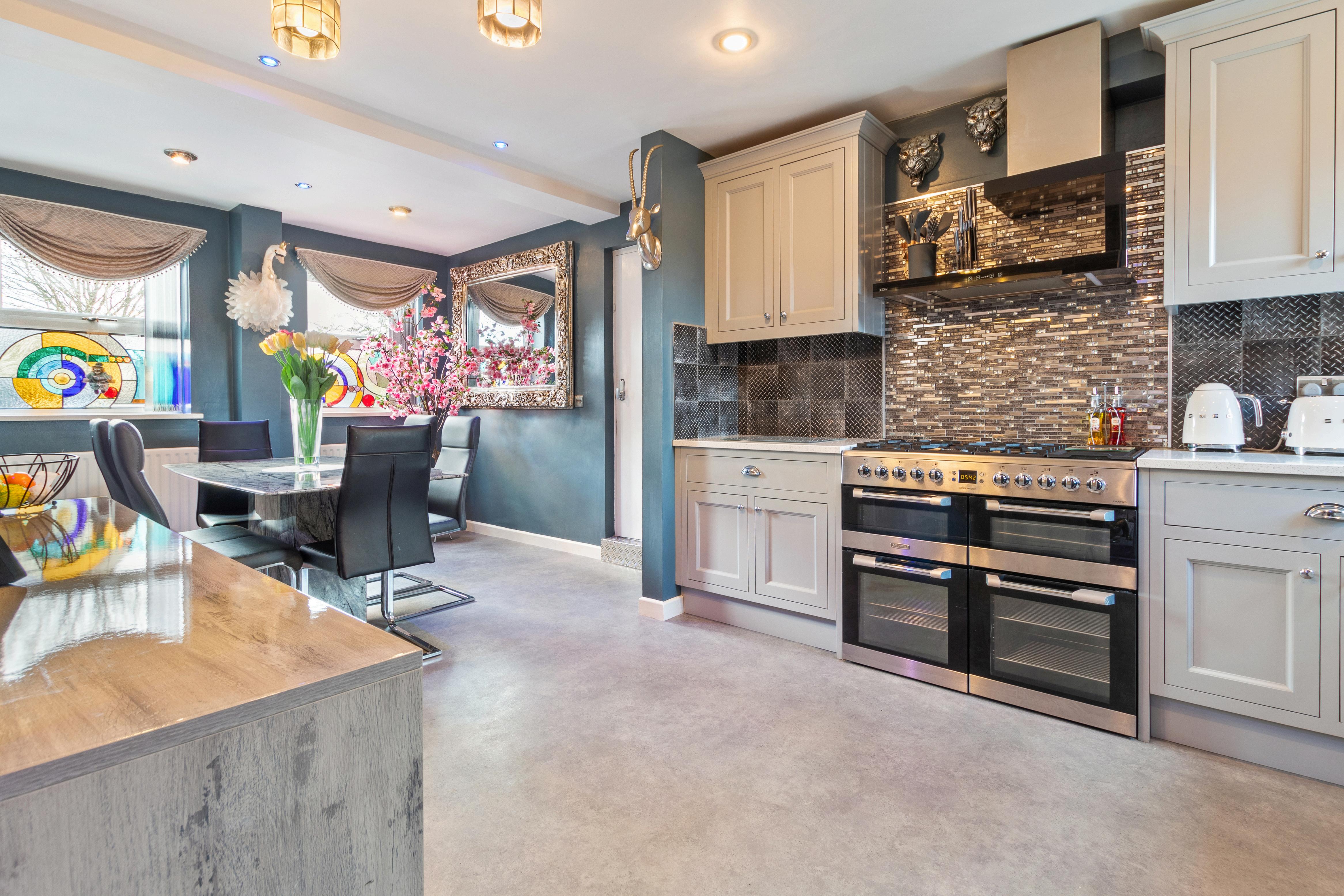 Step through the grand front door into the welcoming inner entrance hallway, where you'll find access to convenient amenities such as a cloakroom and utility room. Continue into the stunning lounge, adorned with a feature fireplace and wooden stairs leading to the first floor, setting the tone for elegant living. The modern fitted kitchen diner is well equipped, complete with a charming Belfast sink and and Quartz worktops perfect for both everyday meals and entertaining guests.
