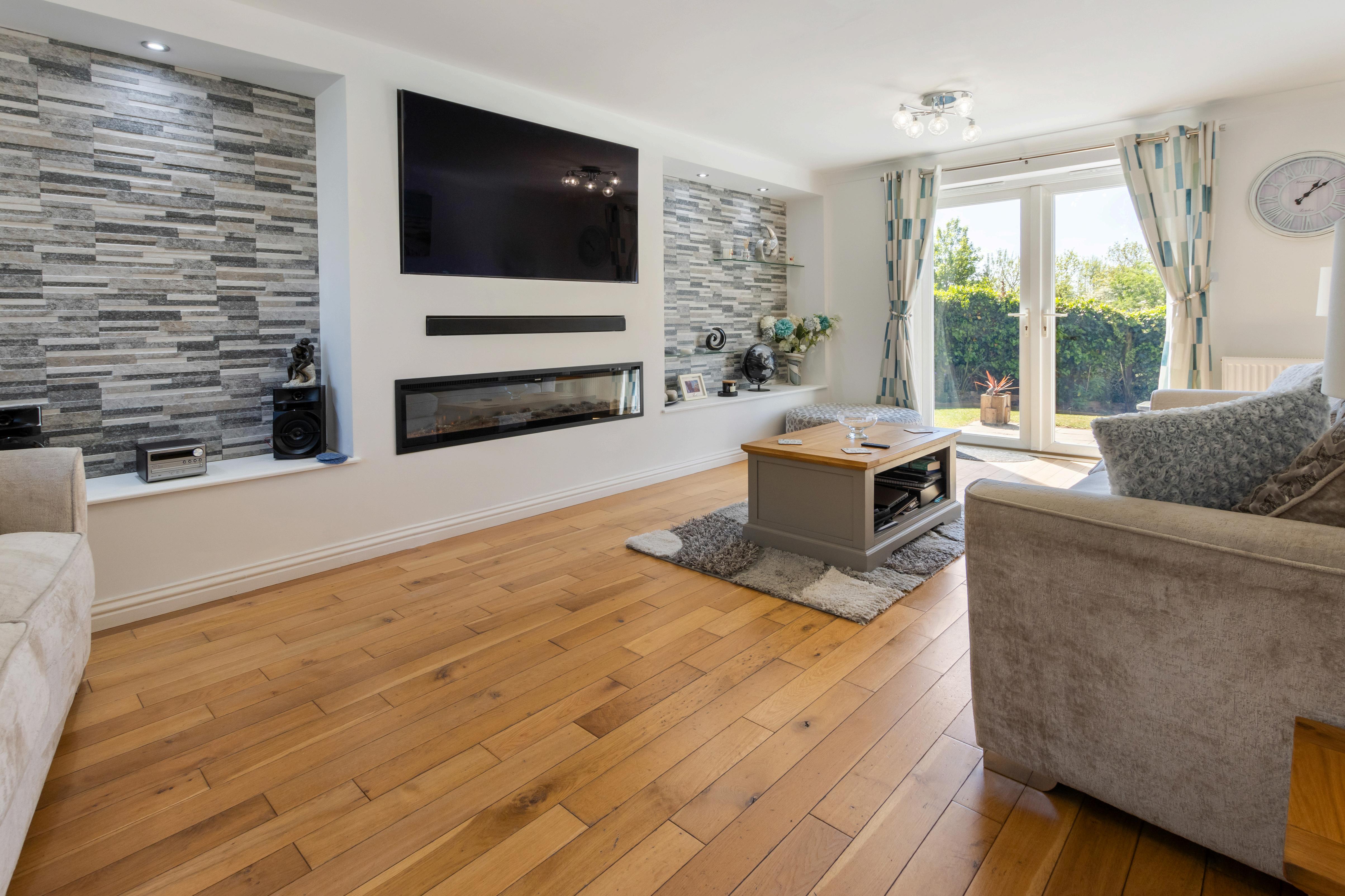 This luxury turn-key property has been thoughtfully updated throughout to the highest standards, offering exceptional quality and attention to detail at every turn. Upon entering, you're welcomed into a spacious central hallway with a solid oak floor that extends into the dual-aspect lounge. This elegant space features a striking media wall with integrated storage, remote-controlled spotlights, and an electric fireplace. French doors open out onto a newly landscaped rear garden and patio perfect for alfresco dining or entertaining guests under the retractable awning.