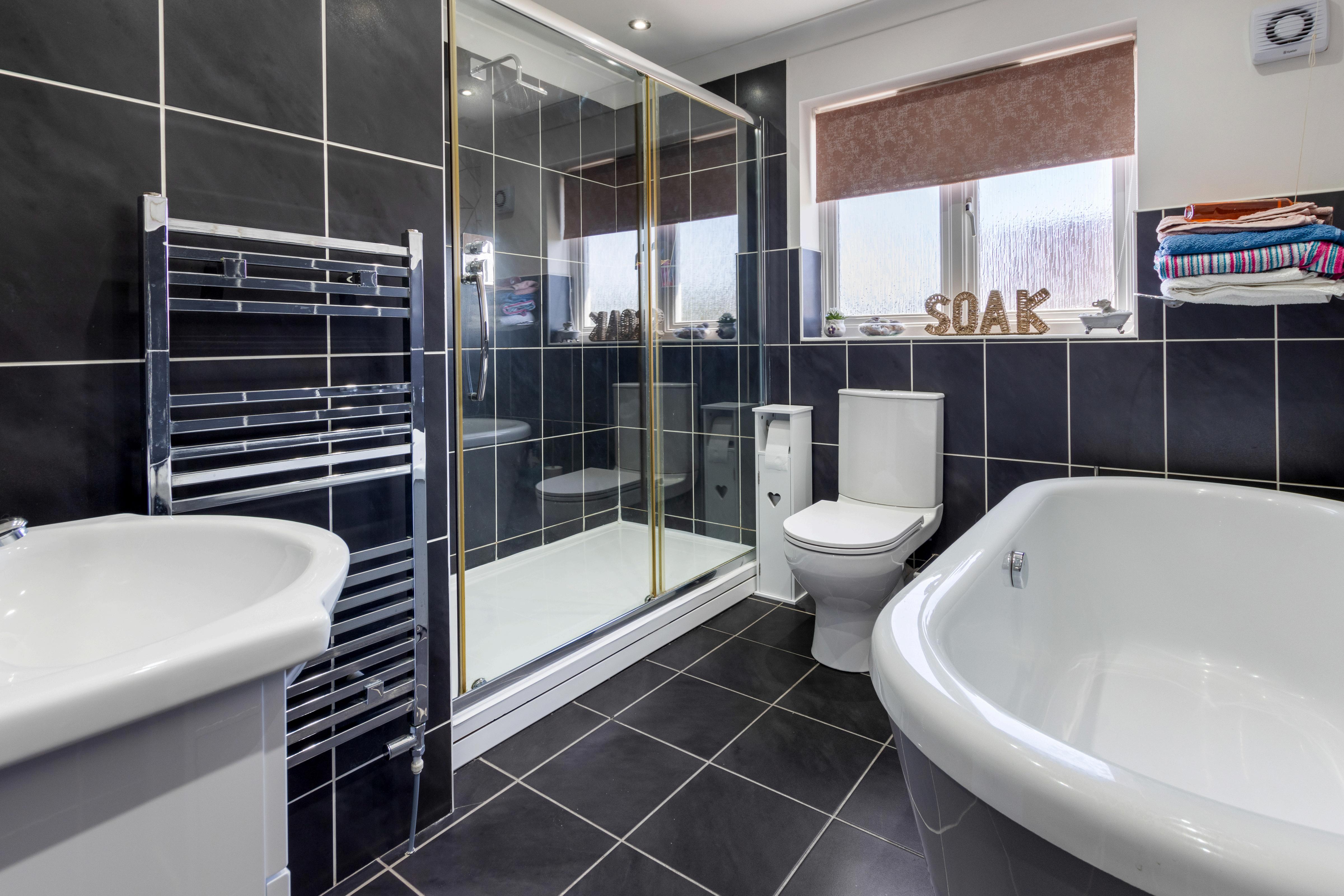 Upstairs, four generously sized bedrooms provide excellent family accommodation. The principal bedroom features a luxurious refitted en-suite shower room with walk-in enclosure, modern vanity unit, heated wall mirror, and premium tiling. The contemporary family bathroom is equally impressive, comprising a freestanding bath, walk-in shower, vanity sink, wall mirror, WC, refreshed décor, and spotlight fittings.