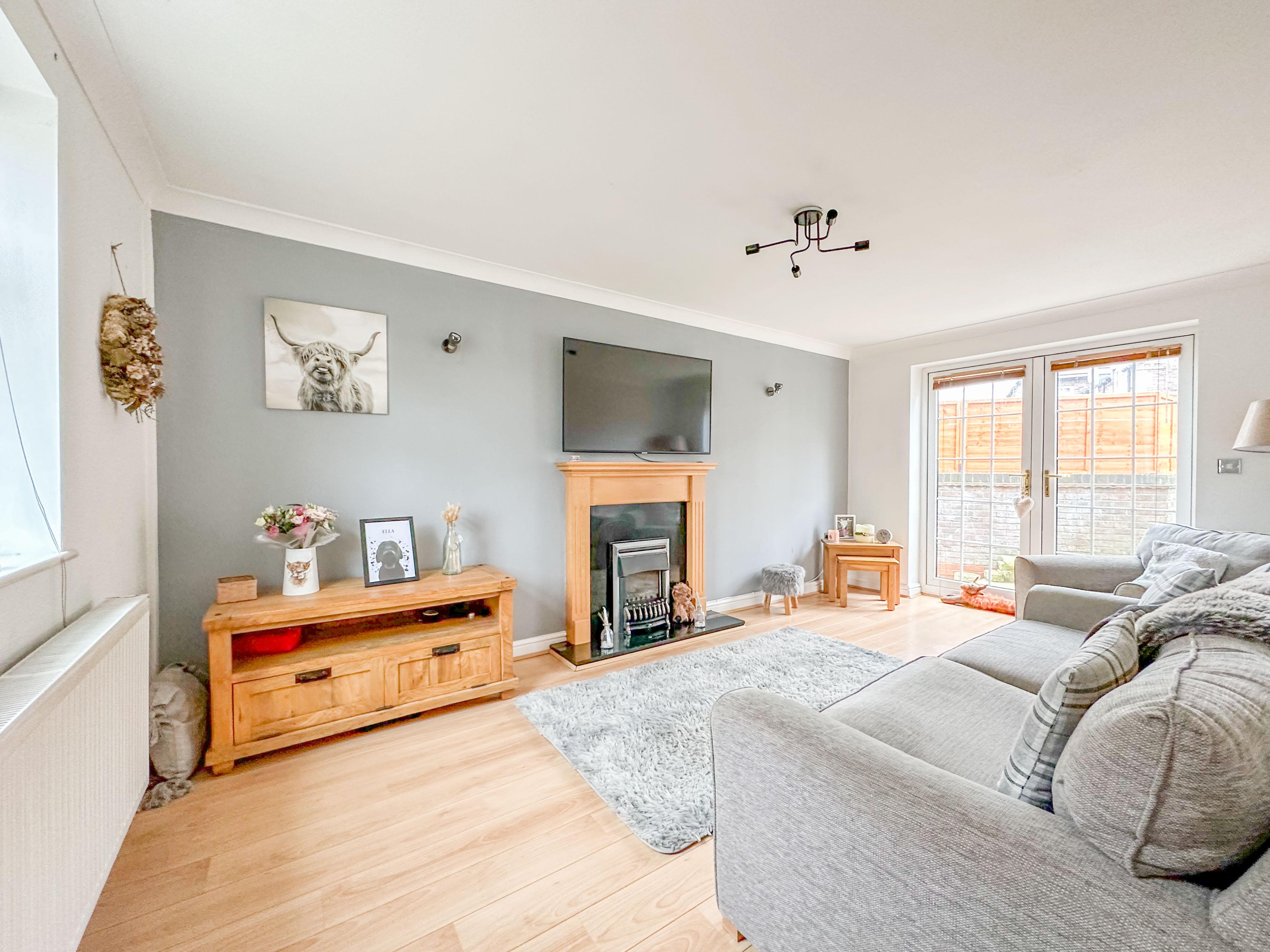 The welcoming reception hallway opens to the staircase leading to the first floor and allows access in to the light and airy dual aspect lounge with a feature fireplace and French doors, a modern fitted kitchen with built-in oven and hob and stainless-steel sink, a utility room and a ground floor cloakroom with a hand wash basin and W.C.