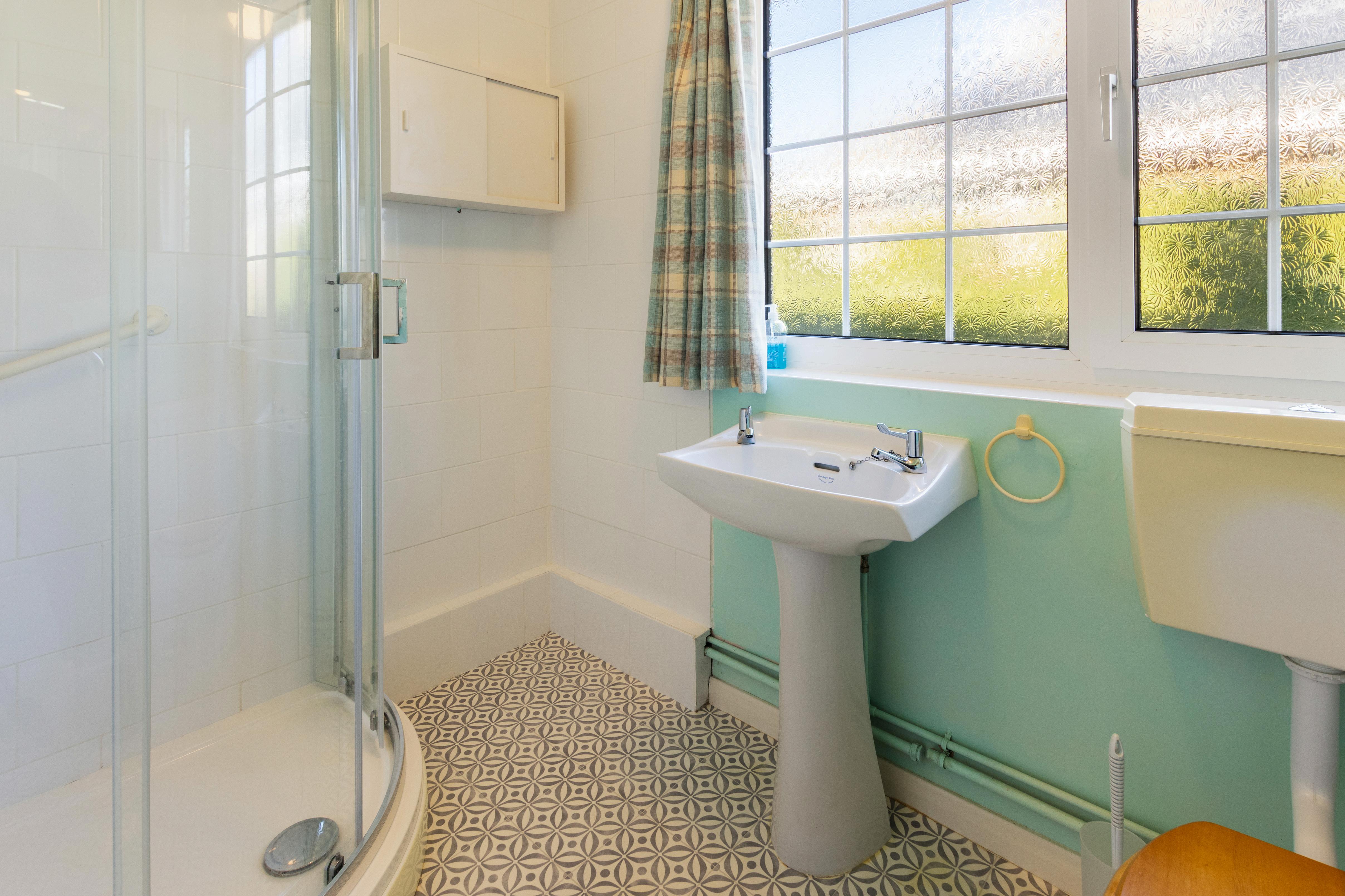 The kitchen is compact yet practical, with white cabinetry, and ample natural light from the rear window. A frosted-glass door provides access to the rear porch and garden.