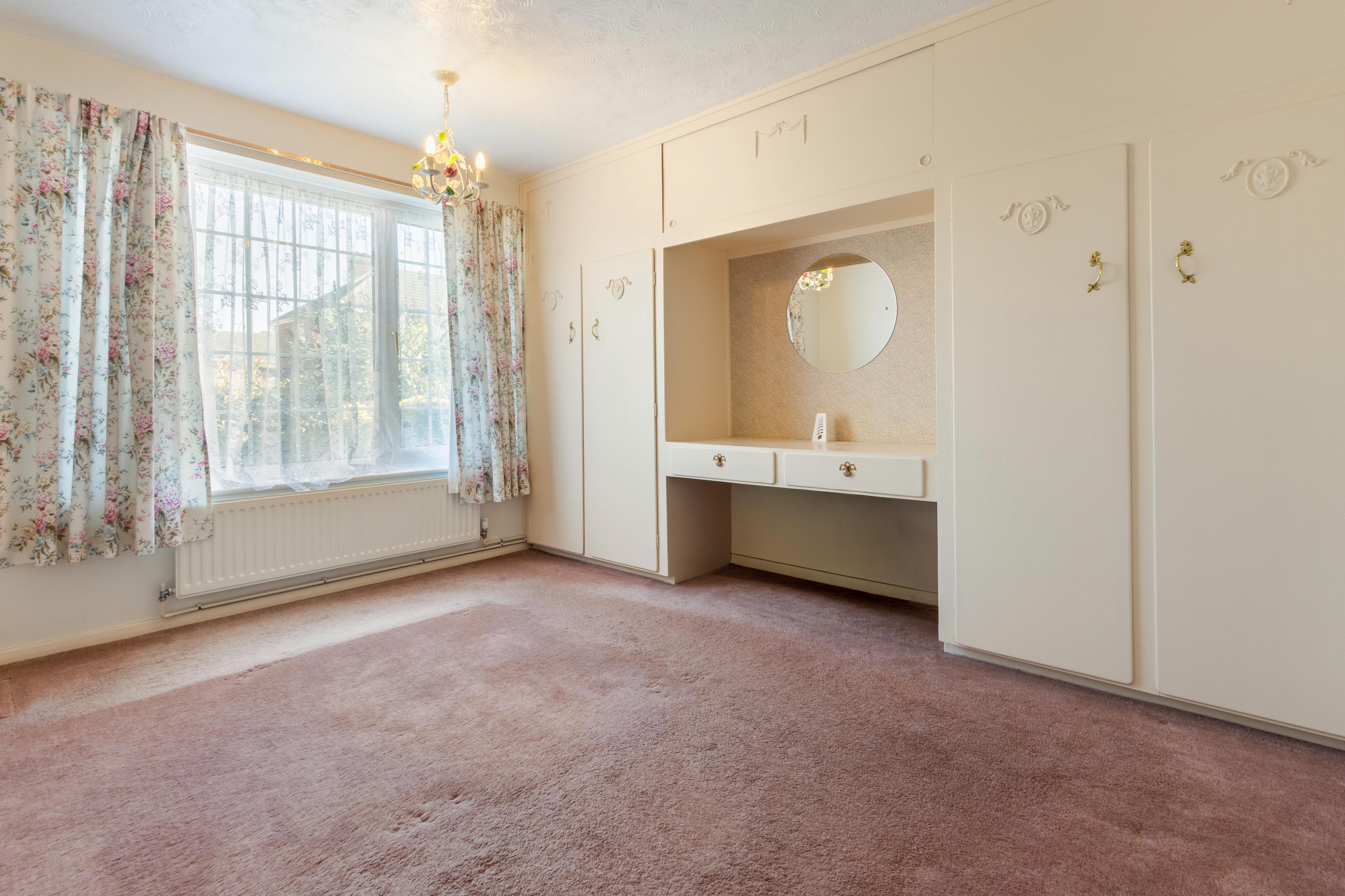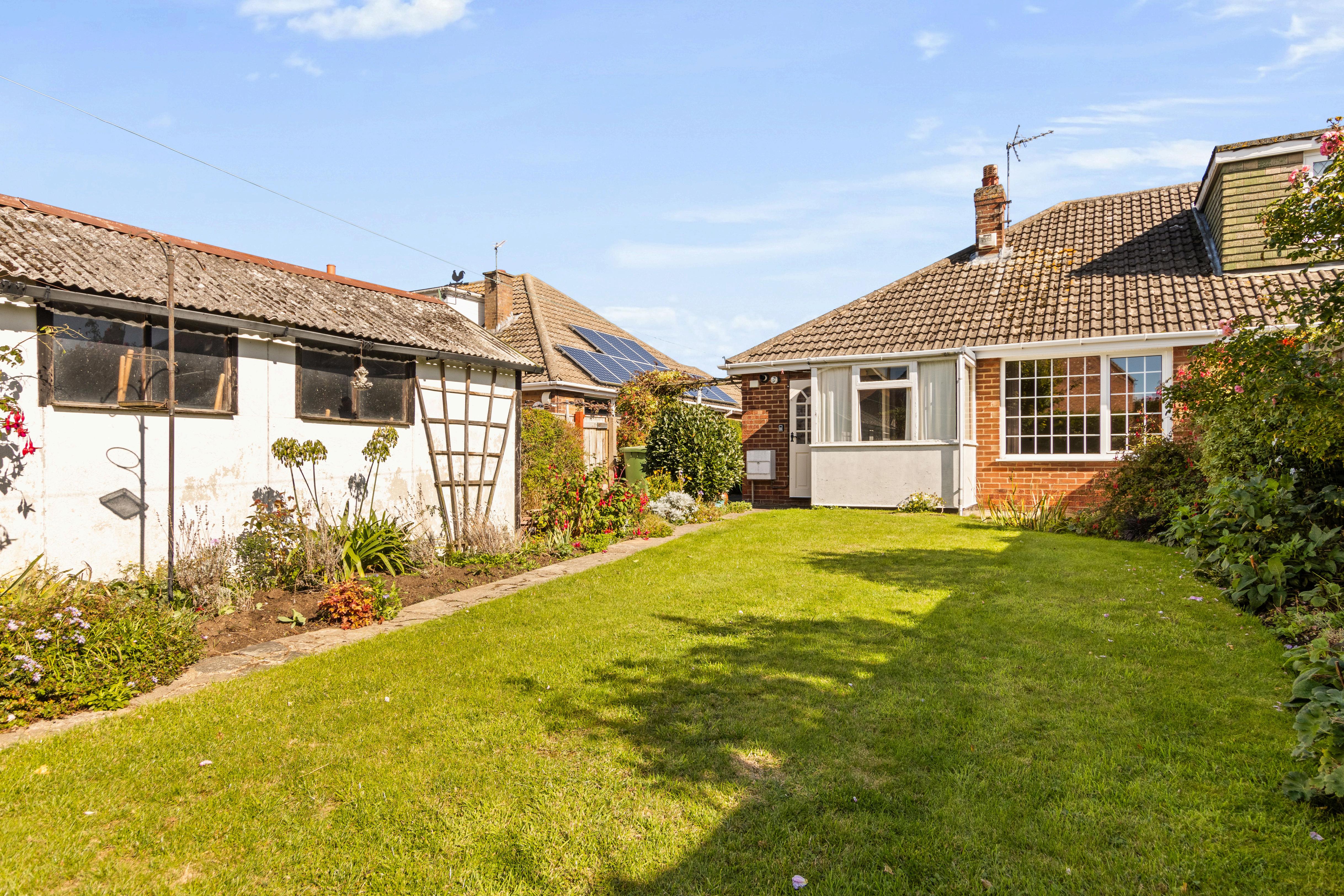 To the front, a paved driveway provides off-road parking, bordered by gravel and mature shrubs for lowmaintenance appeal. A side path/driveway leads to a generous rear garden, featuring a lush lawn, flower beds, and a garage ideal for storage or conversion into a workshop or garden room. The garden enjoys a sunny aspect and a sense of privacy, with neighbouring homes visible but unobtrusive.