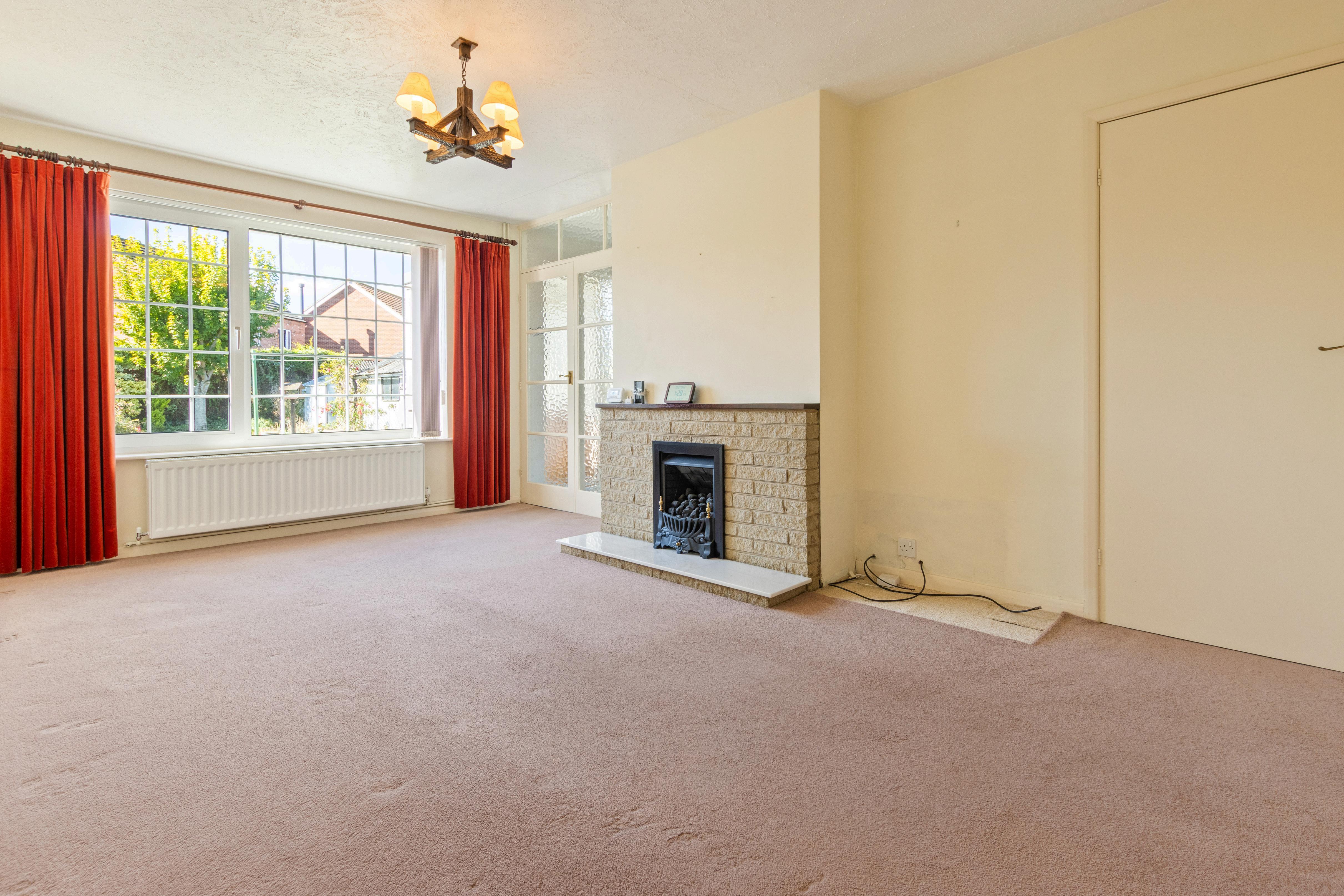 The lounge is a bright and welcoming space, featuring a large rear-facing window, a traditional brick fireplace with raised hearth, and a chandelier-style light fitting. Neutral tones and a light carpet create a blank canvas for personalisation.