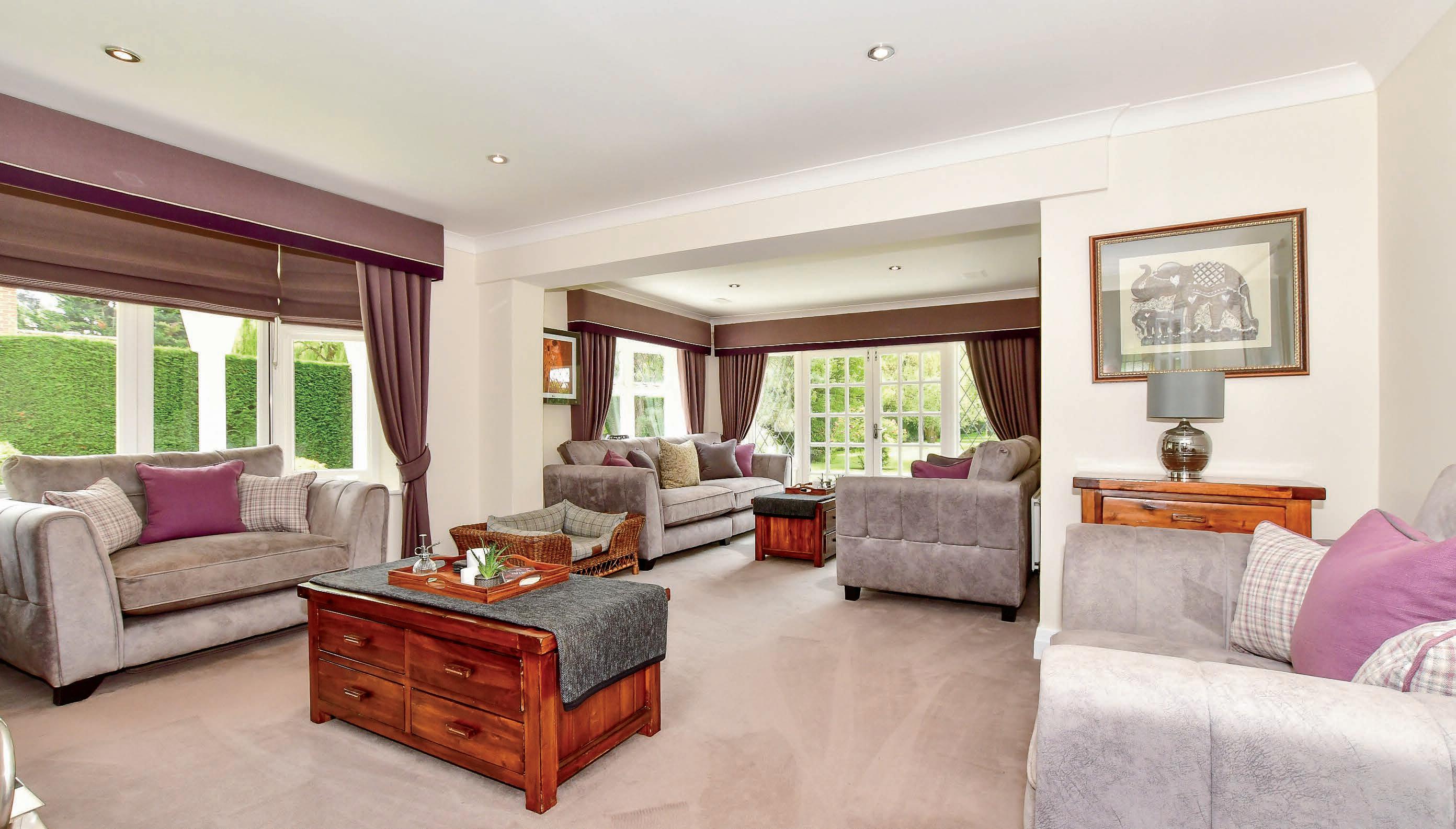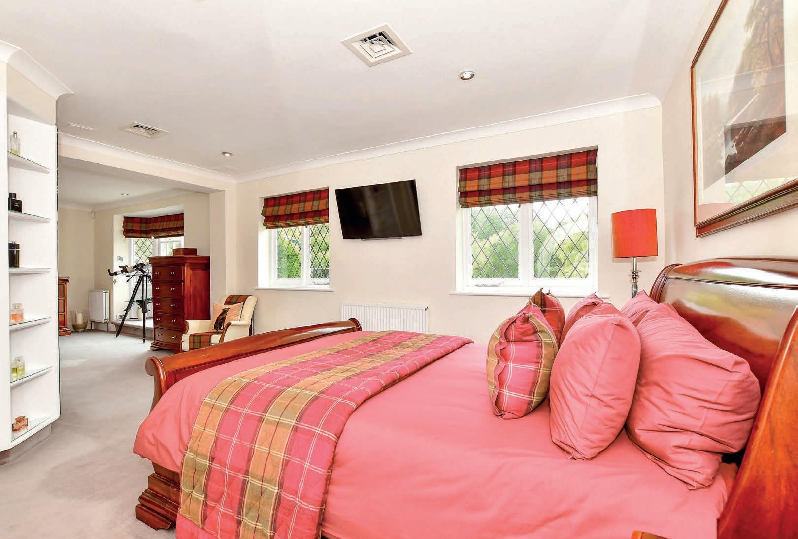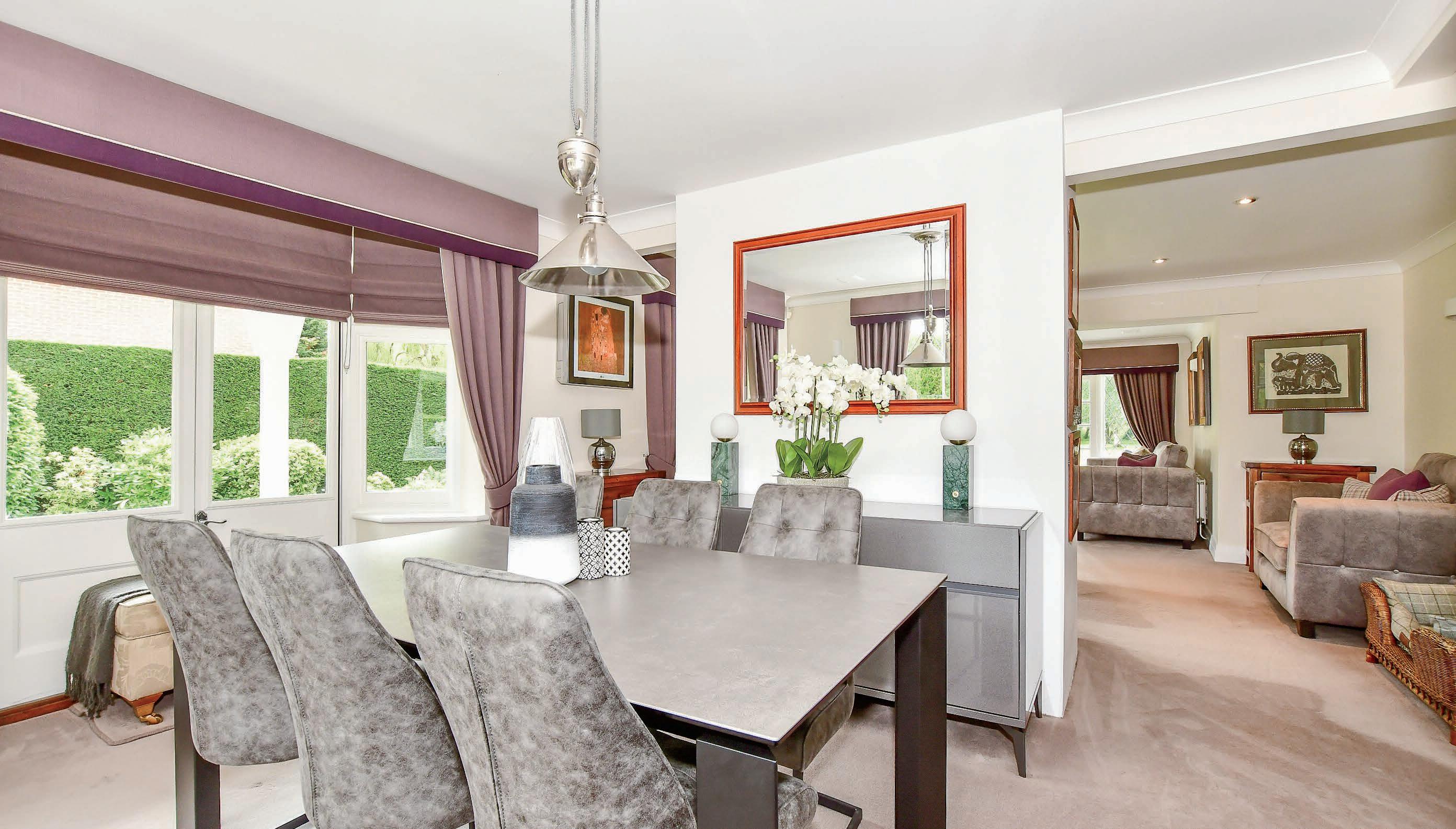 There is a spacious entrance hall with access to a contemporary cloakroom and a coat cupboard and porcelain floor tiles that continue through into the light and bright, dual aspect kitchen and breakfast area. This includes a seven ring range cooker and bespoke Shaker style wood units designed by Elegance Kitchens housing an integrated fridge, dishwasher and a butler’s sink. The dresser style bespoke units carry on through to the large breakfast area that has French doors to the terrace and wonderful views across the garden. The kitchen also has a door to the double garage with automatic remote control doors, an electric car charging point and access to the large, newly fitted utility room with laundry facilities, a new Worcester boiler, an American fridge freezer, the alarm system control panel and a door to the garden.