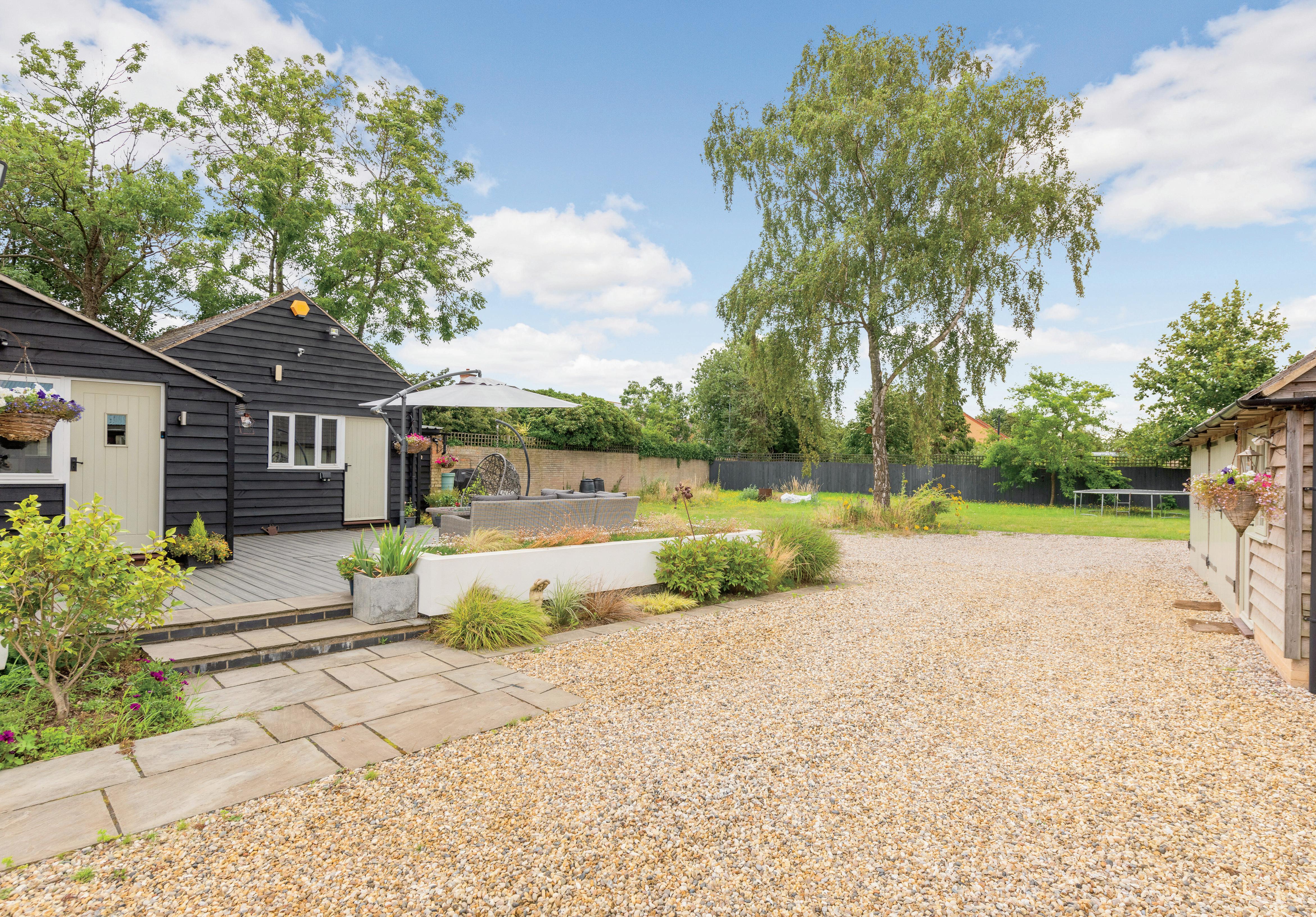 Behind a brick wall with electric timber gates, there is a large gravel driveway providing ample parking and turning space, along with access to a timber-clad double garage and workshop. The part-walled rear garden has been landscaped, including a composite deck with raised planters surrounding and steps down to a large lawn.