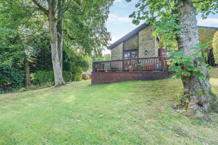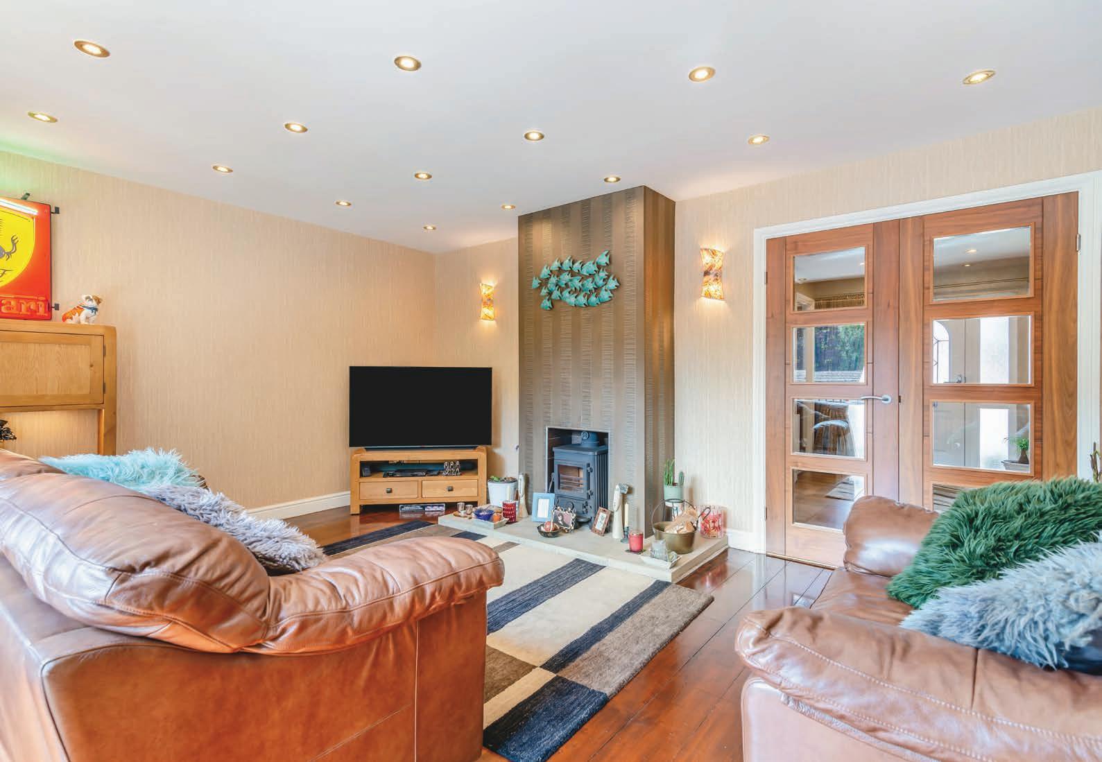 French doors open directly into the lounge, a generous room with double glazed patio doors opening onto a terraced balcony, which commands an impressive outlook over the garden, with a stunning tree lined vista in the backdrop. This room has a wood burning stove to the chimney breast and exposed floorboards.
