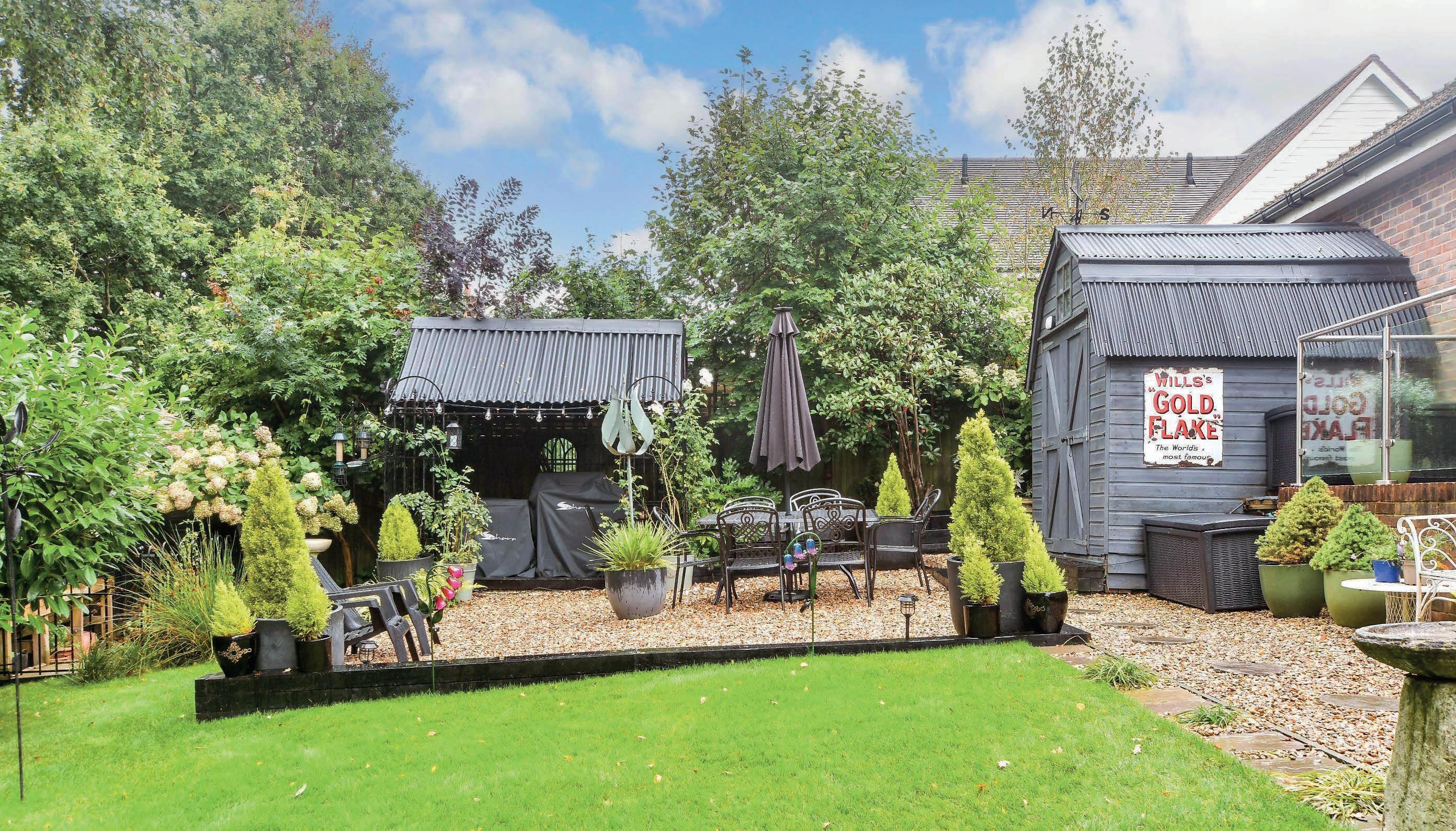 A flagstone path leads to an American style barn/workshop with power and lighting. There is a second wood storage shed and a large gravel garden area with a BBQ, gazebo, a sunken vegetable garden with a garden shed, an outside tap and three further tap outlets as well as a cream-coloured gazebo with a mature trellis and a water feature. While the front garden includes a seating area, a rainwater harvester, two acer trees and an apple tree with a compost bin behind the tall copper beech hedge boundary.