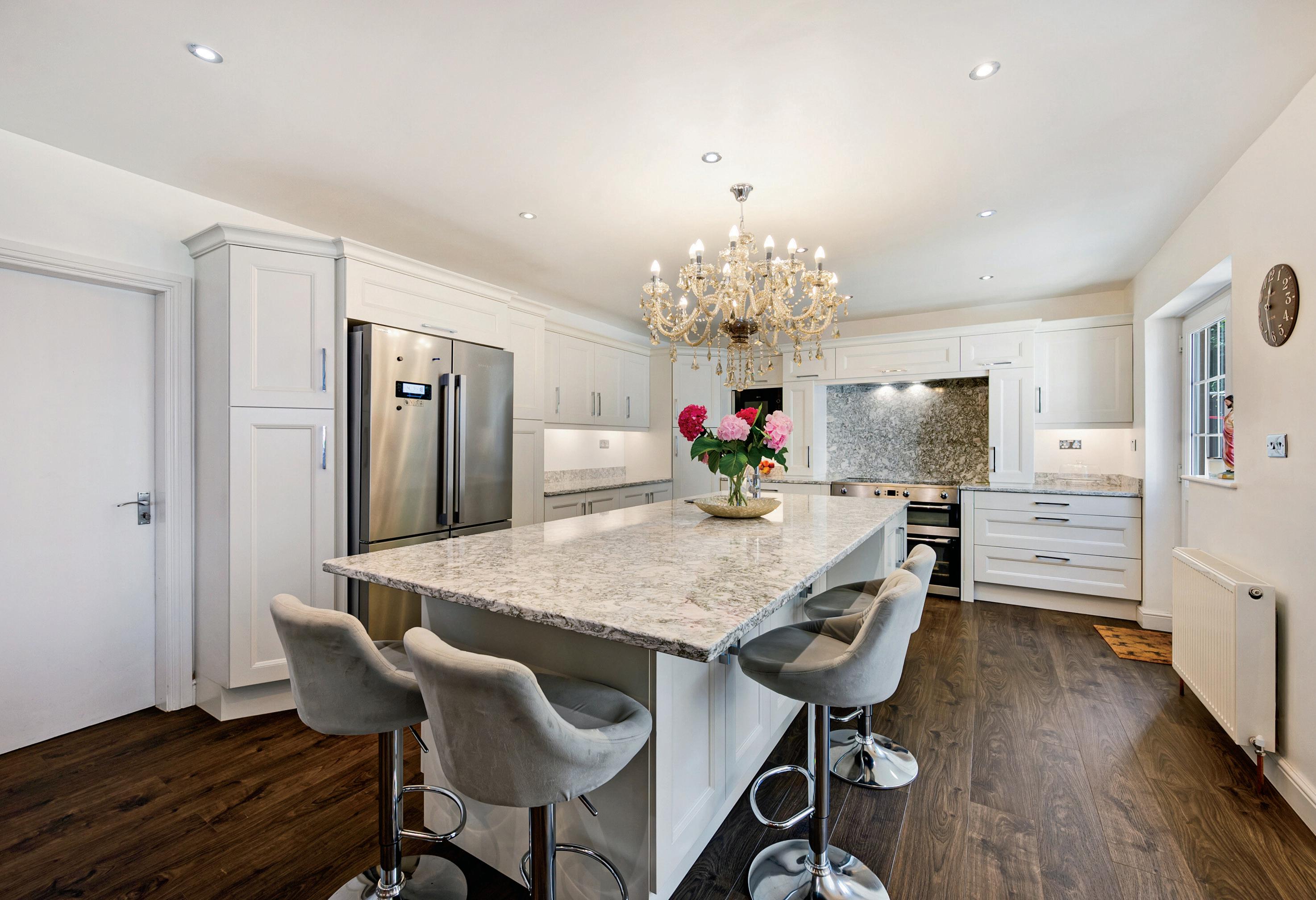 The accommodation has been much improved and is in excellent decorative order, briefly comprising an excellent size reception hallway with a guest w.c., a generous formal lounge with a recently fitted gas fire and bi folding doors with internal blinds leading out to the rear gardens. The additional living room is ideally positioned next to the stunning fitted dining kitchen featuring a beautiful, central island with seating, fitted wall and base units and integrated appliances, this room opens into a light and airy dining room with doors leading to the beautiful, rear garden. Furthermore, there is a great study with fitted bespoke furniture.