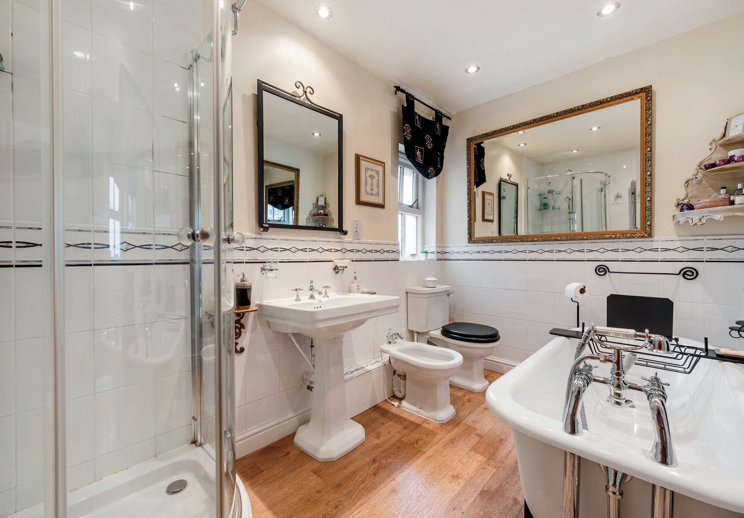 To the first floor there is a spacious landing which provides access to all the first-floor rooms. The main bedroom has a dressing room and its own en-suite with bath, W.C and wash hand basin. There are three further well-proportioned bedrooms all having views over the garden. The modern house bathroom comprises a five-piece white suite, including a freestanding bath, shower cubicle, bidet, W.C and wash hand basin. There is also a spacious loft.