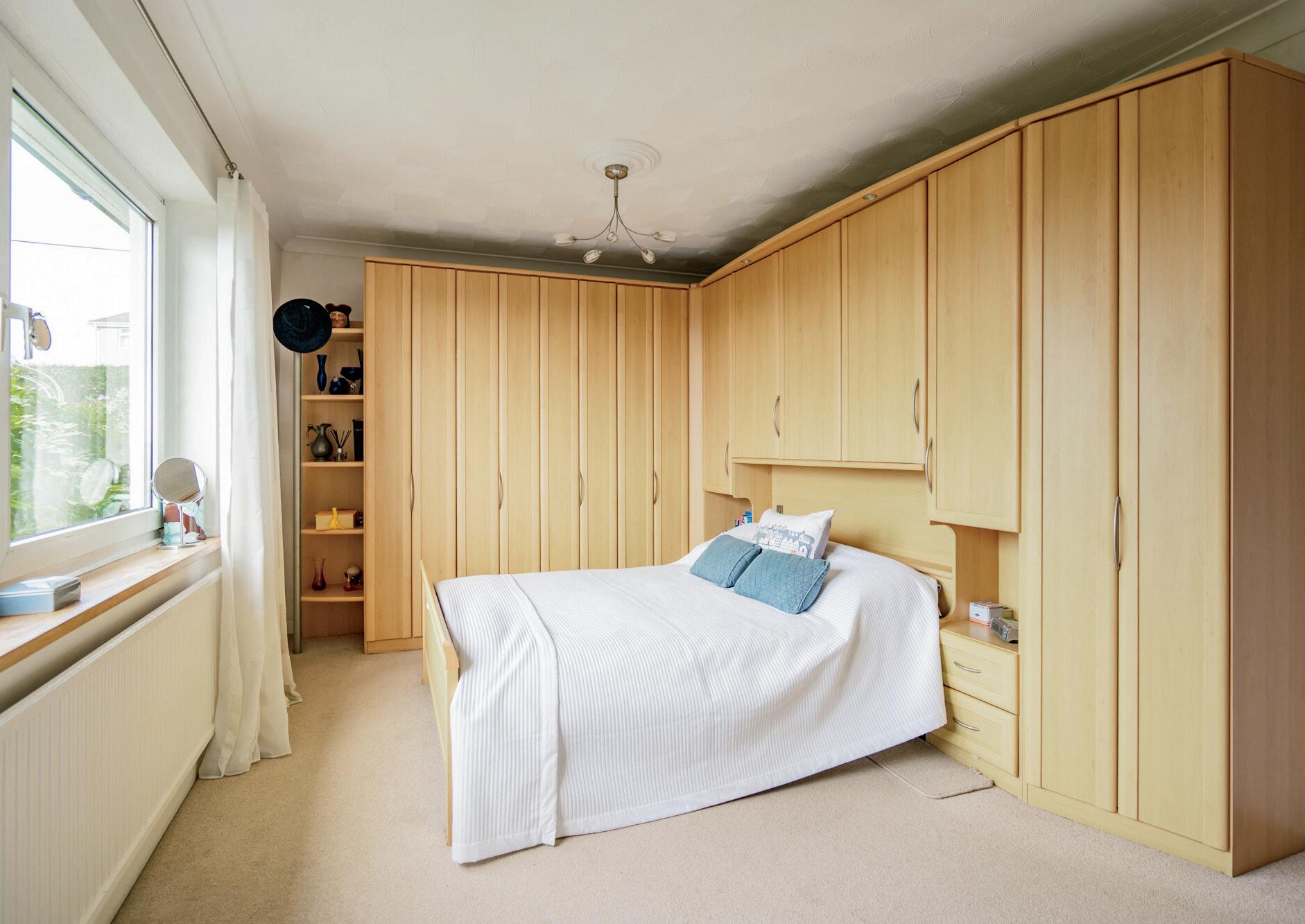 The study/bedroom two is a bright and inviting space, carpeted for comfort. A window to the side provides natural light and offers views of the superb garden. Fitted wardrobes enhance the room’s functionality, providing hanging rails and shelving.