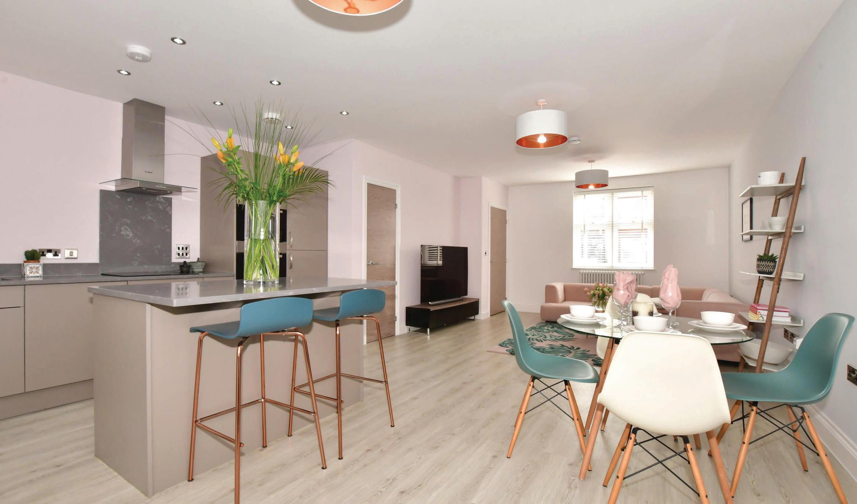 It is approached via an electronic gate with an entry phone system, CCTV and allocated parking. There is a contemporary front door leading to the hall with hard wearing Karndean flooring that flows throughout the ground floor and there are also bespoke wooden blinds on all the windows. The hall leads to the fabulous open plan, dual aspect living space that includes a kitchen, dining and living areas.