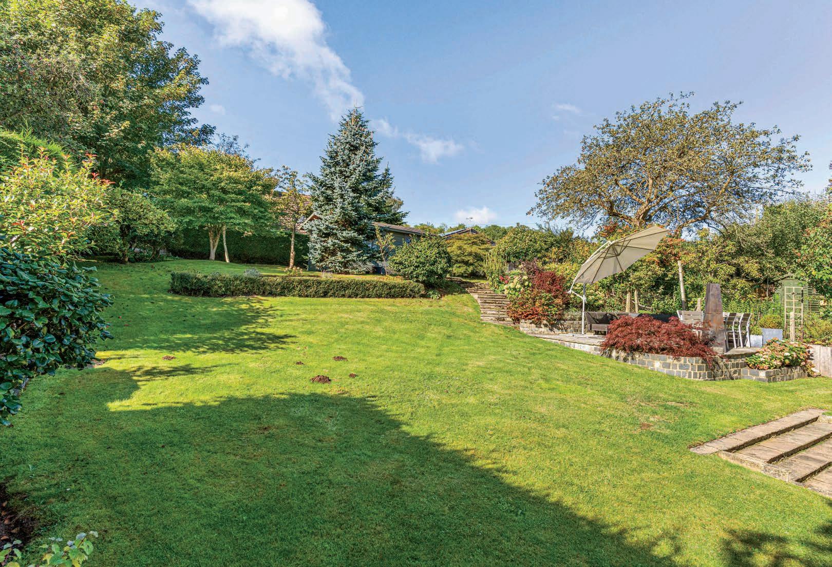 The first thing you notice when you step onto the patio is the whole garden! With its graduated slope, you are offered a view of the whole property. You can appreciate the established trees and shrubs which border and enhance this beautiful garden. There is a barbeque area tucked away on the left, and a generous terrace on the right with plenty of room for comfortable sun lounging and al fresco dining. Moving up the garden steps you have a handy storage shed, which could easily be converted into a garden cabin, with a utility space and children’s treehouse hidden away in the corner. From this viewpoint, the slate grey glazing really stands out against the white render and makes for a very attractive house.