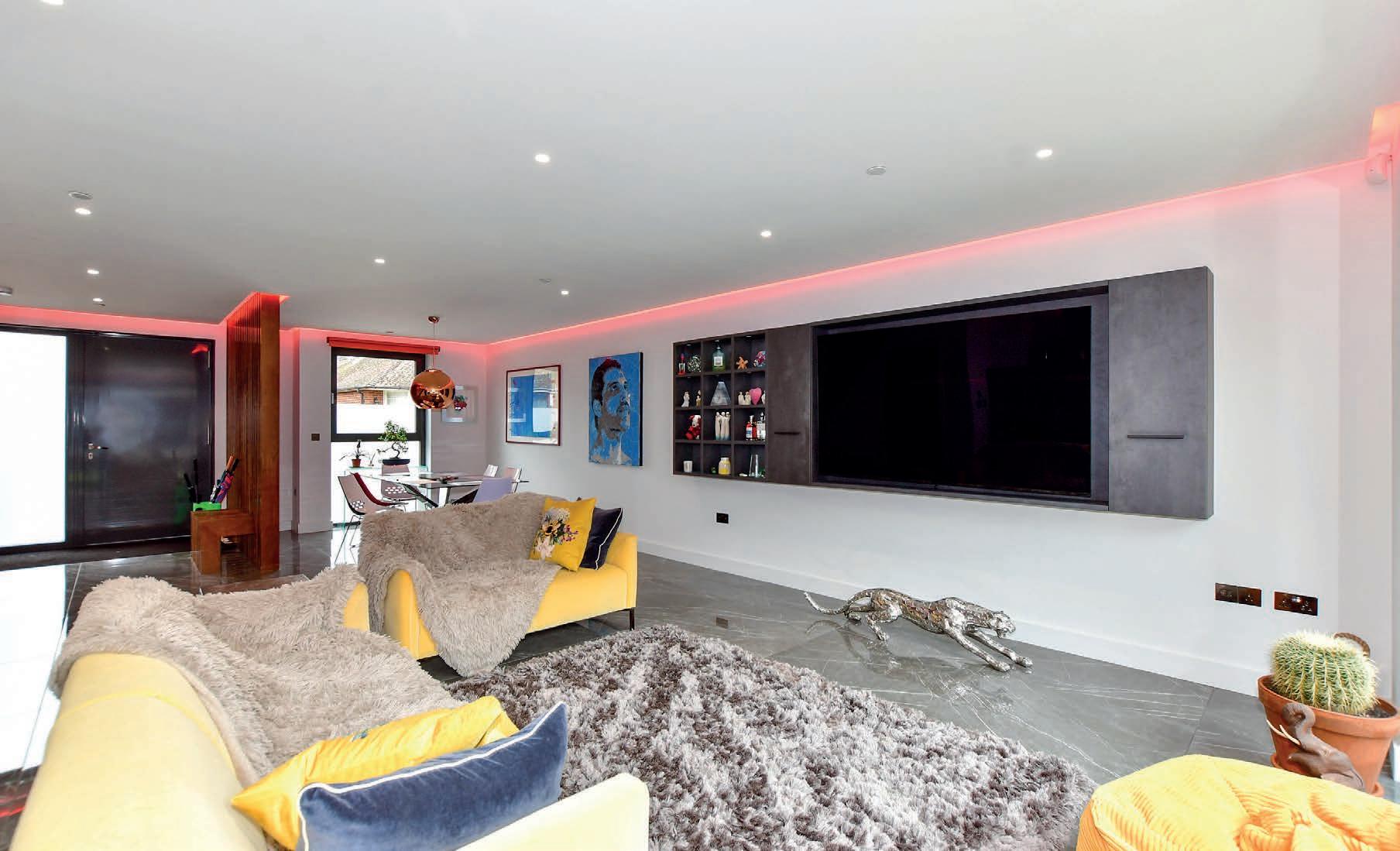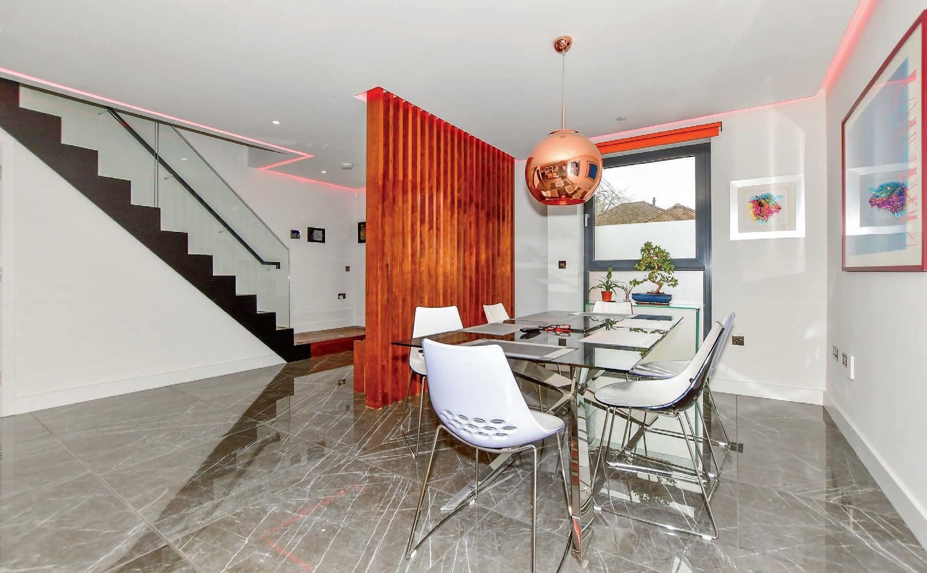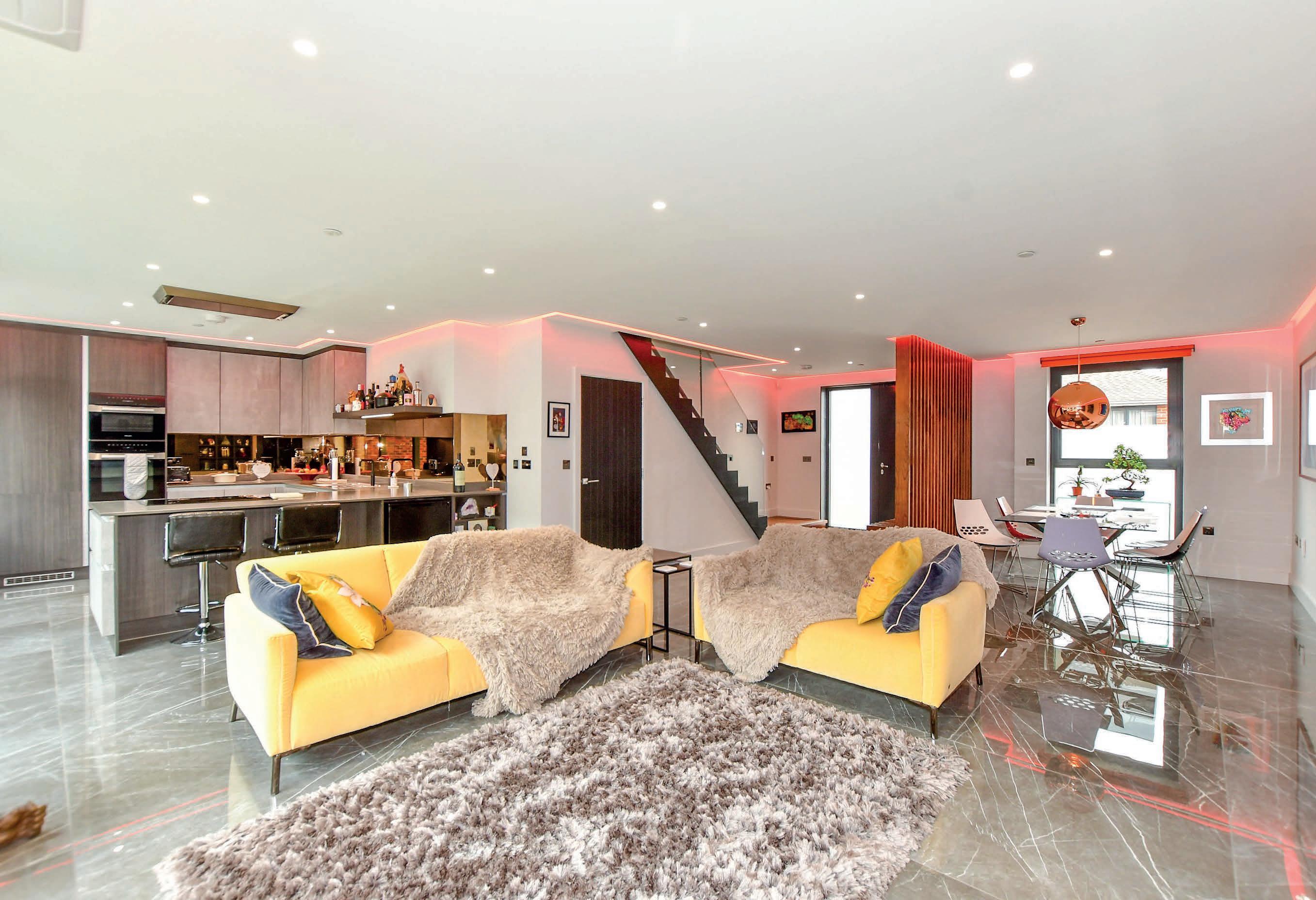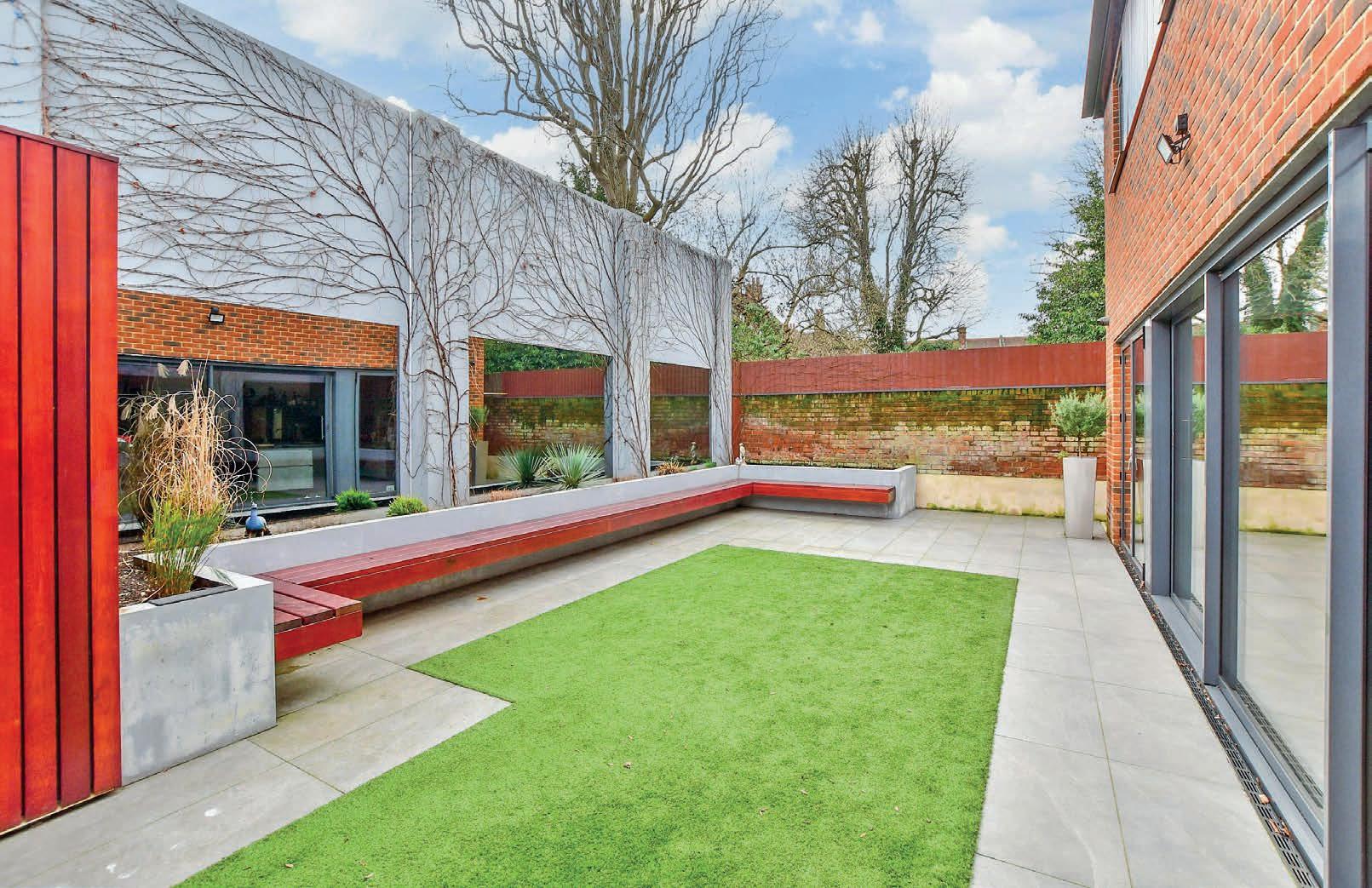 The large courtyard includes porcelain tiled outdoor seating areas and artificial grass as well as a rear wall with large mirrored insets so there is no maintenance required. There is also a side alleyway for discreetly hiding the waste bins. The garage has automatic doors and porcelain floor tiling as well as a utility area that incorporates the boiler, laundry facilities and the electronics controlling the CCTV and video systems, the underfloor heating that has been installed throughout the property and fast broadband.