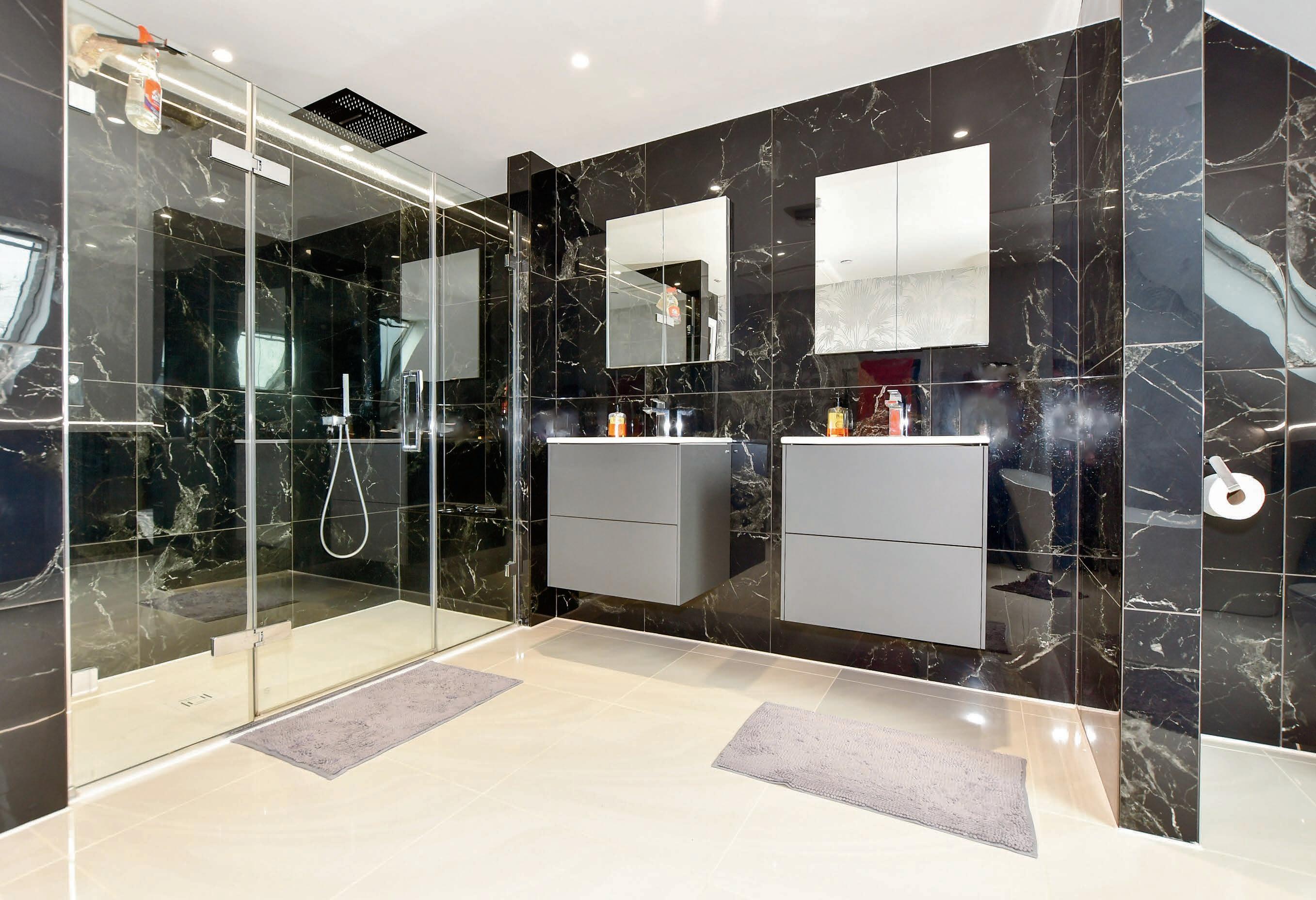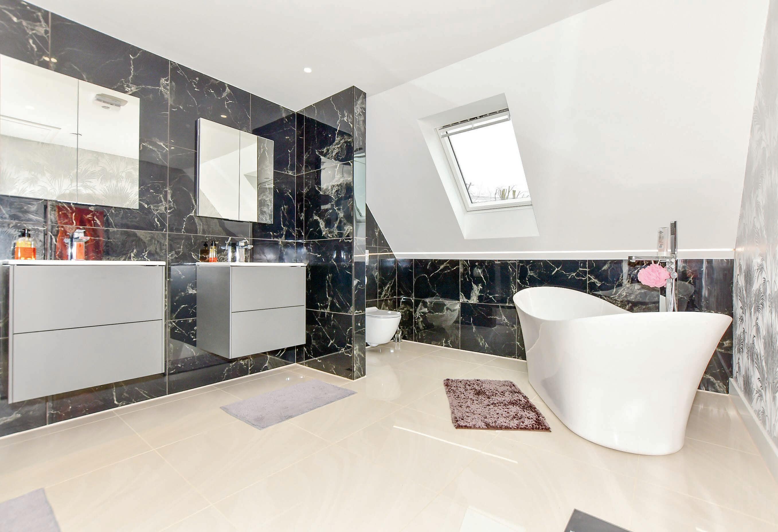 Much of the house includes mood lighting and this is well in evidence on the lovely oak staircase with its walnut staining. The spacious landing leads to a door to the second floor and to a trendy double shower that serves two double bedrooms with built in wardrobes. There is also a large dual aspect double bedroom with a wall of built in cupboards that include access to a discreetly hidden en suite bathroom with a lovely stand alone bath and separate double shower.